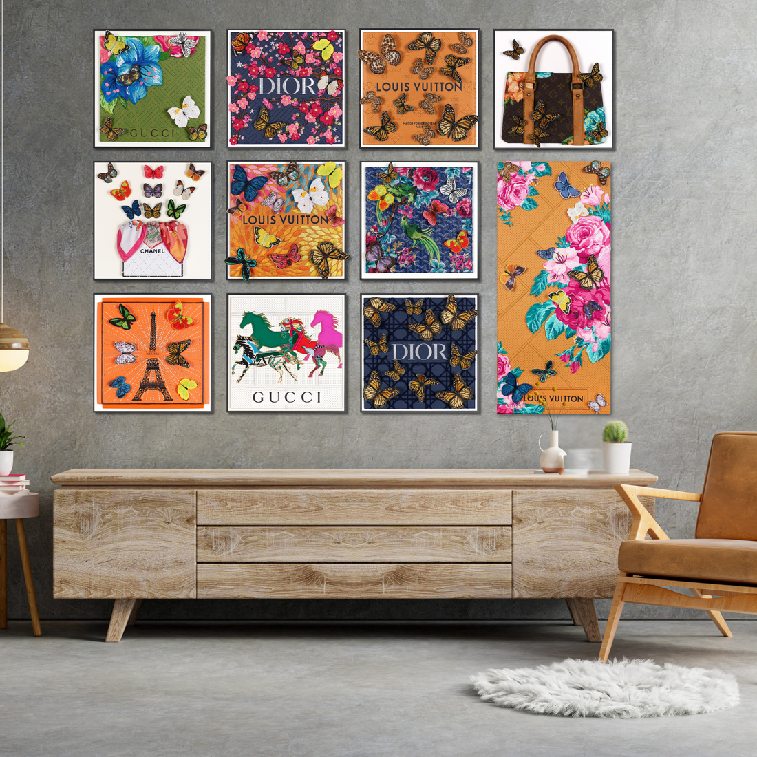 Stephen Wilson creates one-of-a-kind textile artworks using sustainable, up-cycled luxury materials. Vintage fabrics, bags, and boxes are carefully deconstructed and transformed into the canvas for each piece, then brought to life through richly textured embroidery stitched directly into the surface. Every appliqué, patch, and butterfly is hand-stitched, cut, cleaned, and placed with intention—making each work truly unique. Designed to be displayed together as a gallery wall or enjoyed on its own, every piece carries its own story while belonging to a larger collection.