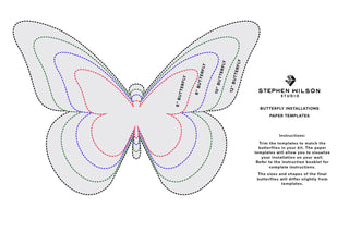 If you are not sure how many butterflies you will need for your installation we have a template kit now available. You will receive 50 sheets that you can cut out and add to your space. They will give you the perfect sense of scale and how many you will need. The cost of the template kit is $25.00. The price includes shipping and is refunded on your butterfly swarm order.