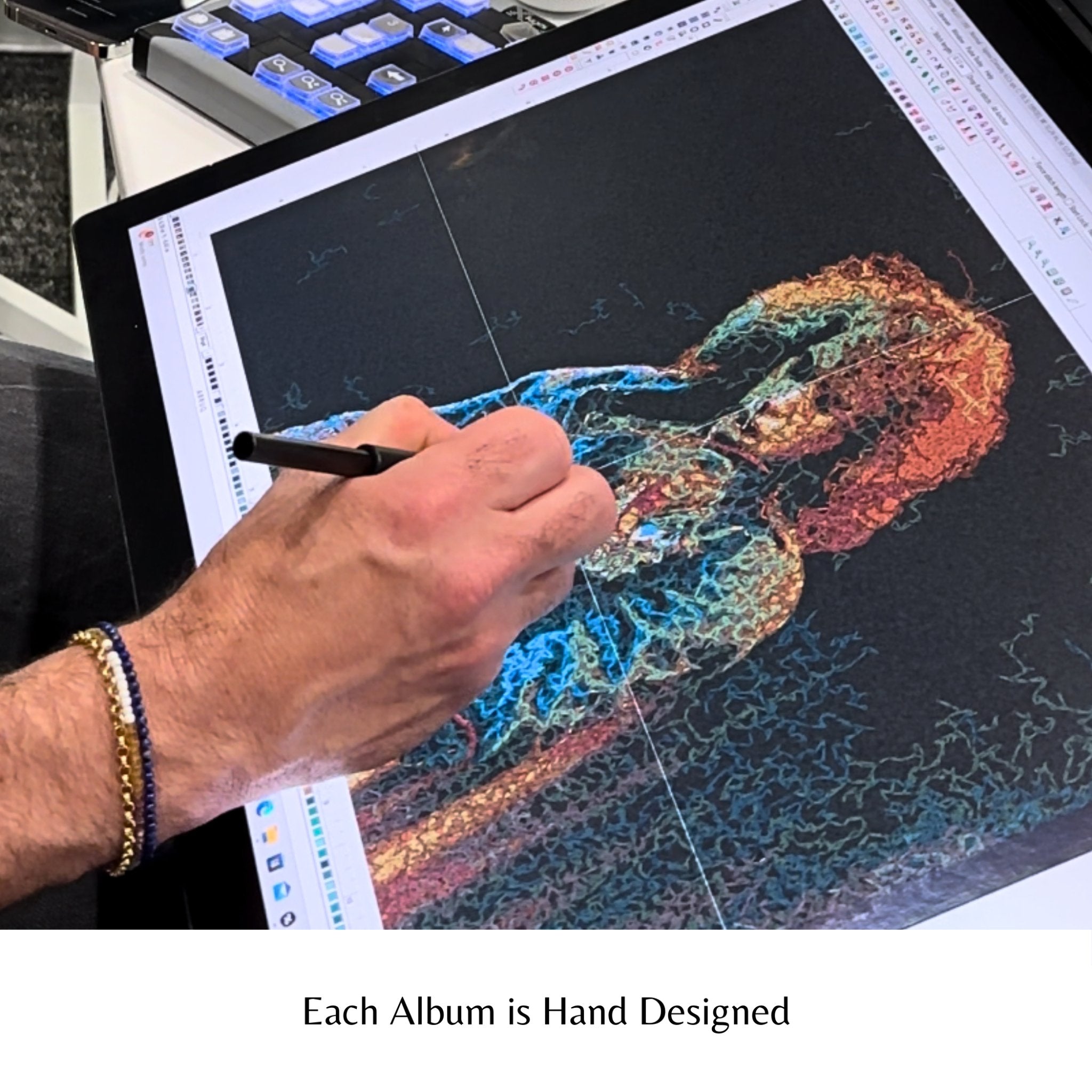 The album series begins with a vintage album sleeve, which serves as the foundation for intricate designs created with a variety of techniques such as yarn embroidery and photorealistic embroidery. Each album is carefully embroidered with over 200,000 stitches, taking more than 8 hours to complete. Upon completion, the album is adorned with embroidered patches and other decorative objects, making each one truly unique. With over 300 albums in the collection, they make for an exquisite gallery wall, showcasing your love for art and music.
