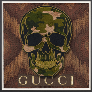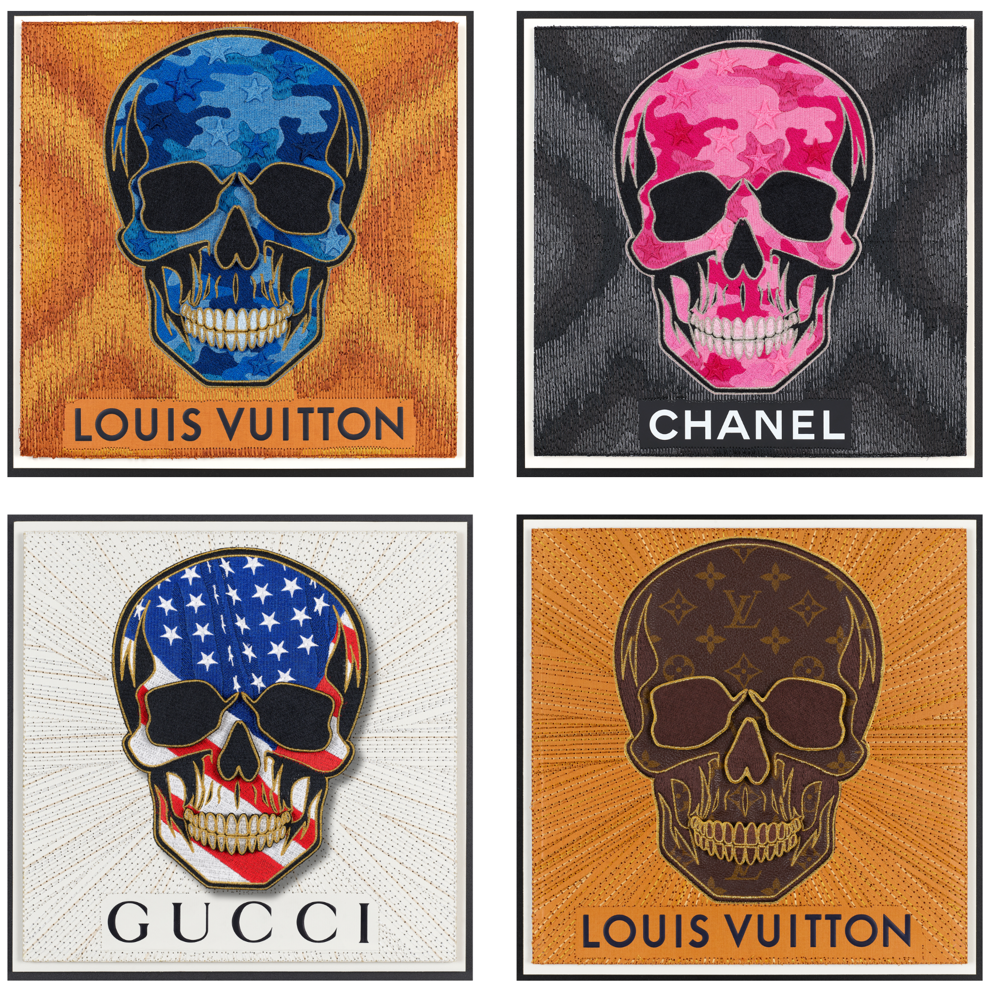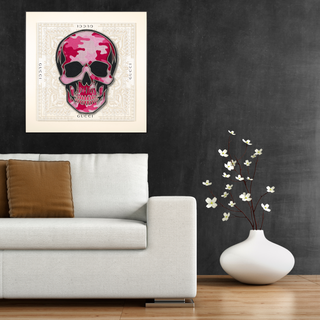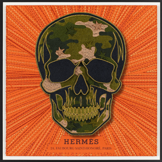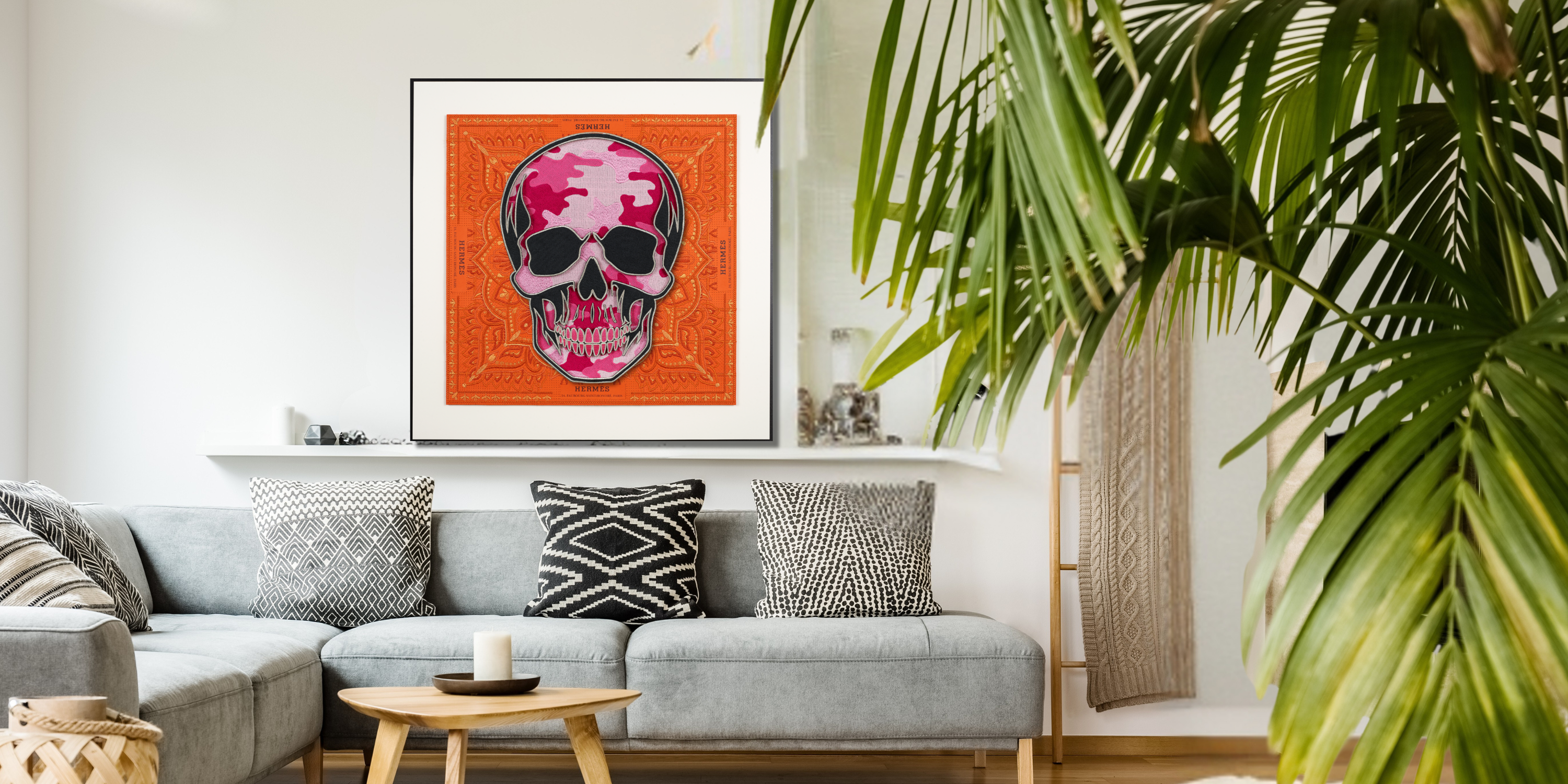 This piece features a skull set against a range of compelling backgrounds—camouflage patterns, flags, rich tapestries, and delicate silk scarves—each chosen to evoke contemplation on the interplay of life’s fragility and resilience.
