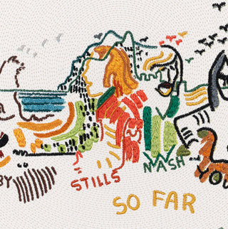 I spent months sourcing vintage record albums and created dozens of prototypes before finally designing these pieces. I hand-selected each album then set out to embroider them. To make the art, each thread must be hand-digitized using digital drawing tools on a scan of the actual album as a backdrop. Every stitch is drawn by hand, one at a time. The embroidery process itself is the most interesting and has to be seen to believe. Each album cover is embroidered directly through the actual paper sleeve.