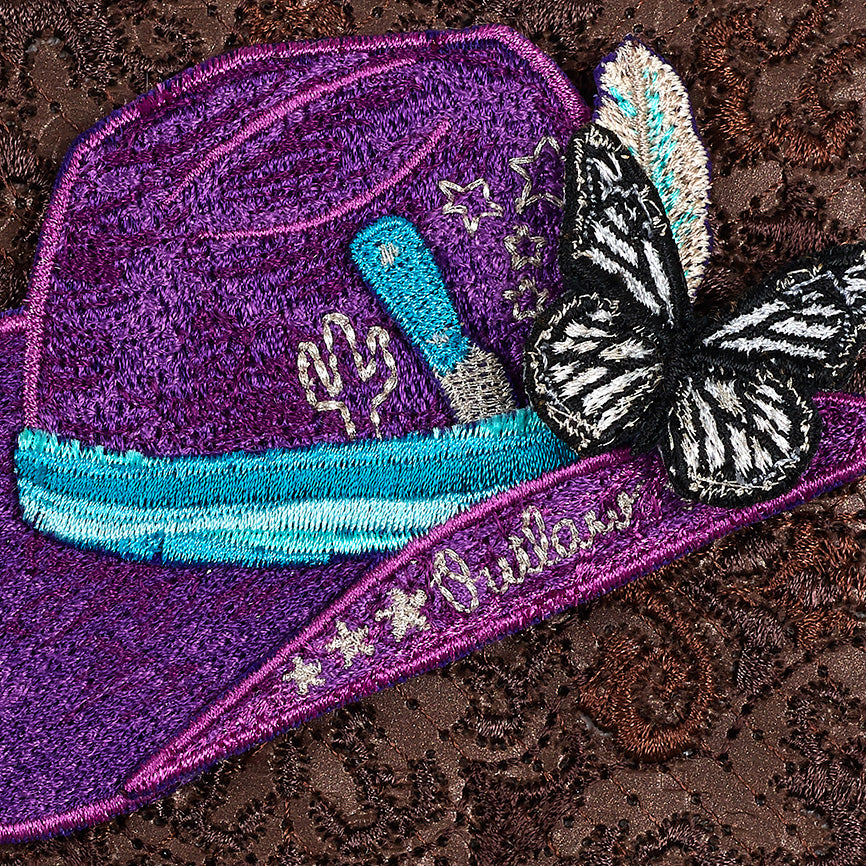Western designs have always been part of the Studio vibe. The landscapes and iconography of cowboys, horses and Americana have been an inspiration since Stephen created his Americana series in 2018. The petites feature icons, horses, cacti and many other symbols created with yarn, embroidery and appliqué. The pieces all start with up-cycled luxury boxes or shopping bags that are trimmed into the background shape, collaged and then embroidered. The embroidery is stitched directly through the actual box itself. Each petite features intricate embroidery stitches that truly make each one unique. The western icons are then added in relief on the background truly making a three dimensional piece.
