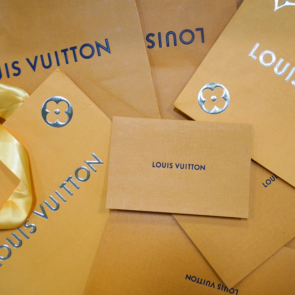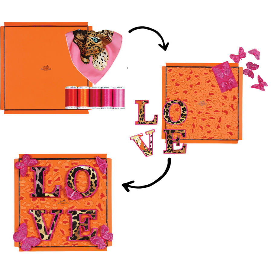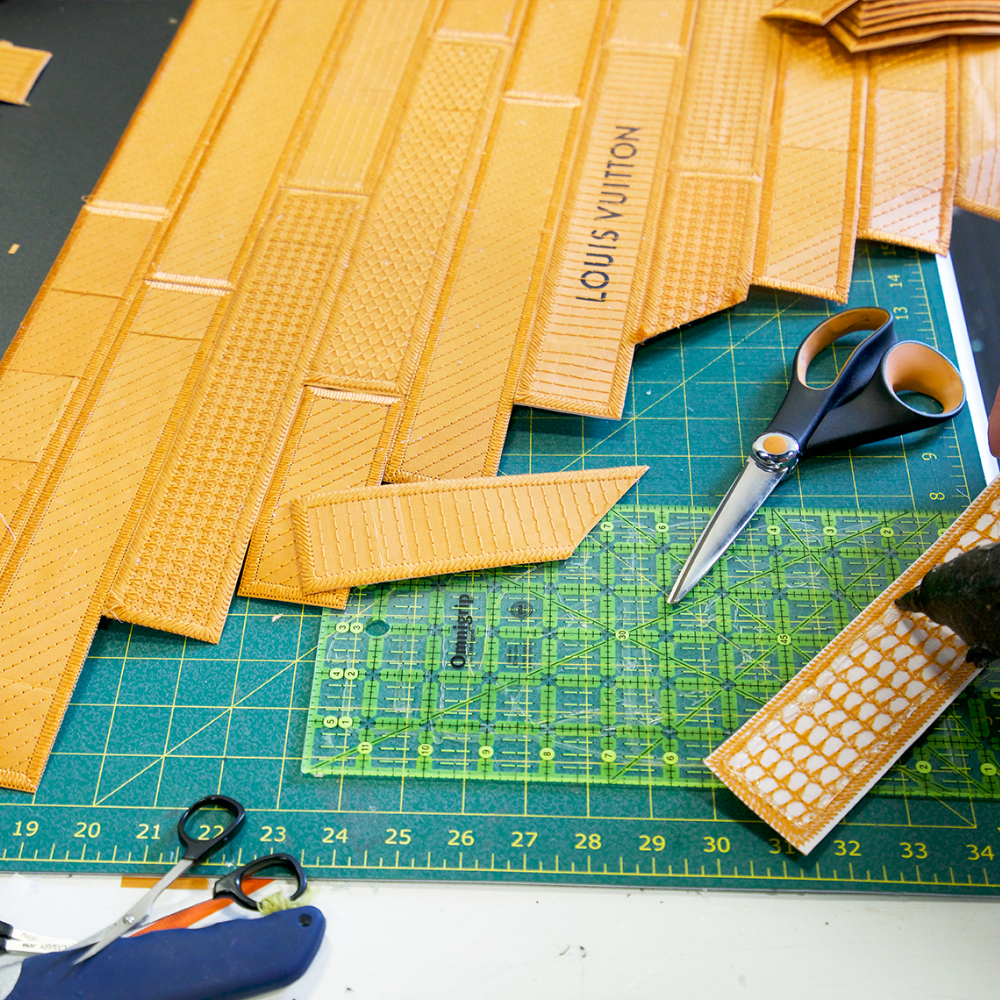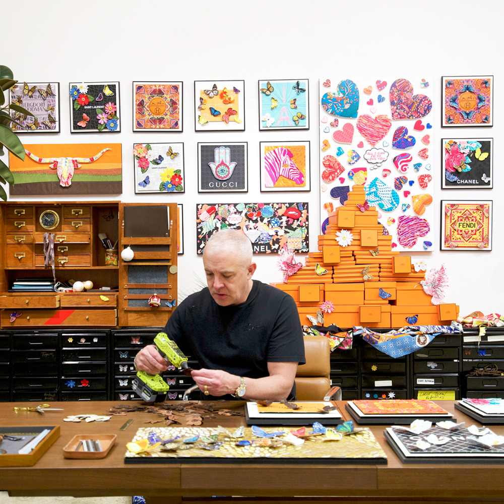 The most common question Stephen gets is, “Where do you find all these boxes?” Luxury brand products come in beautifully crafted packaging, often discarded or stored away. Stephen repurposes these materials into art, carefully selecting each box or bag from sources worldwide—donations from clients and friends, auctions, estate sales, and more. All fabrics used are also luxury items, like scarves, clothing, or packaging. He spends time daily sourcing these unique materials for his work.