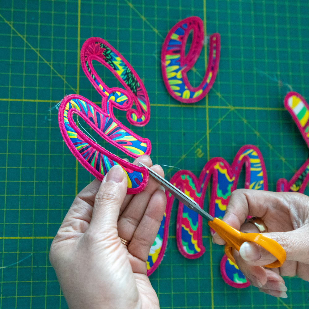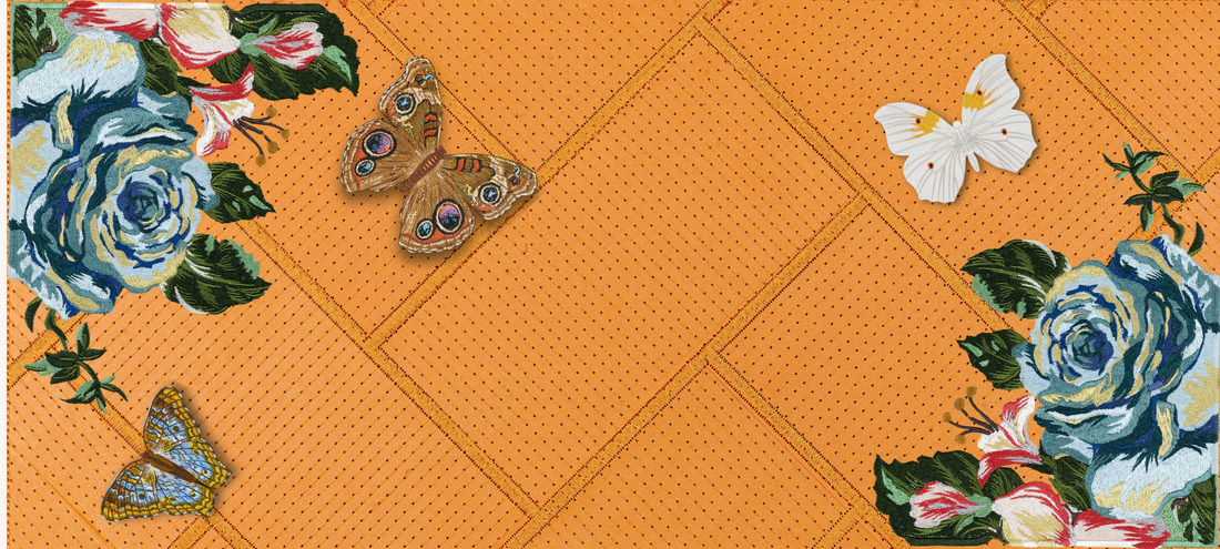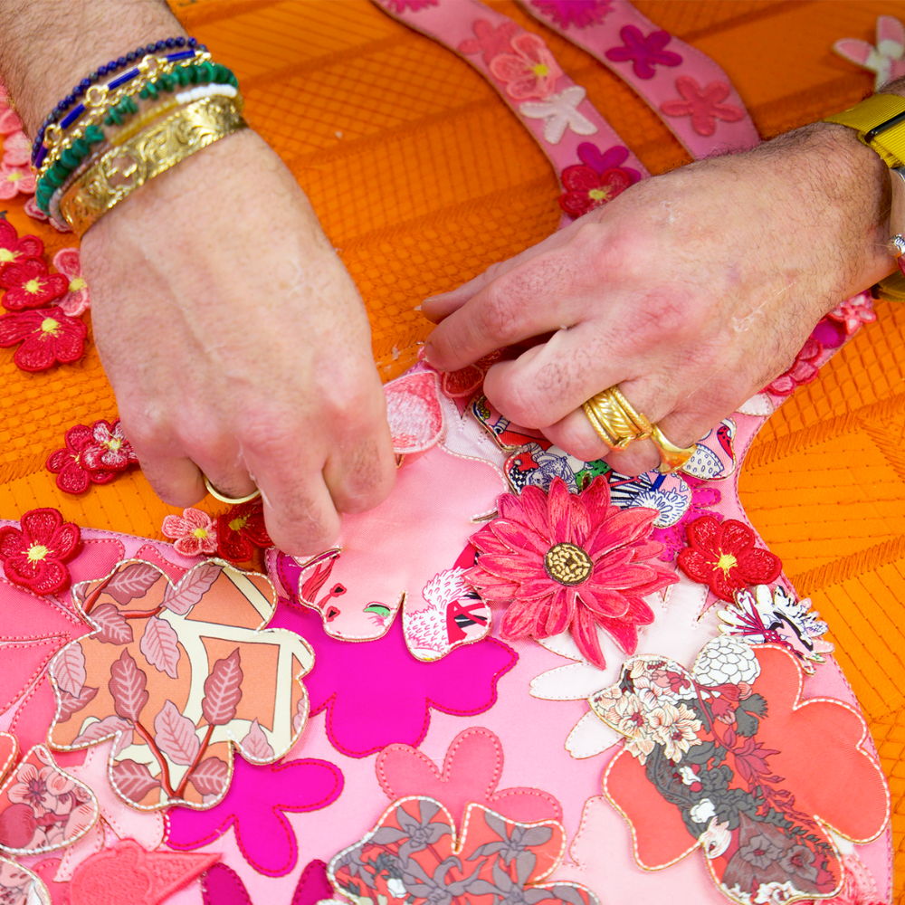Once the pieces come off of the the embroidery machine it is moved into finishing and meticulously hand trimmed. Each butterfly and embroidered element is hand trimmed with skill, patience and a very sharp pair of scissors. Each pom-pom is perfectly hand rolled using remnants of luxury scarves, ensuring every part of the luxury materials are used and not wasted. Every piece is full of amazing intricate detail.