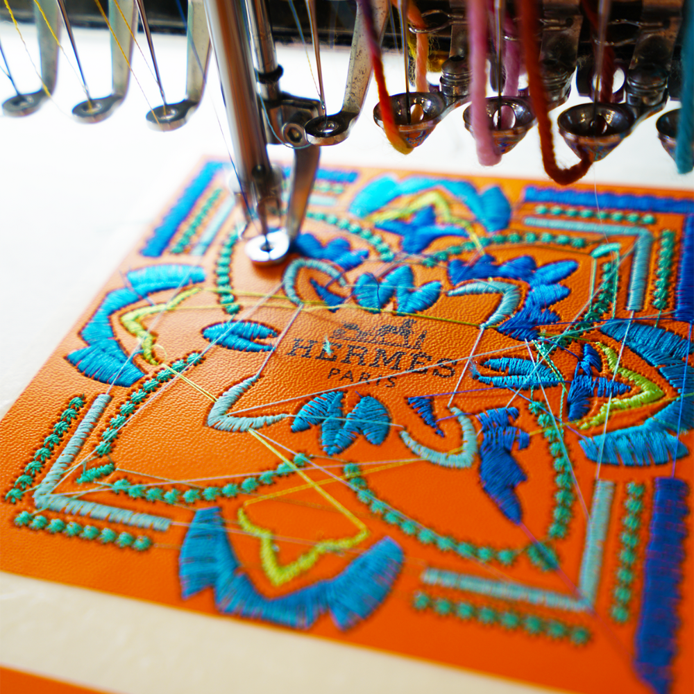 Some of Stephen’s favorite pieces are the ones that use very unique up-cycling techniques. Often the process consists of utilizing what some would view as disposable materials. He takes the scraps and restores them to their once luxurious status by making them into art. Each art piece begins with an up-cycled luxury bag, box, silk scarf or handbag. He then digitizes a custom embroidery design by hand, layering in each stitch individually. The boxes and bags are deconstructed, becoming the canvas for his creations. The embroidery then goes directly through his chosen medium and the visible texture begins to bring the piece to life.