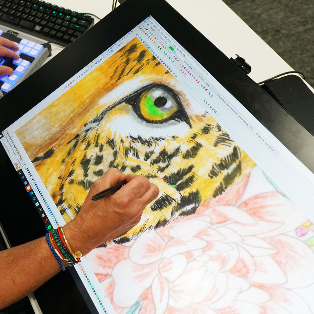 Stephen brings the image of choice into his digital drafting system and hand traces all of the stitches using the image of the canvas as his guide. He masterfully engineers the stitches allowing beautiful patterns and designs to emerge as a decorative background for the final piece. Most of the small works have over 50,000 stitches while the large pieces can easily require 1,000,000 stitches or more.