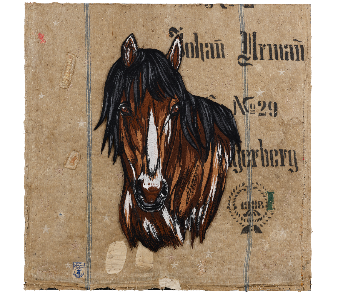 Let's begin with the fabric—each background is a one-of-a-kind relic, carefully sourced for its history and character. These textiles are meticulously quilted and embroidered from feed bags that have journeyed through nearly a century. Their surfaces bear the rich patina of age; wear, repairs, and mends—testaments to decades of authentic use—add depth and authenticity. The stitches that mend these fabrics are themselves historical, likely spanning over fifty years, weaving a silent narrative of resilience