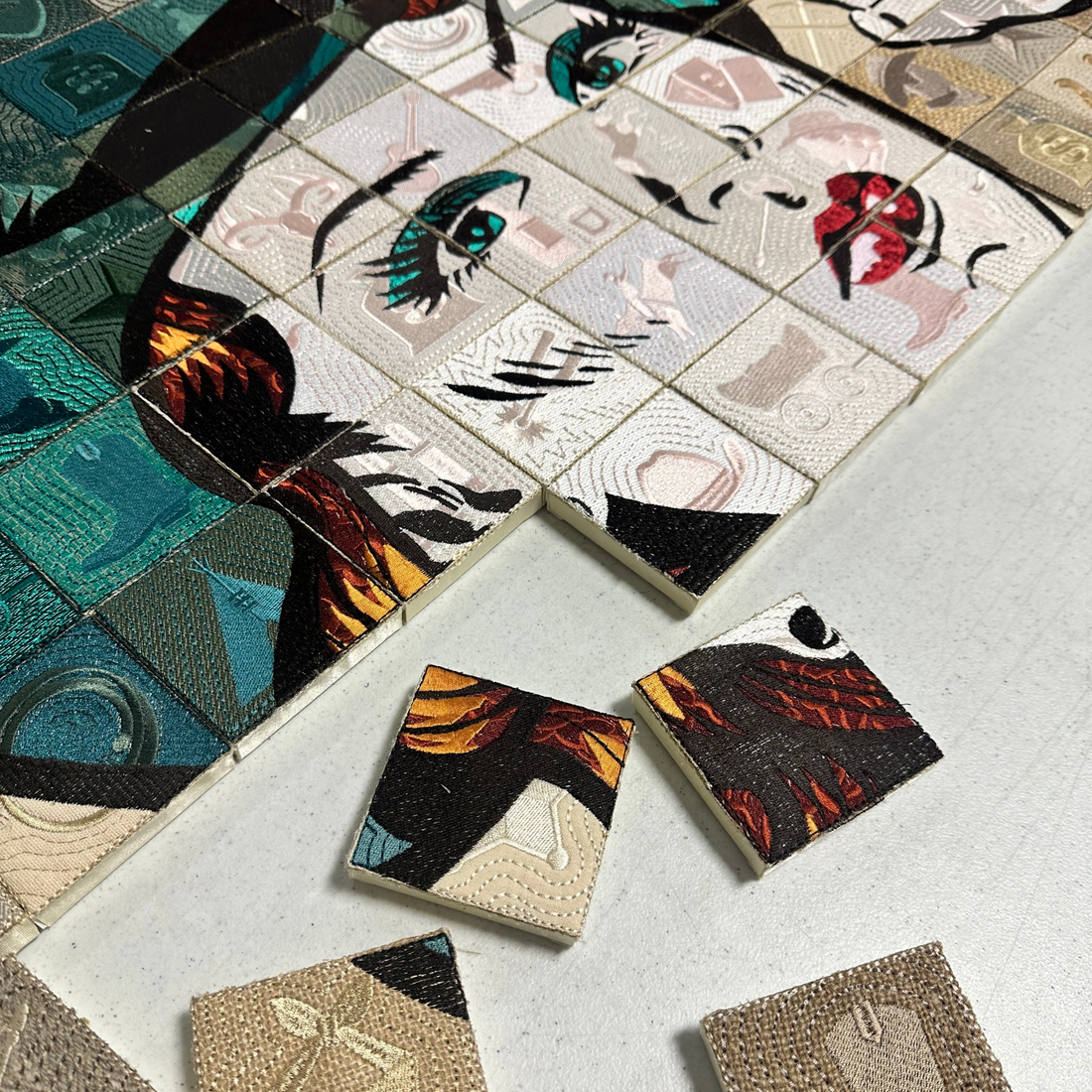 Regarding the designs, I approach each artwork as if it were a portrait—capturing spirit and character with careful precision. Currently, I am working on a commanding horse piece and a striking new bull, both destined to be stunning once complete. Each stitch is thoughtfully placed, guided by digital drafting tools that ensure precision. Threads are meticulously chosen for each phase, and the embroidery process can encompass up to a million stitches—taking around 30 hours for each portrait.