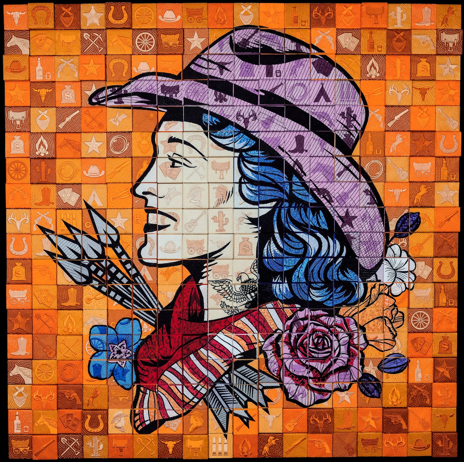 The tattoos and hair color obviously represent diversity and power, and the ability of today’s women to choose different looks and represent themselves however they wish. The technique used to create these designs was anything but simple. The images were drawn using digital drafting tools, then a grid was placed over the image with each block individually created using a Western icon, along with the element of the design that corresponds with the tile. Each Cowgirl has 324 individual blocks that, when combined, create a beautiful, powerful image. Each of the blocks are mounted at varying heights to give the piece even more depth and dimension. A favorite aspect of this series is how they seemingly change the closer you get to them: as you draw nearer, the individual pieces and icons hidden throughout the design become more noticeable.