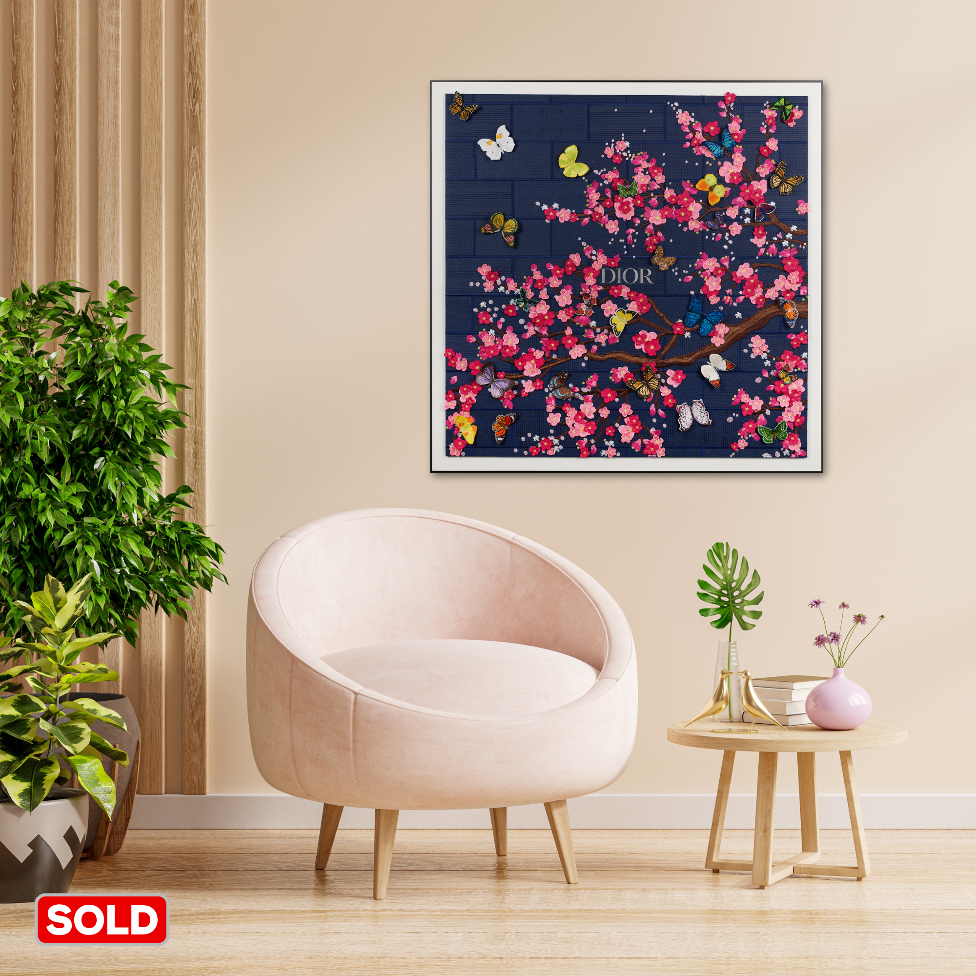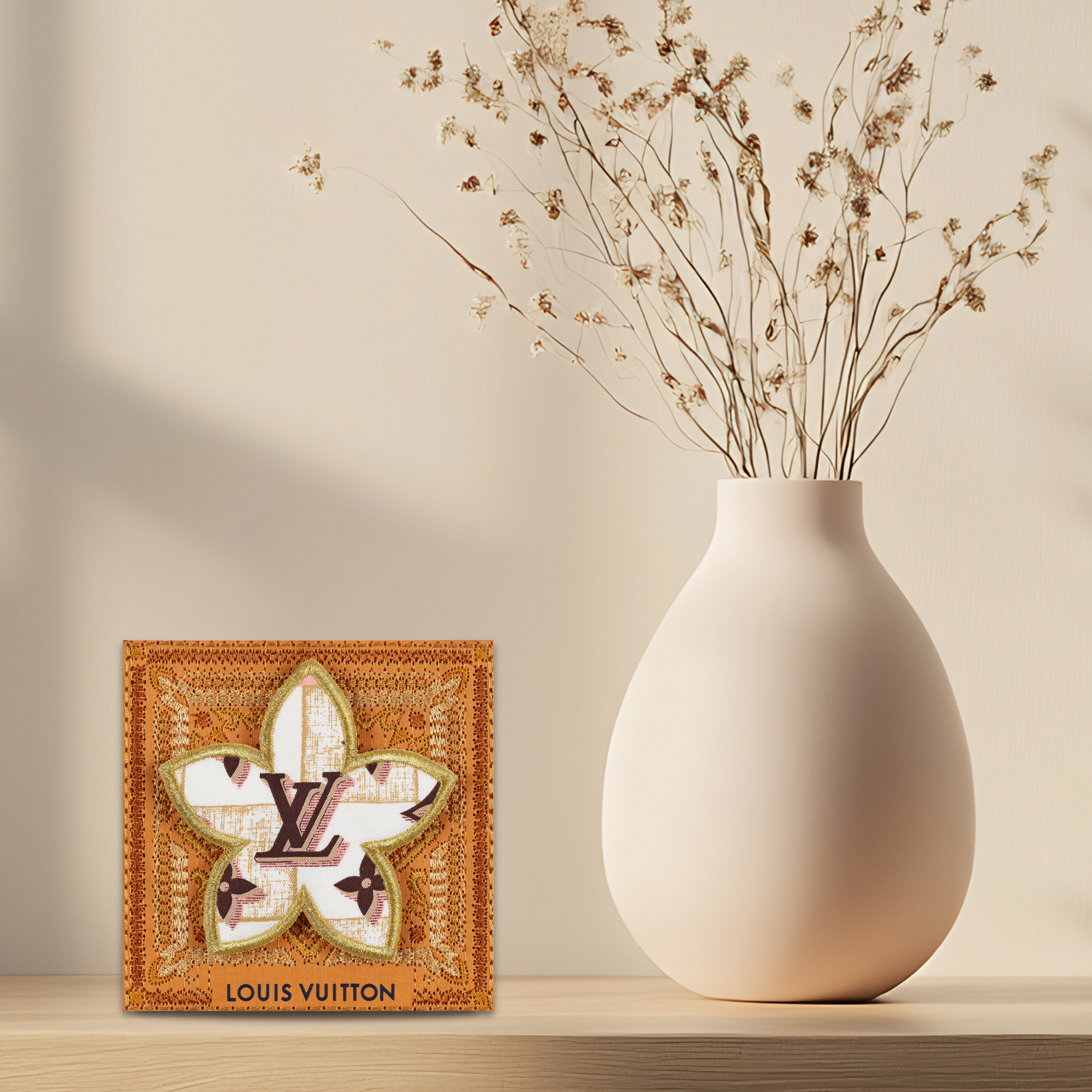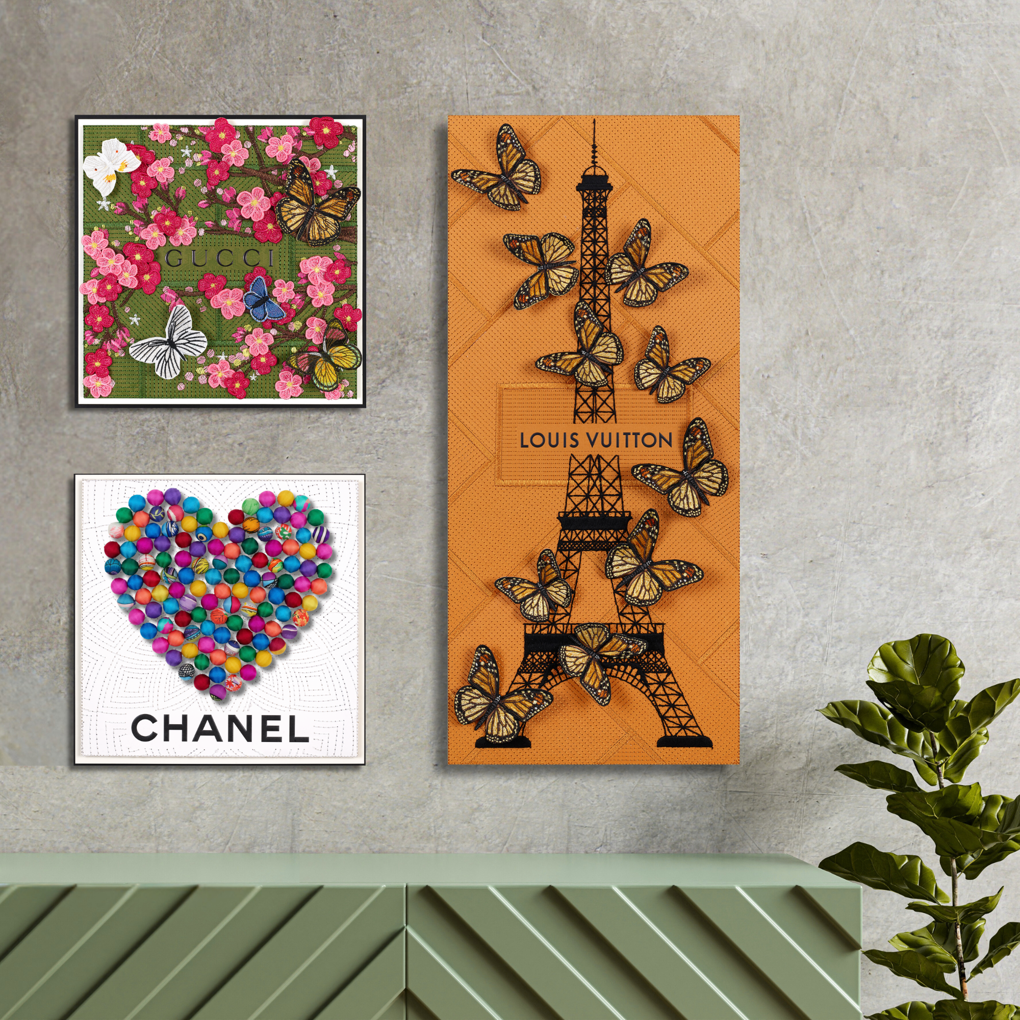 Stephen Wilson uses sustainable materials to create unique and everlasting designs. Each art piece begins with an up-cycled luxury bag, box, silk scarf, or handbag. Wilson then digitizes a custom embroidery design by hand, layering in each stitch individually. Once the design, colors, and elements are decided, the piece moves on to the design stages. The boxes and bags are deconstructed, becoming the canvas for his creations. The embroidery then goes directly through his chosen medium and the visible texture begins to bring the piece to life. Appliqués, patches and butterflies are all stitched out individually. They are then cut, cleaned, and placed on each piece, creating a unique, one-of-a-kind work of art. The unique artworks are designed to be hung together to create a gallery wall or hung individually.