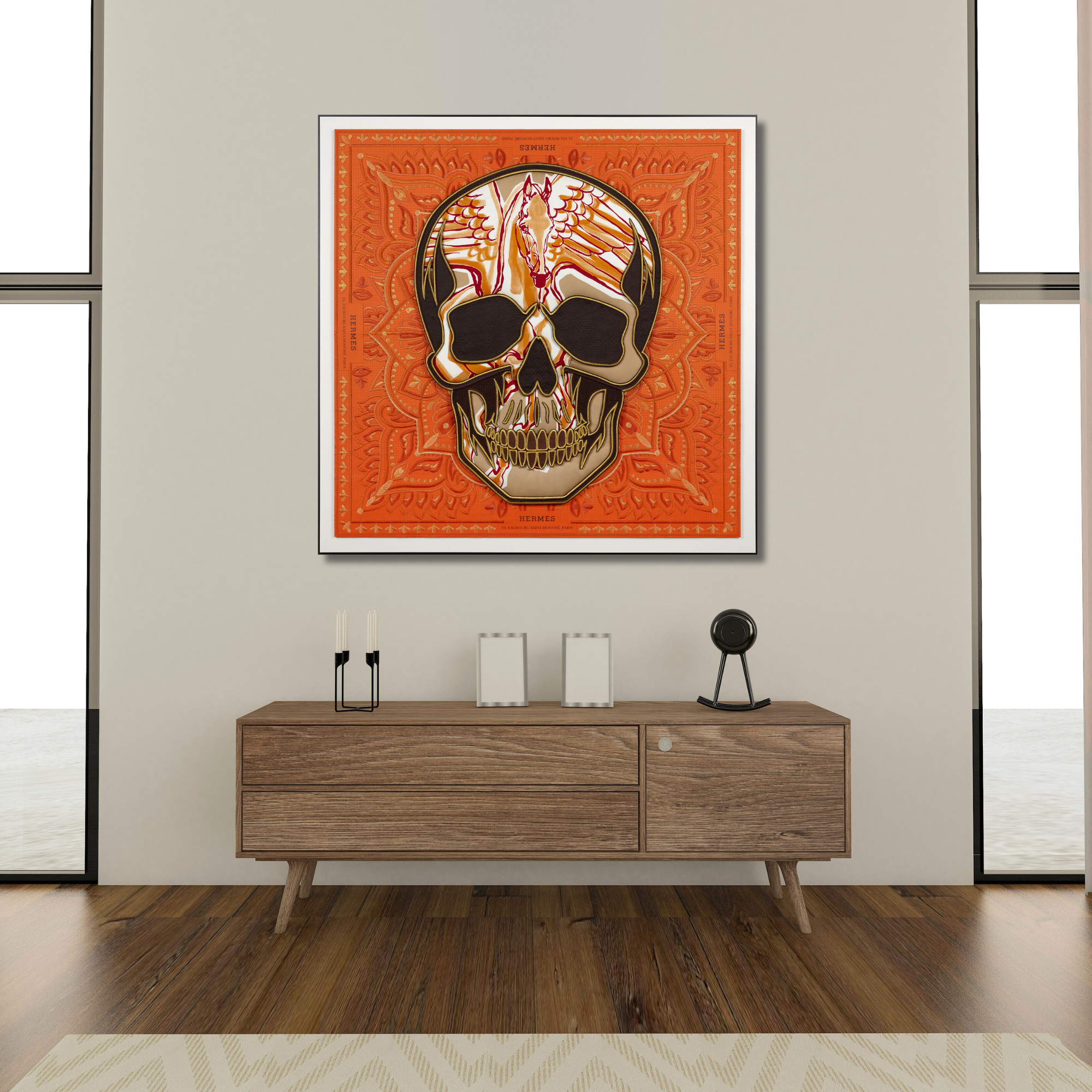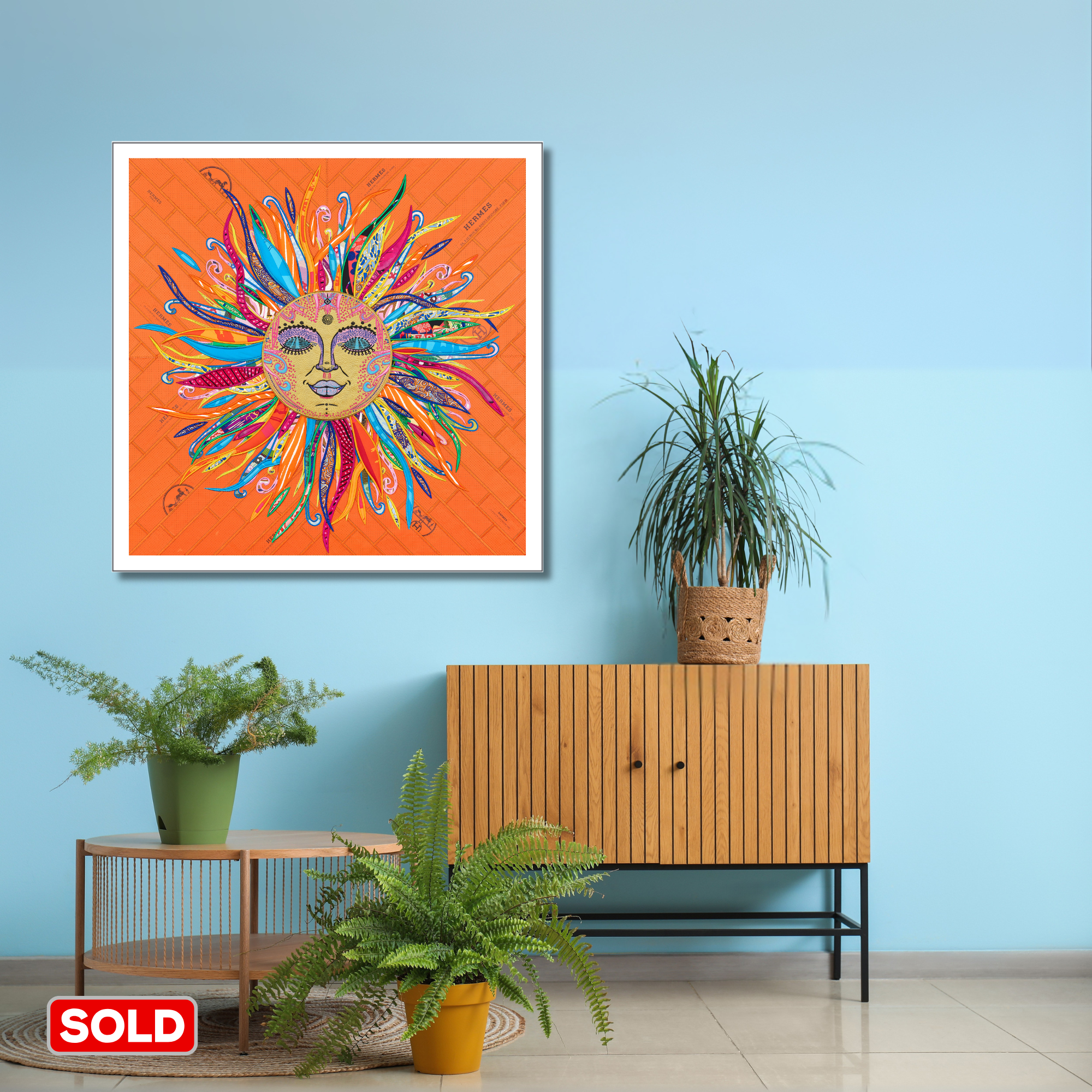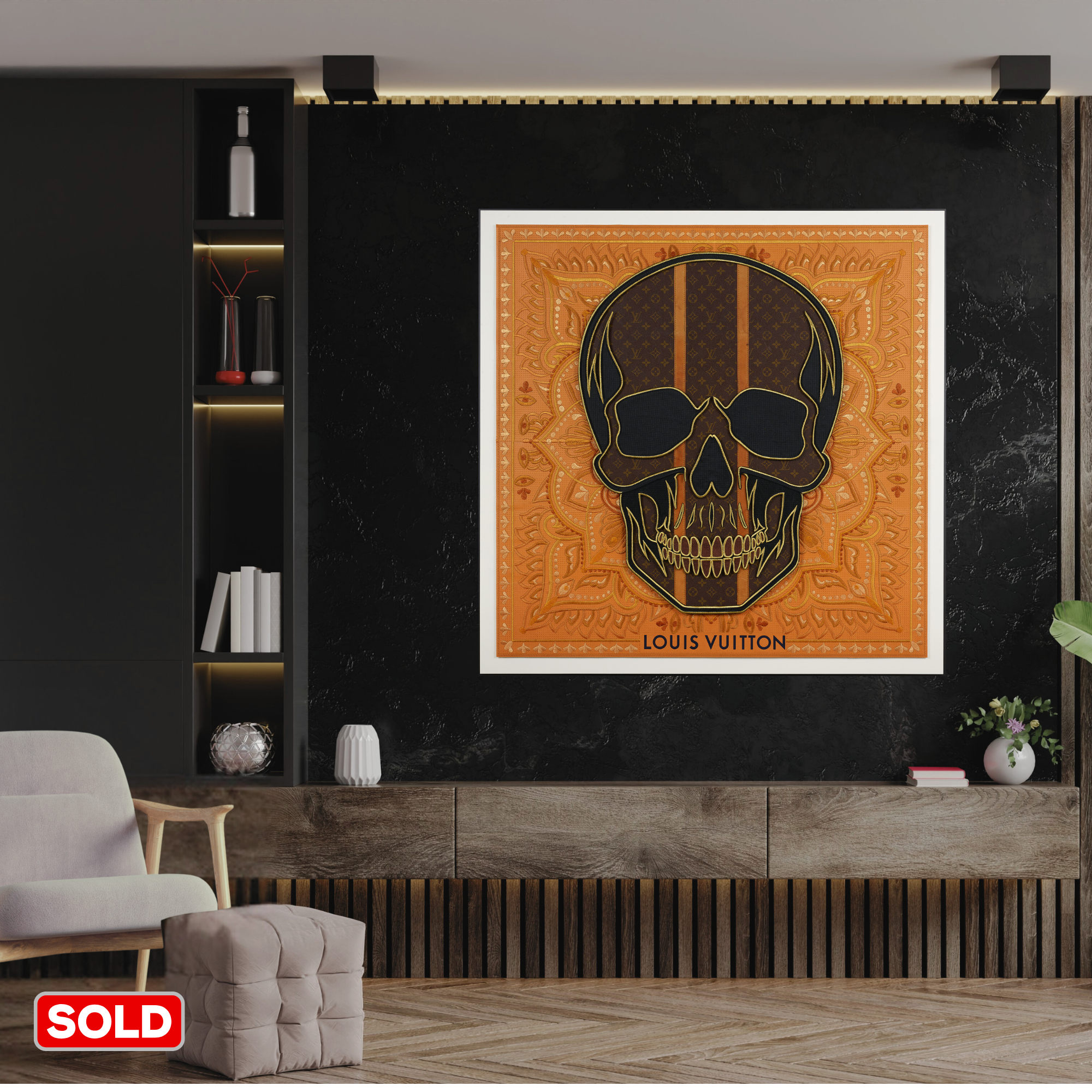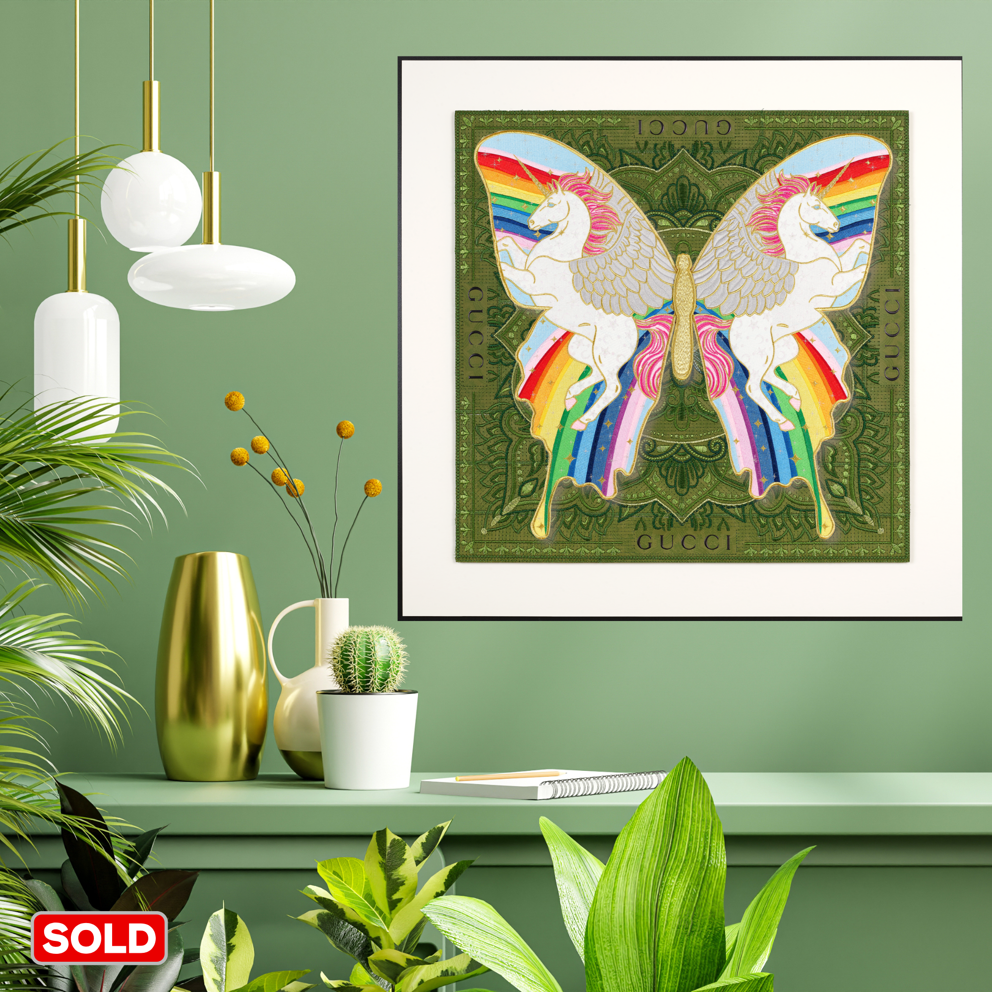 Stephen Wilson uses sustainable materials to create unique and everlasting designs. Each art piece begins with an up-cycled luxury bag, box, silk scarf, or handbag. Wilson then digitizes a custom embroidery design by hand, layering in each stitch individually. Once the design, colors, and elements are decided, the piece moves on to the design stages. The boxes and bags are deconstructed, becoming the canvas for his creations. The embroidery then goes directly through his chosen medium and the visible texture begins to bring the piece to life. Appliqués, patches and butterflies are all stitched out individually. They are then cut, cleaned, and placed on each piece, creating a unique, one-of-a-kind work of art. The unique artworks are designed to be hung together to create a gallery wall or hung individually.