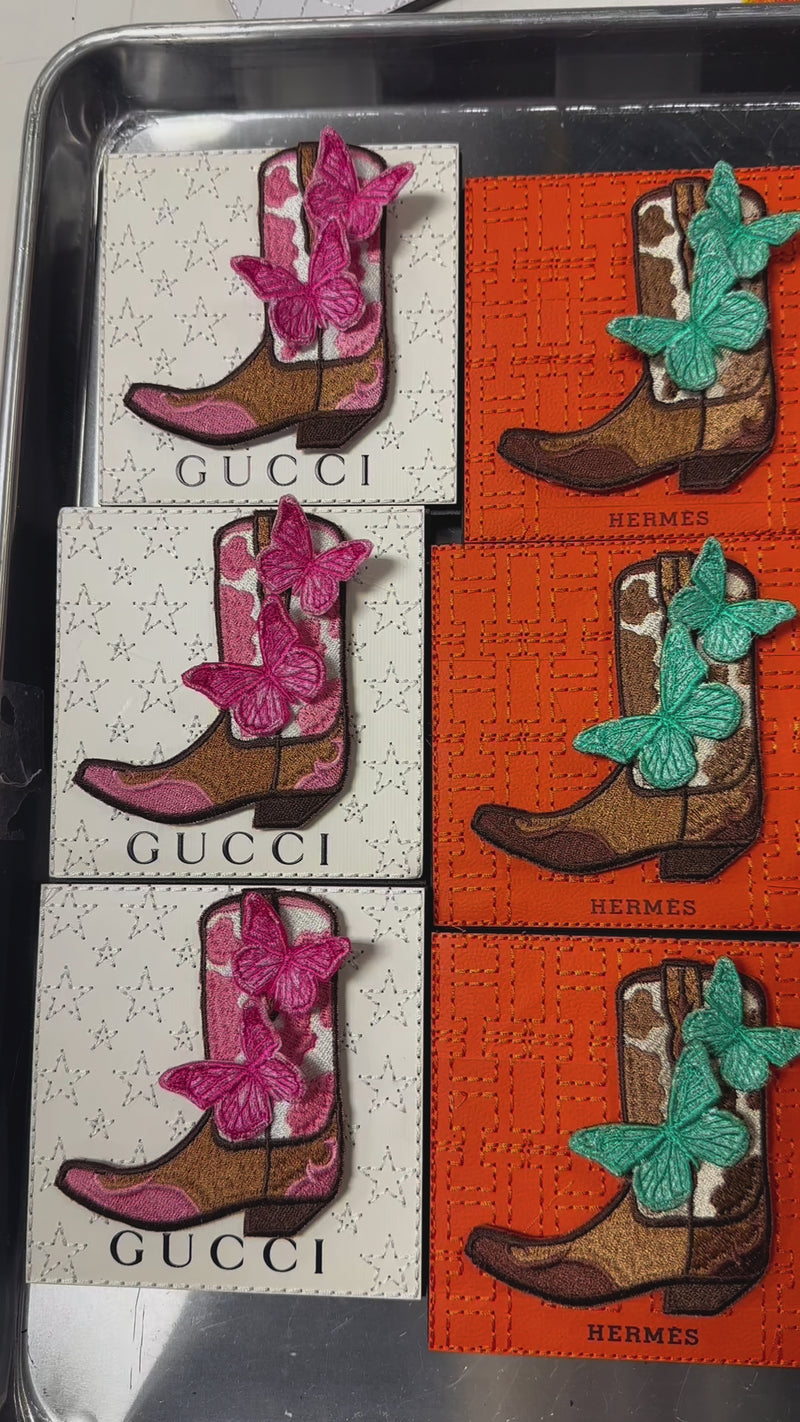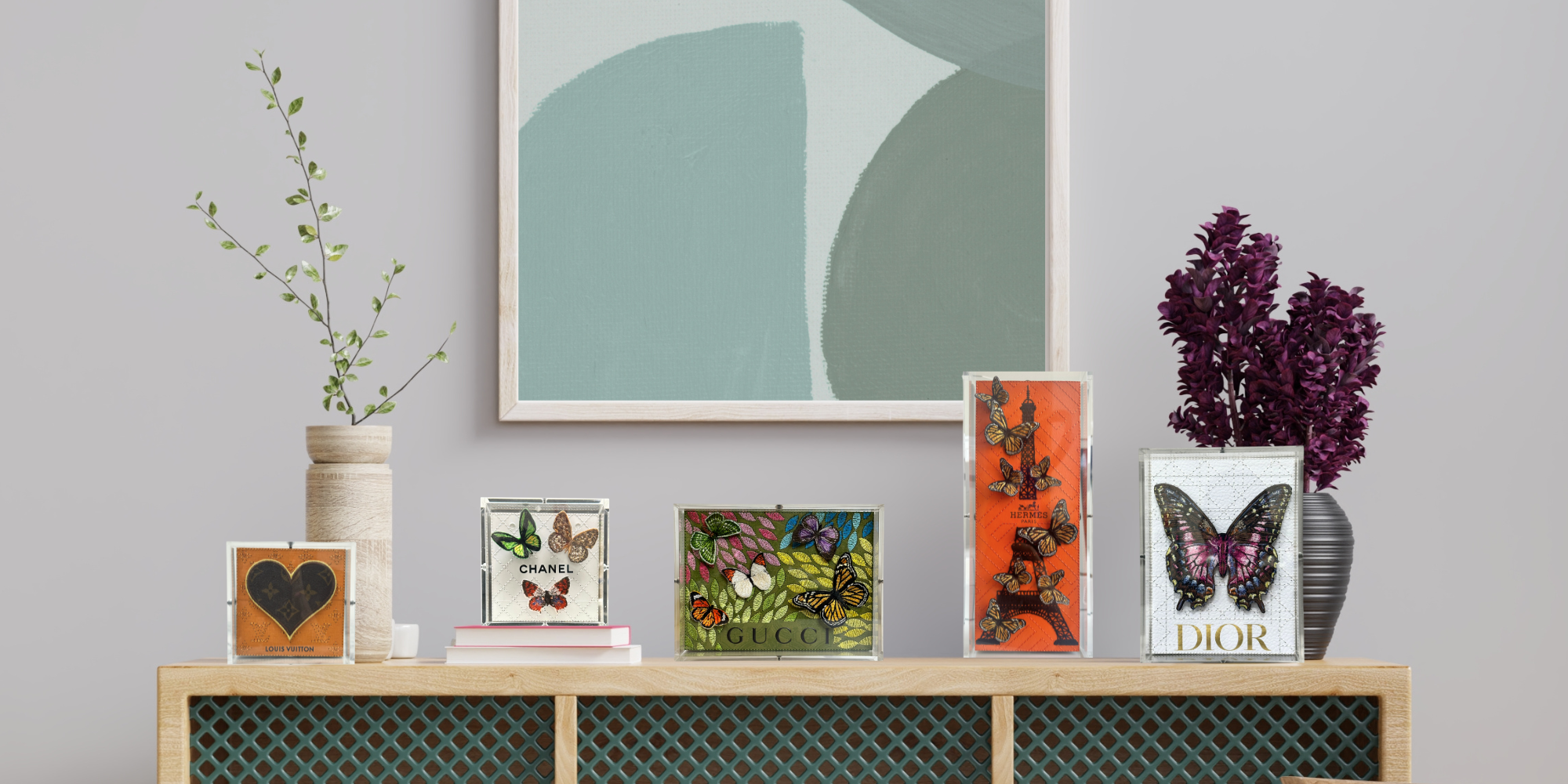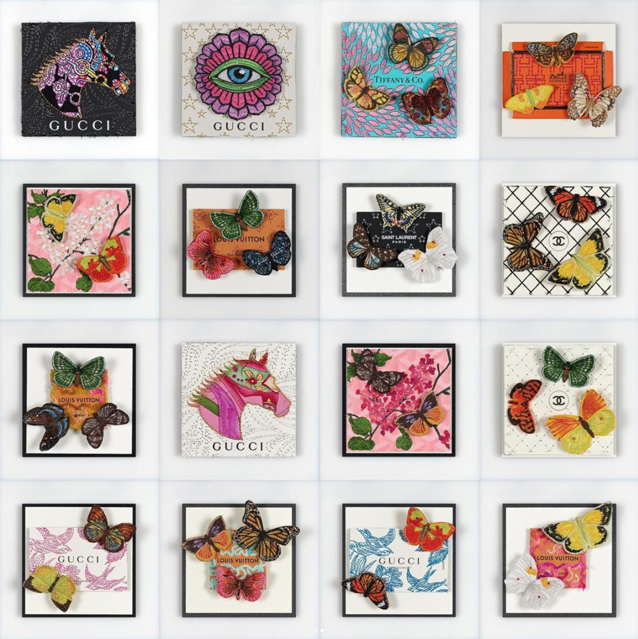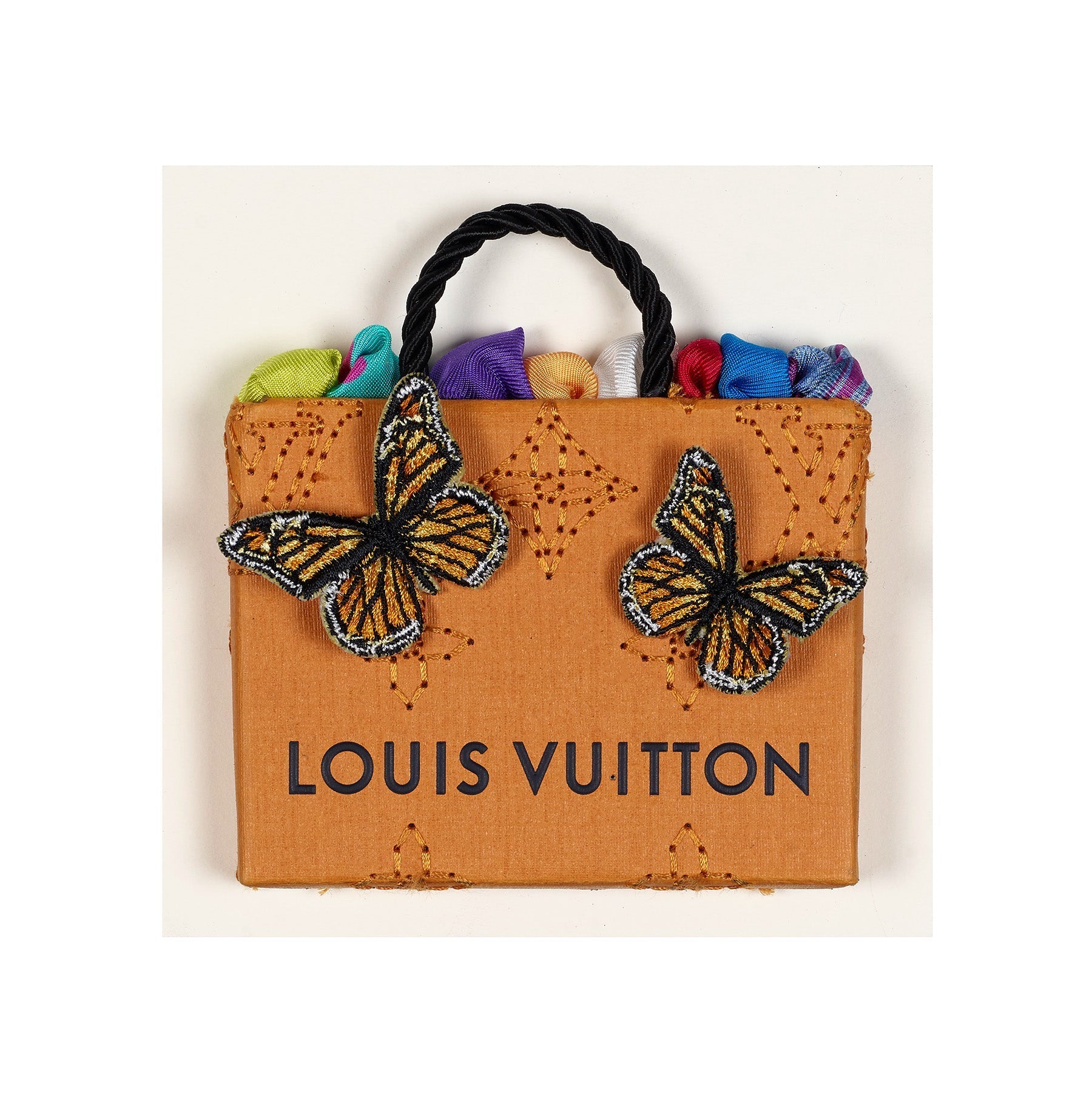 The petites rank among my top-selling series. Each petite showcases exquisite embroidery, which is meticulously stitched onto a luxury box, shopping bag, or scarf. The artwork is then framed and embellished with embroidered butterflies, lace flowers, appliqués, and other decorative elements. Every piece is one-of-a-kind and is presented in a sleek acrylic frame that can be displayed on a flat surface or hung on a wall with the included hardware. The finished pieces are available in two sizes: 5”x5”x2”, 12”x5”x2” or 8"x6"x2" and they arrive beautifully packaged in a padded gift box.