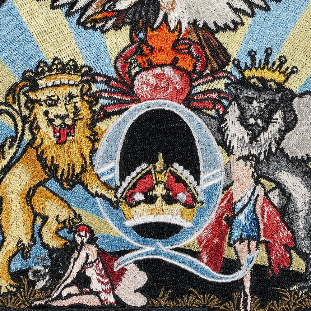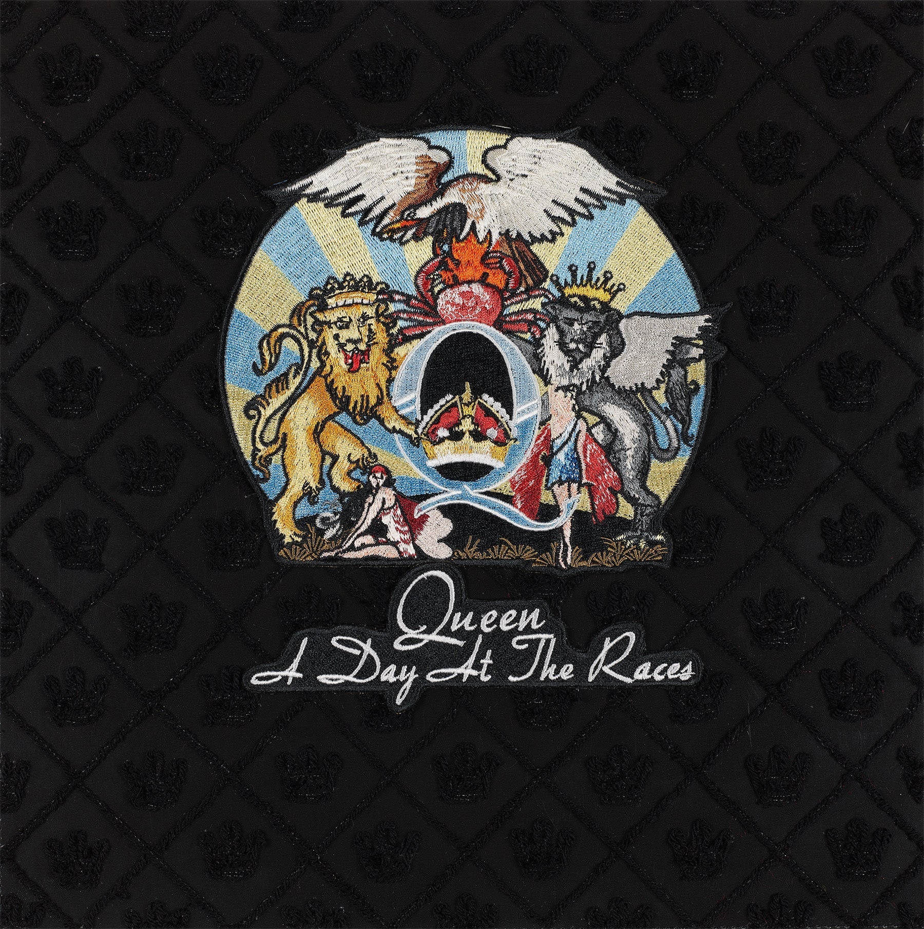 Queen’s album, A Day at the Races, was released following their hugely successful, A Night at the Opera. Both of those albums featured slightly different crests designed by the band, one on a black background and one on white. I had been debating which one to create first. However, a commission solved the dilemma for me and the work for A Day at the Races was begun. I started by creating a wallpaper background that consisted of geometric lines and crowns. I stitched the crowns in tonal black yarn to create a tufted raised effect. I then stitched the elaborate crest, which consists of lions, fairies, a crab and a phoenix as a patch. The crest alone has over 75,000 hand placed stitches in it. The crest and typography were mounted onto the album last.
