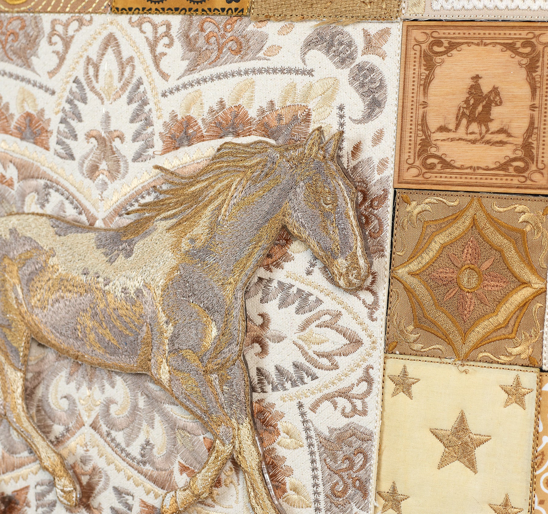 An exquisite blend of hand-digitized embroidery, collage and assemblage goes into each and every piece.