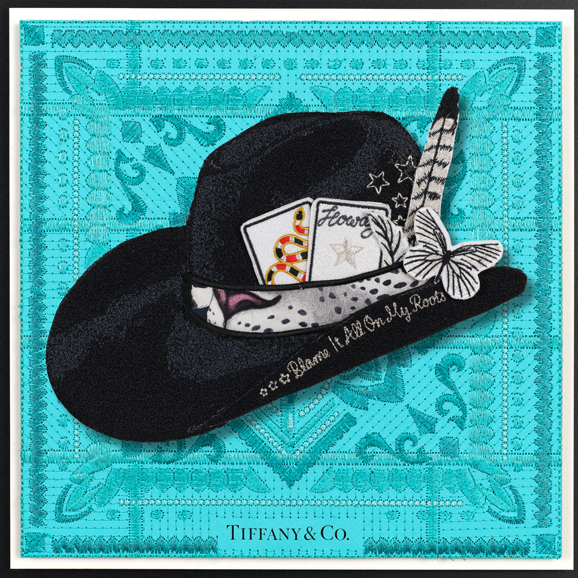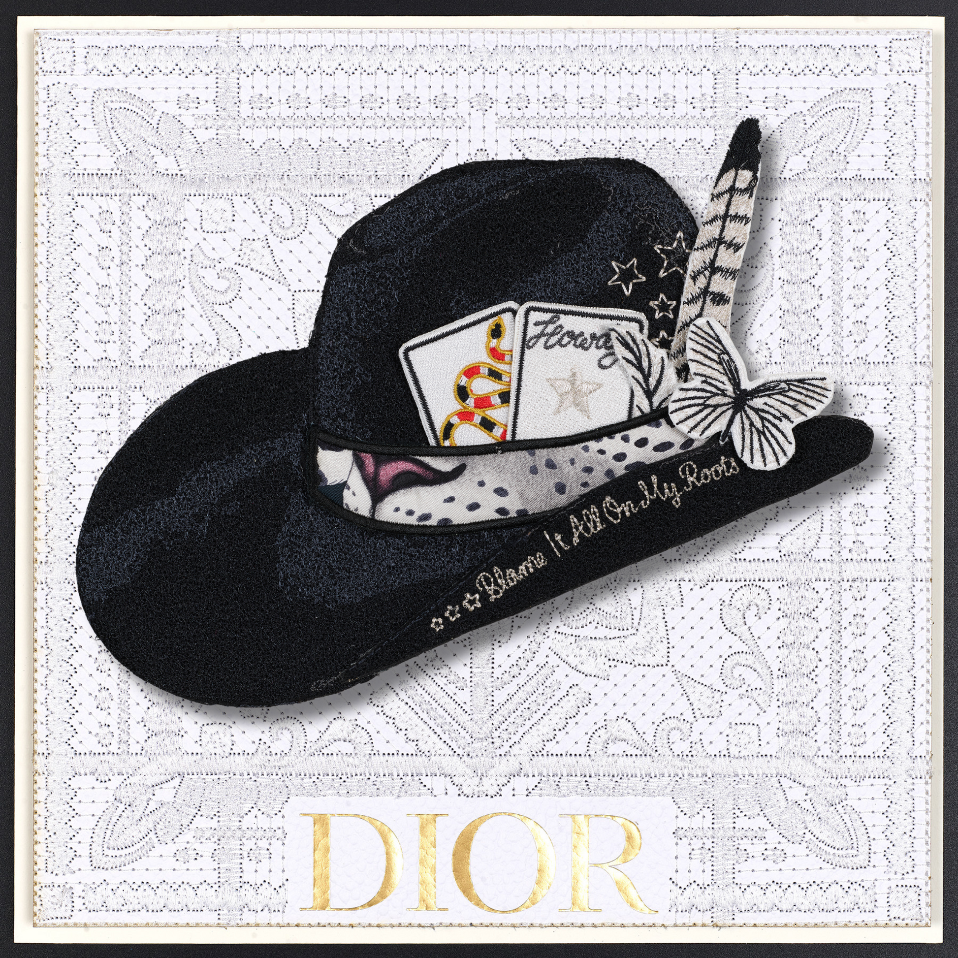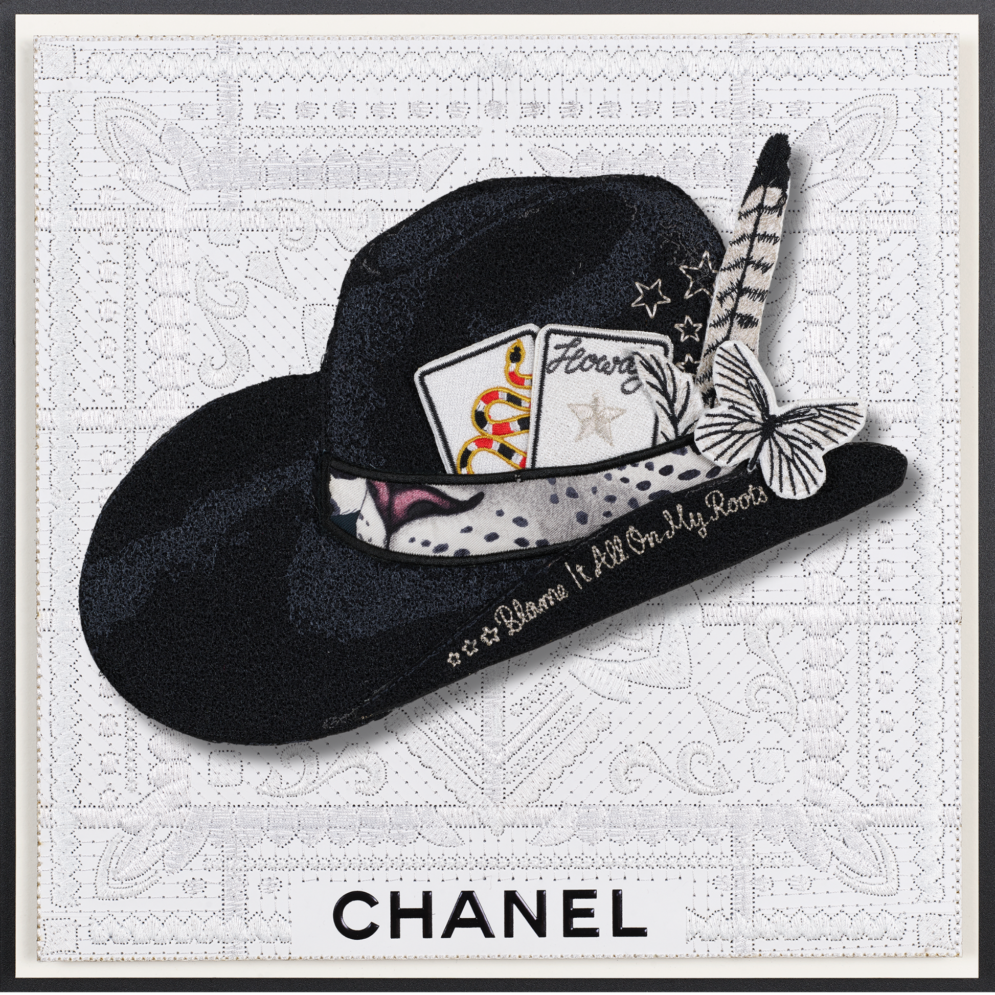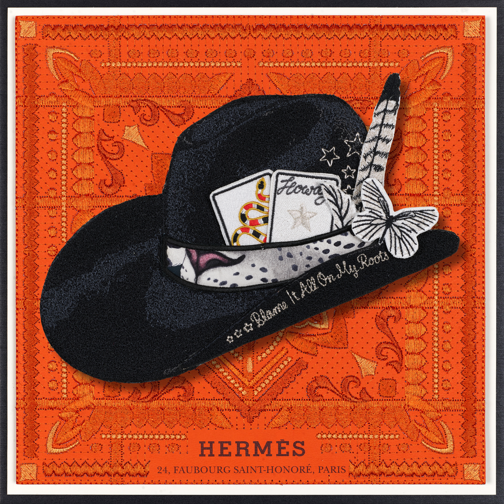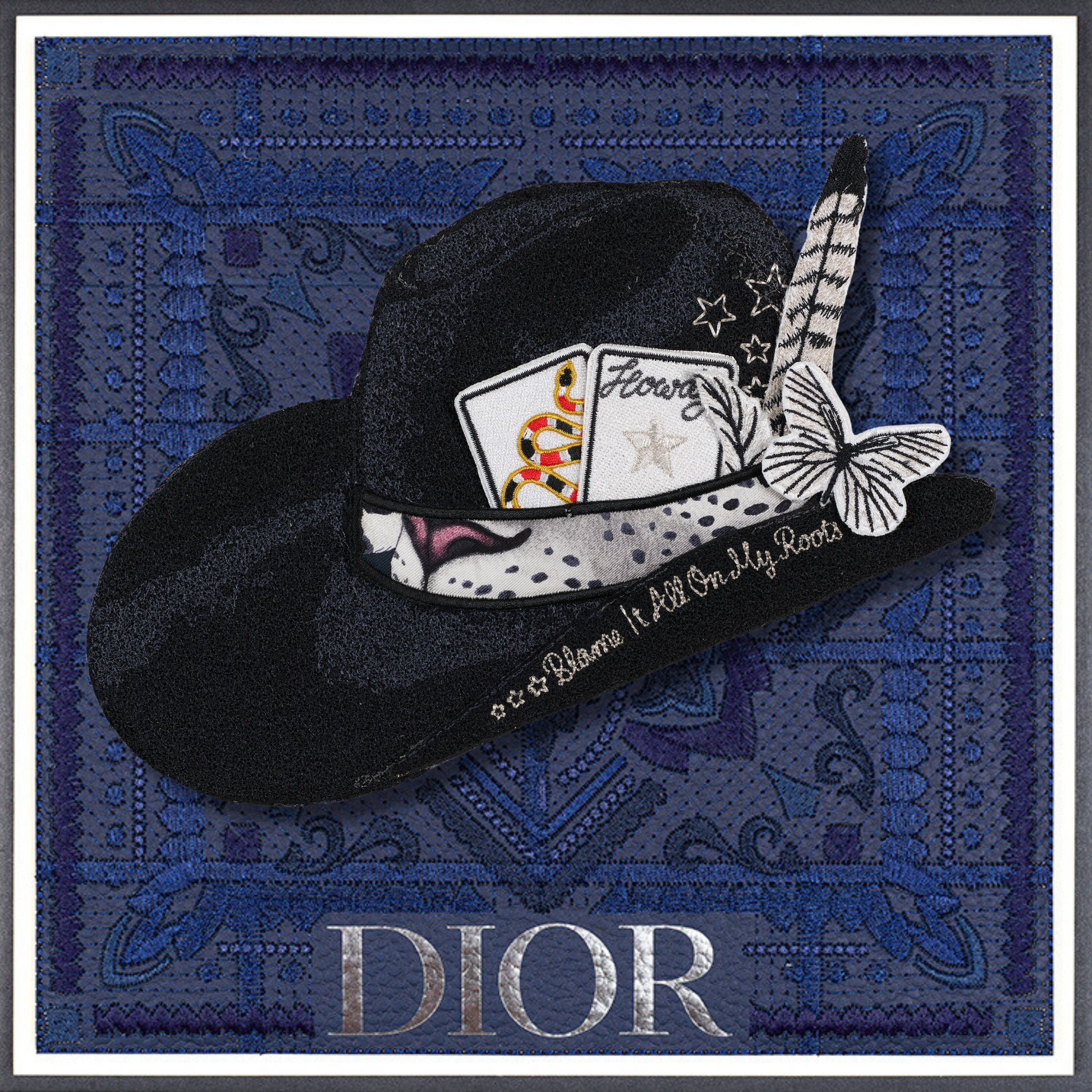 Experience the exclusive allure of the revamped Aspen Hat, a creation inspired by my national hat bar pop-ups. Every element—from the colors and cards to the feathers, knives, and butterflies—has been meticulously hand-selected and crafted for this bespoke piece. With intricate embroidery detailing every aspect, you can personalize it further by selecting your own background. Each Aspen Hat is a one-of-a-kind masterpiece, ensuring that your combination is truly distinctive.