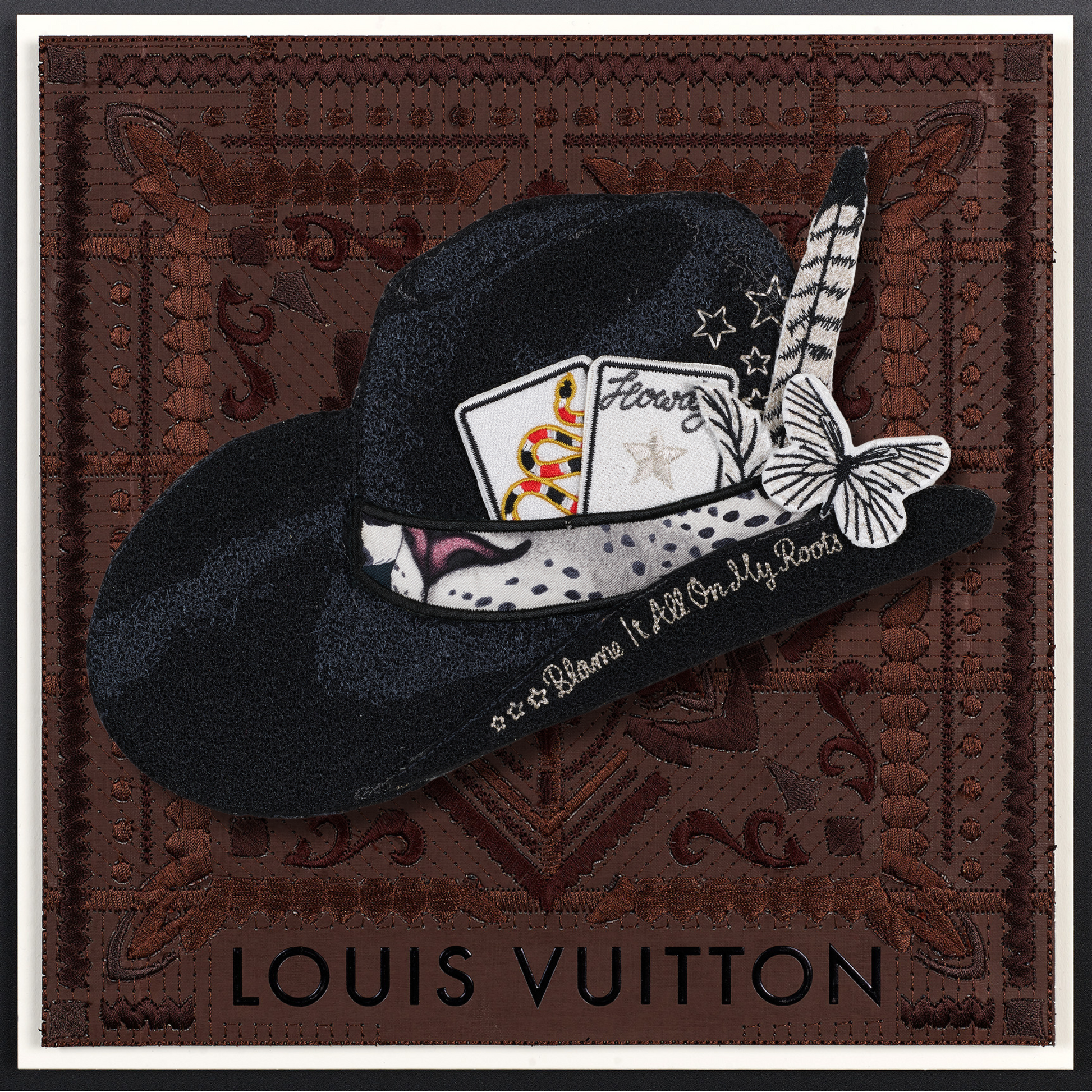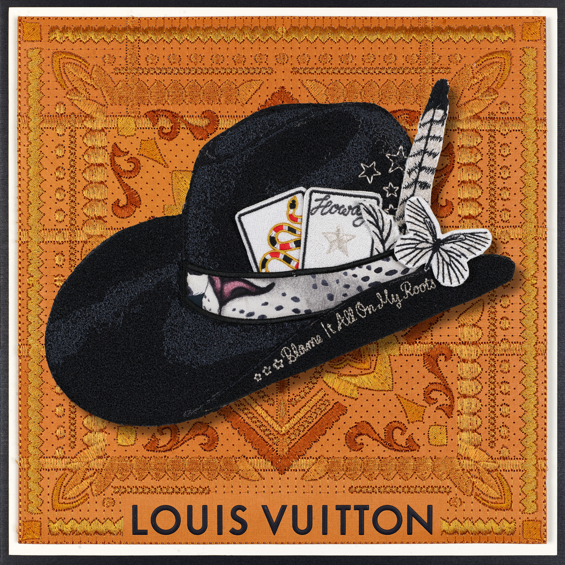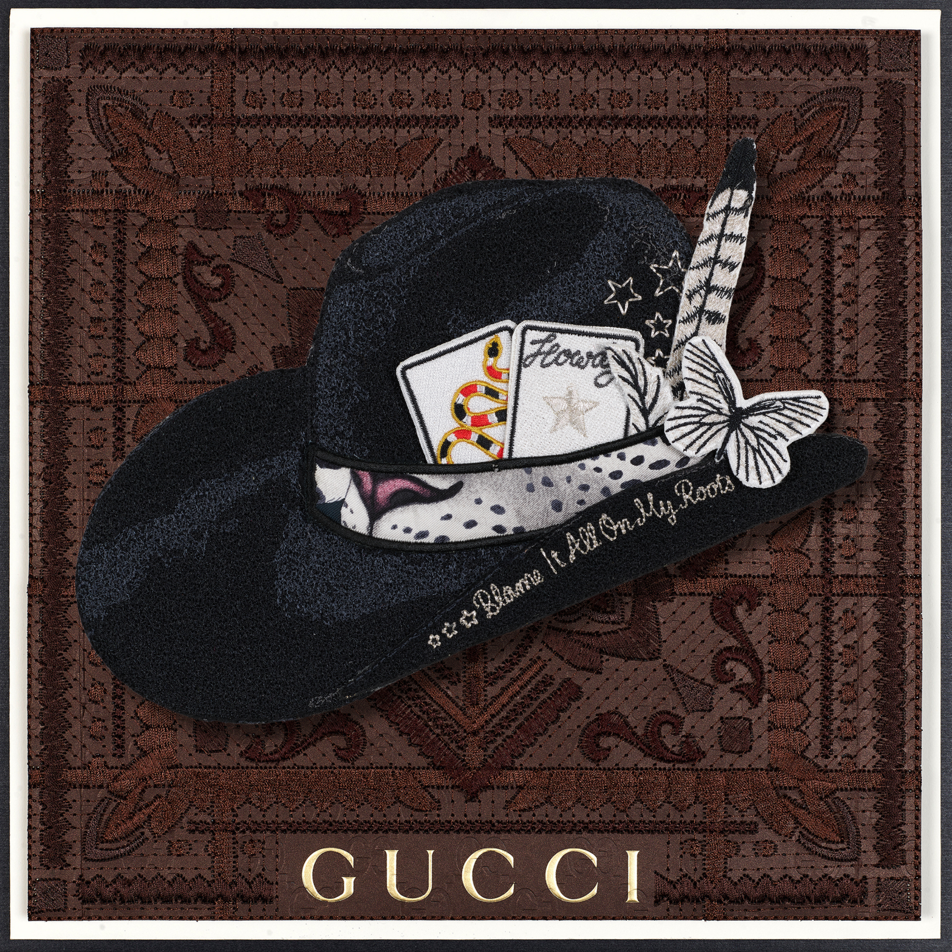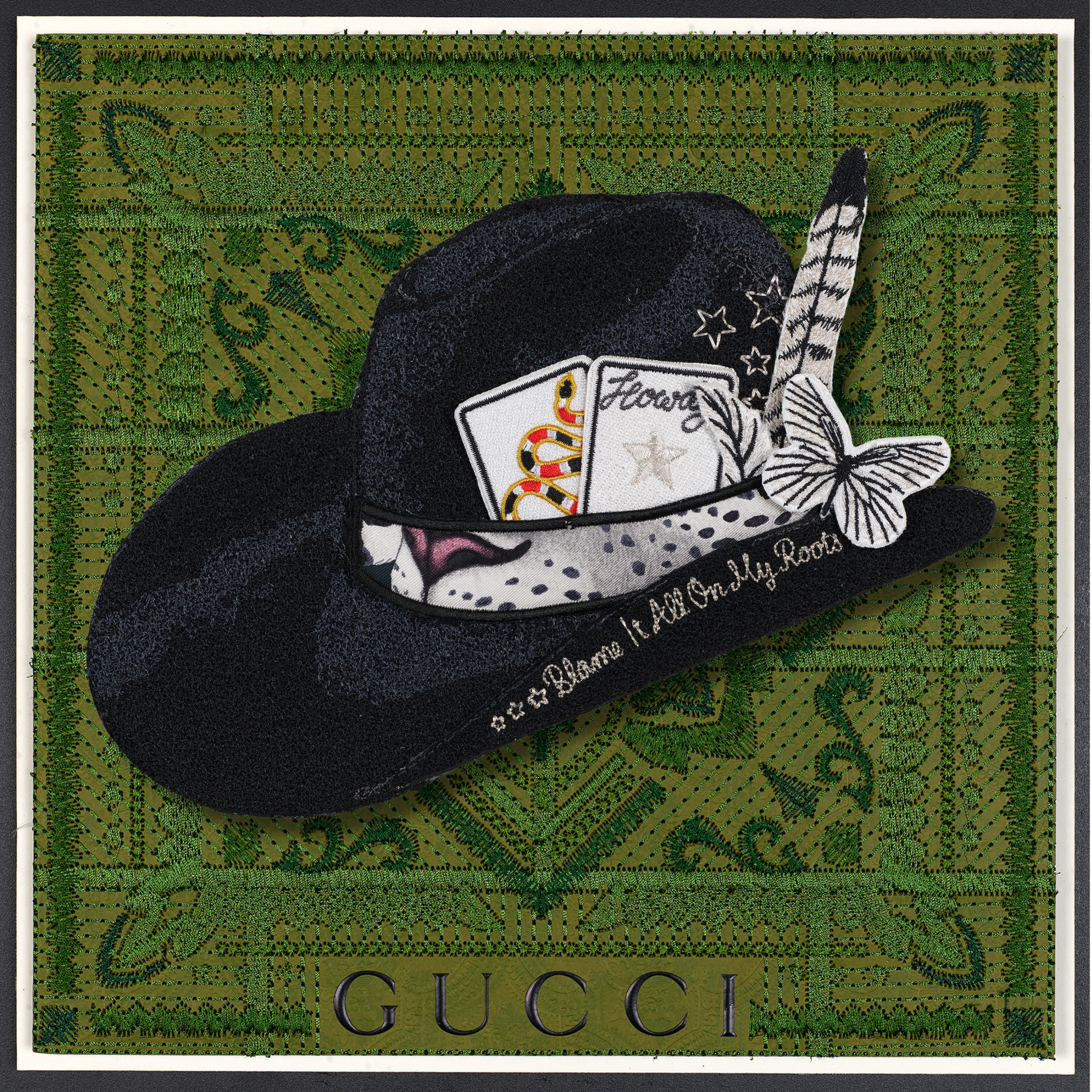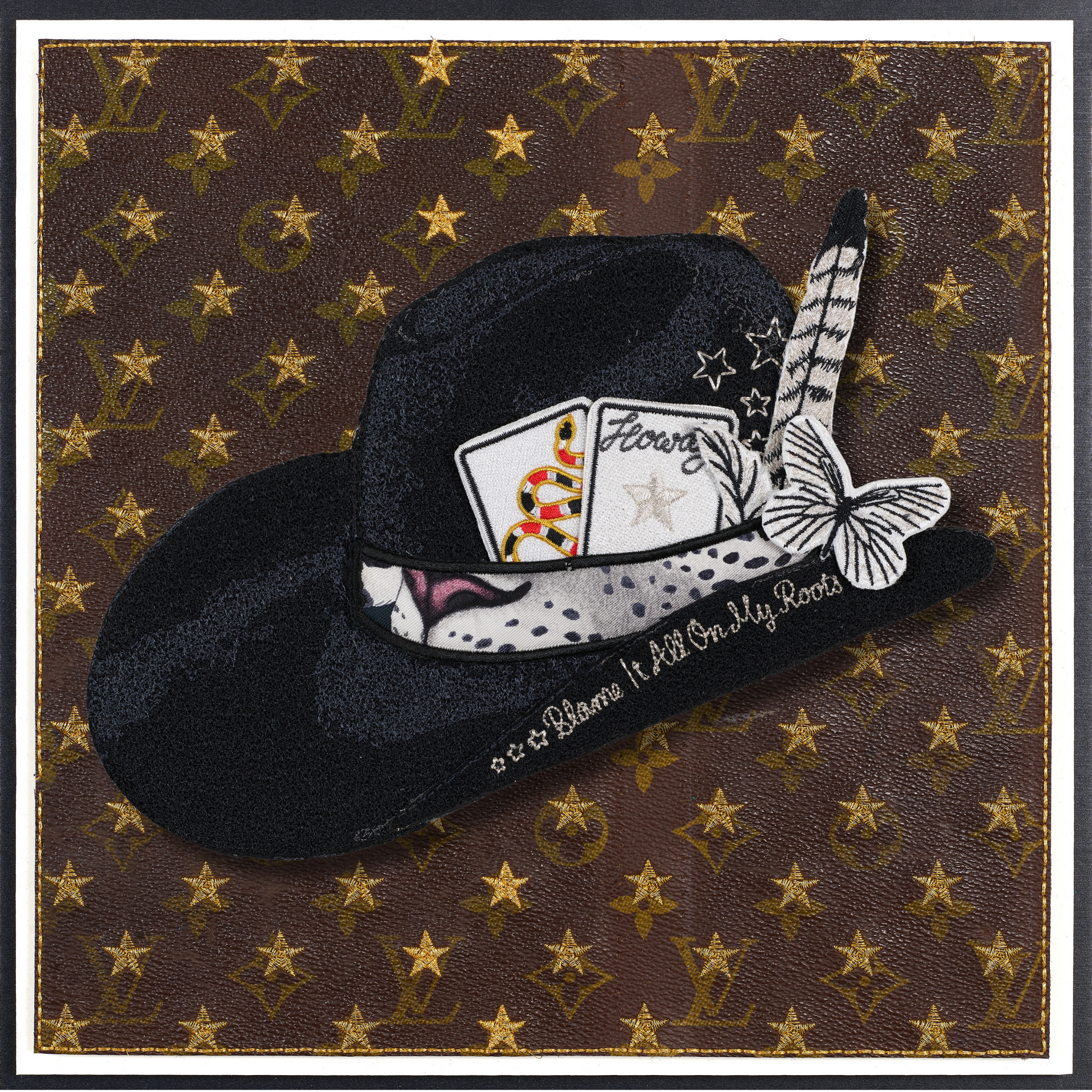 Experience the exclusive allure of the revamped Aspen Hat, a creation inspired by my national hat bar pop-ups. Every element—from the colors and cards to the feathers, knives, and butterflies—has been meticulously hand-selected and crafted for this bespoke piece. With intricate embroidery detailing every aspect, you can personalize it further by selecting your own background. Each Aspen Hat is a one-of-a-kind masterpiece, ensuring that your combination is truly distinctive.