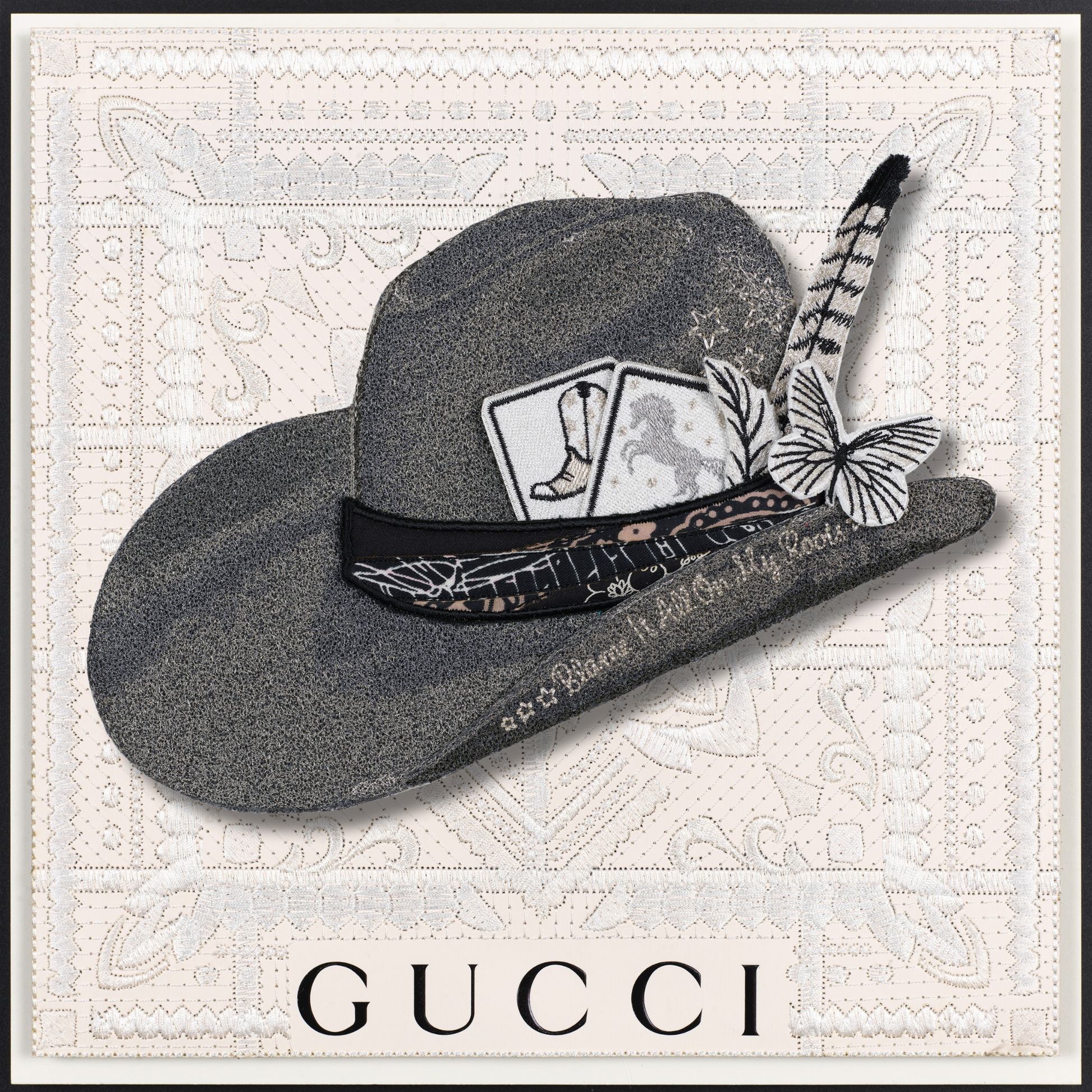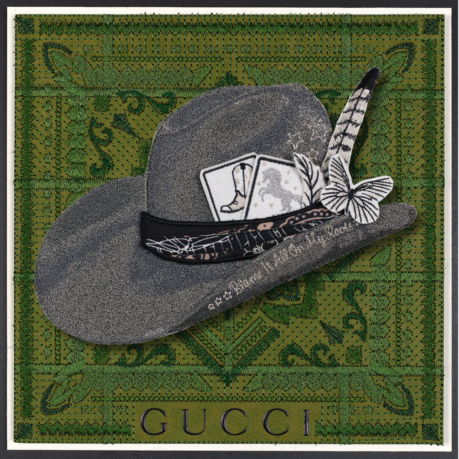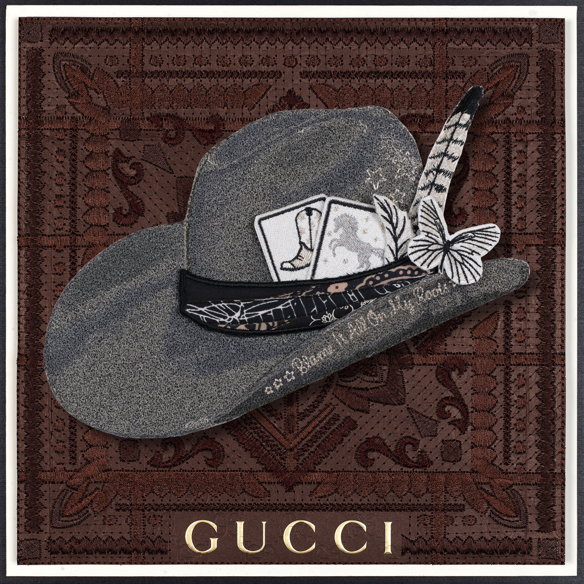 Experience the exclusive allure of the revamped Aspen Hat, a creation inspired by my national hat bar pop-ups. Every element—from the colors and cards to the feathers, knives, and butterflies—has been meticulously hand-selected and crafted for this bespoke piece. With intricate embroidery detailing every aspect, you can personalize it further by selecting your own background. Each Aspen Hat is a one-of-a-kind masterpiece, ensuring that your combination is truly distinctive.