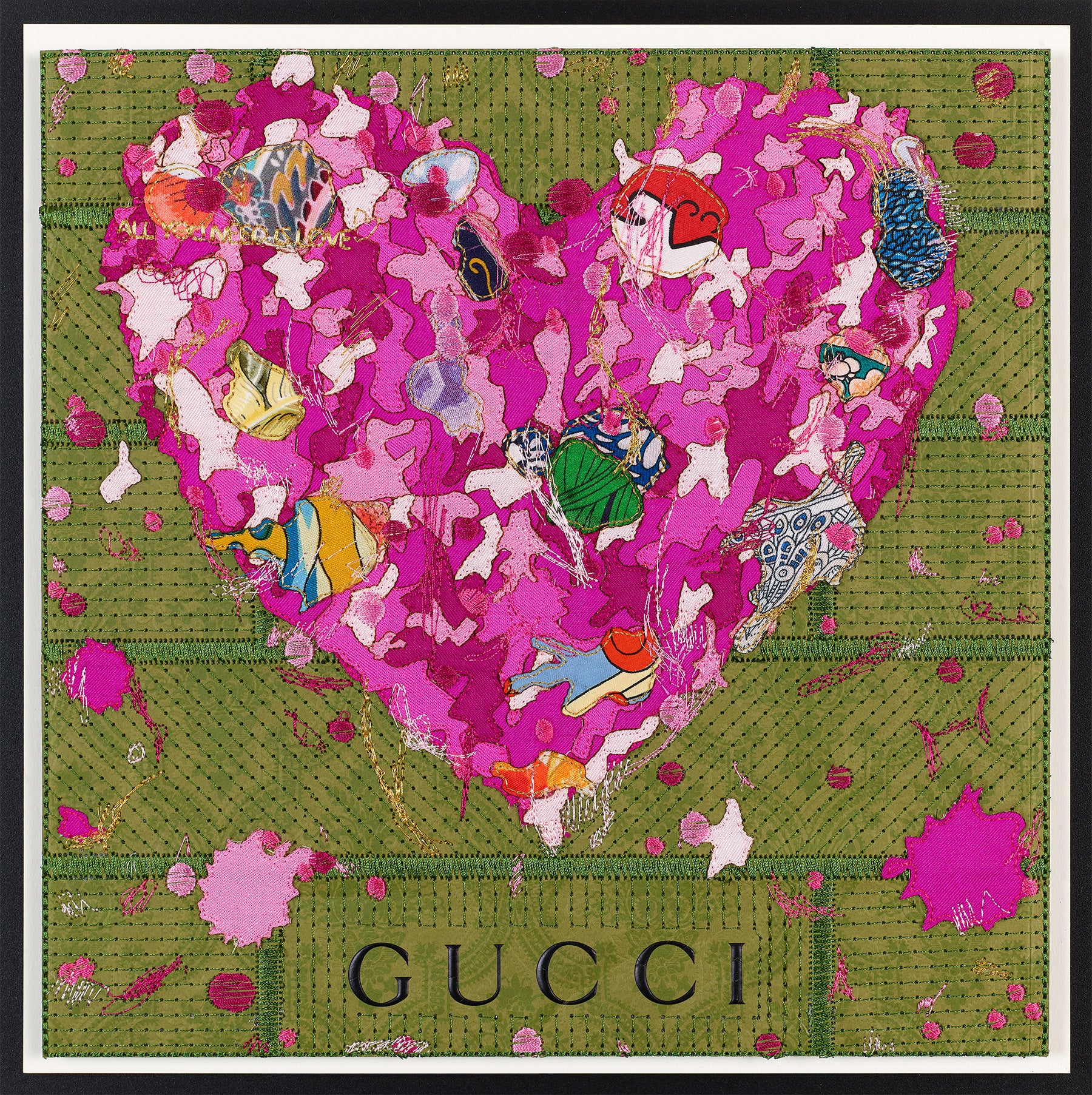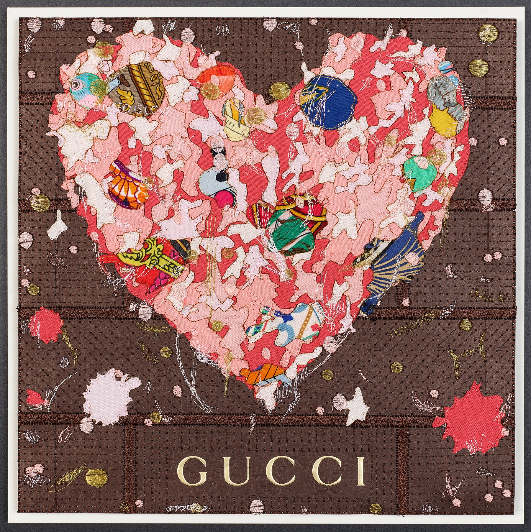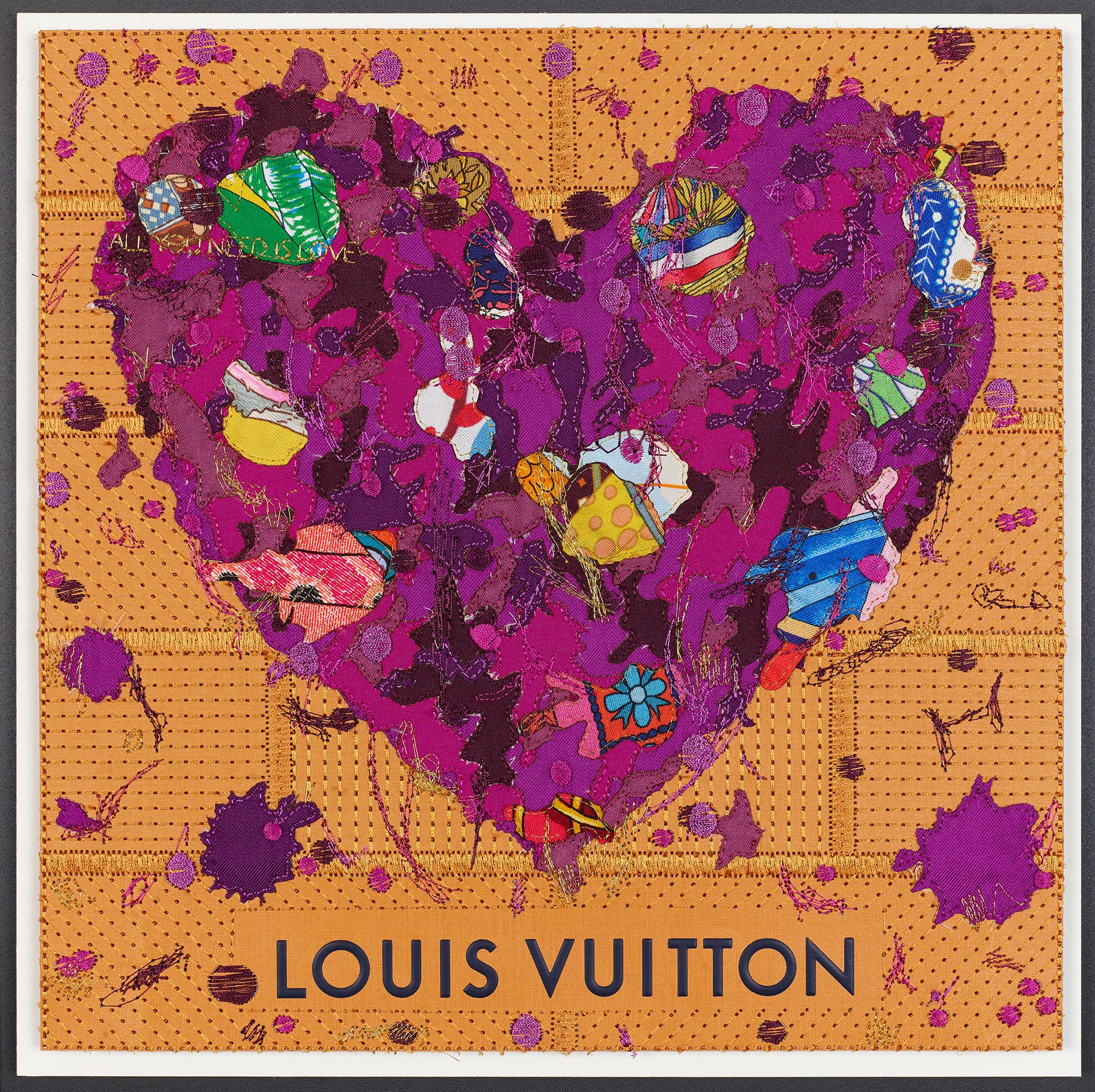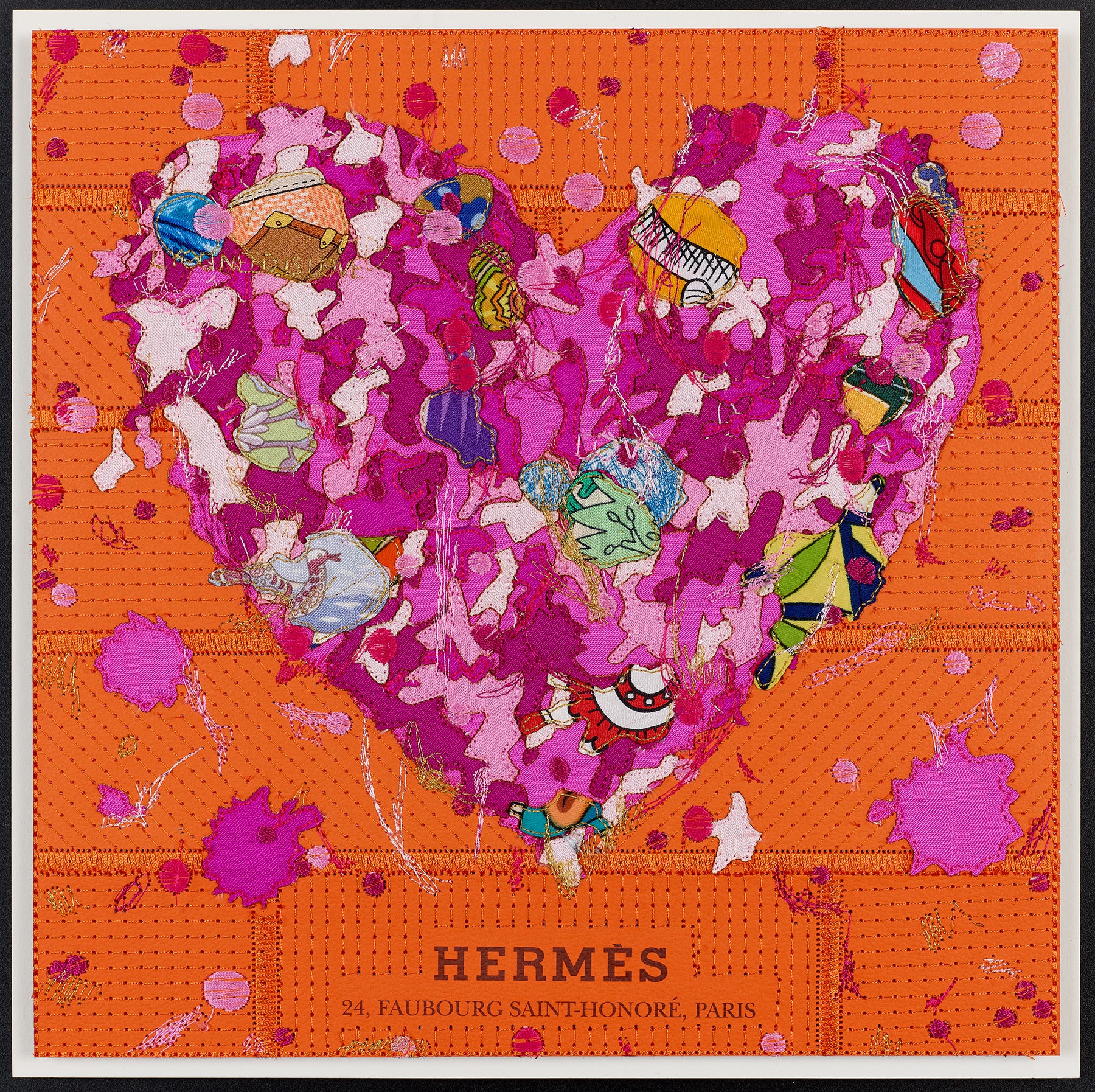 At the center, the heart is built like a sculptural object. More than 10 layers of silk scarves and silk fabric are stacked, shaped, and embroidered into a dimensional form that feels both soft and powerful. Over 100,000 stitches of thread carve through the layers, adding depth, movement, and a sense of intensity—like a pulse captured mid-beat. The embroidery is not just detail, it’s a signature: a labor-intensive mark-making that echoes the bold immediacy of graffiti, translated into couture materials.
