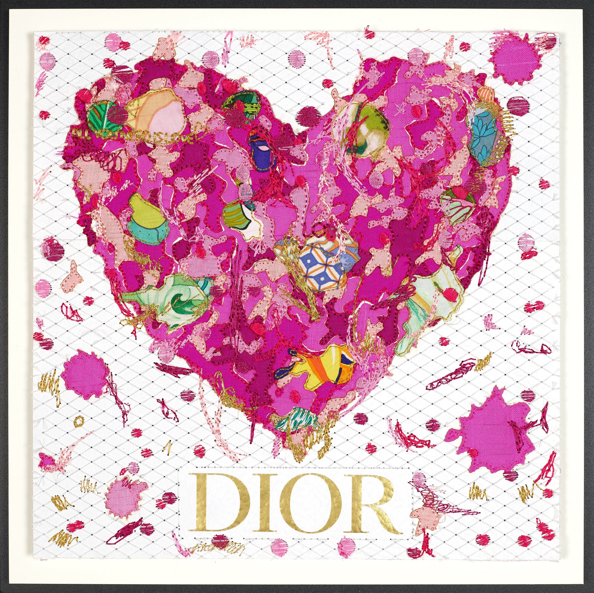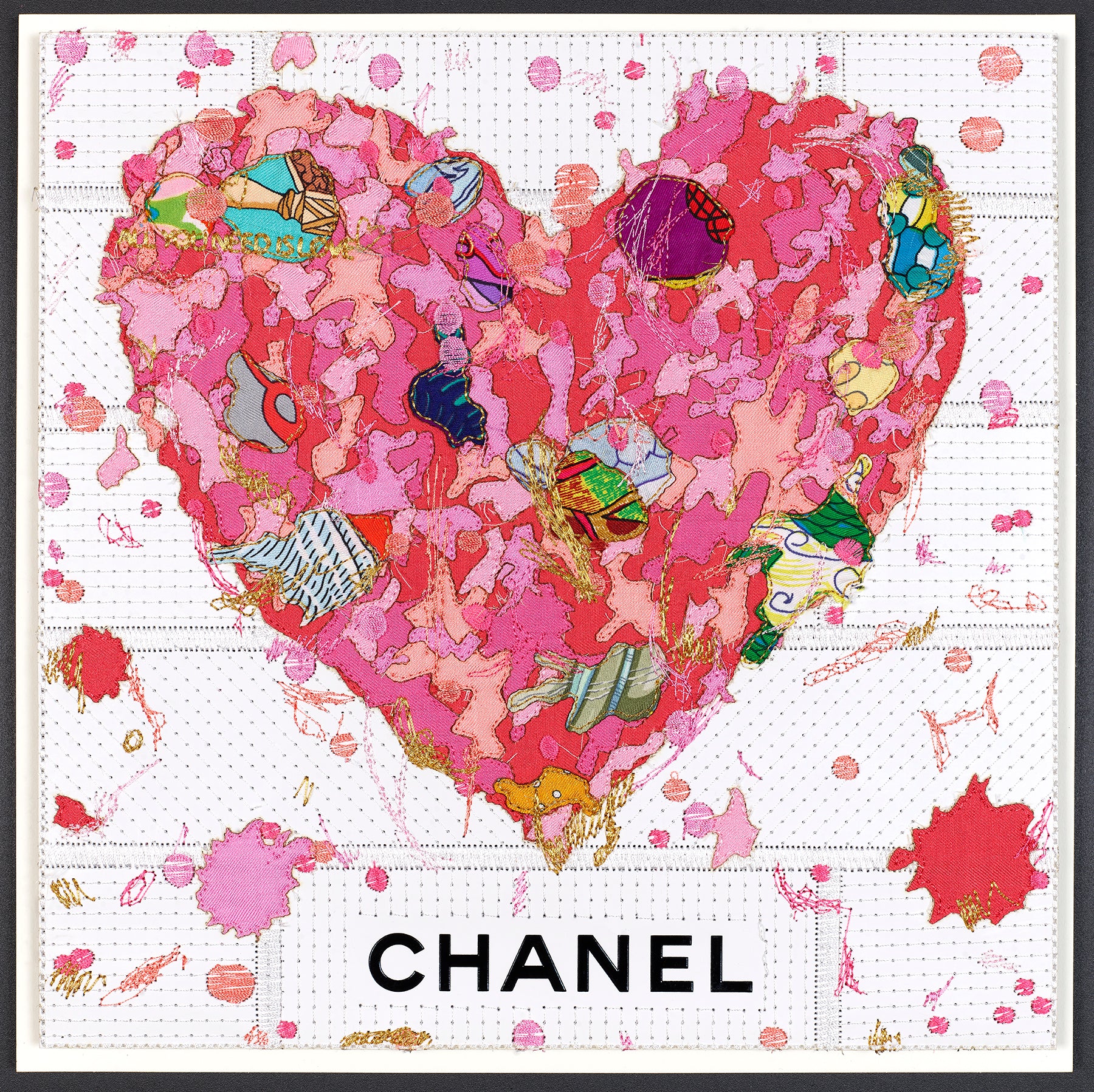 The 12” size begins with a single luxury bag or box—preserved as its own intimate canvas, where every logo, crease, and texture becomes part of the story. The larger sizes are composed from an array of luxury packaging that is carefully sourced, then deconstructed and reimagined: boxes and bags are cut, layered, and collaged into one expansive background before being stitched together with meticulous precision. The surface becomes a tapestry of fashion history—fragmented, reconstructed, and elevated into art.