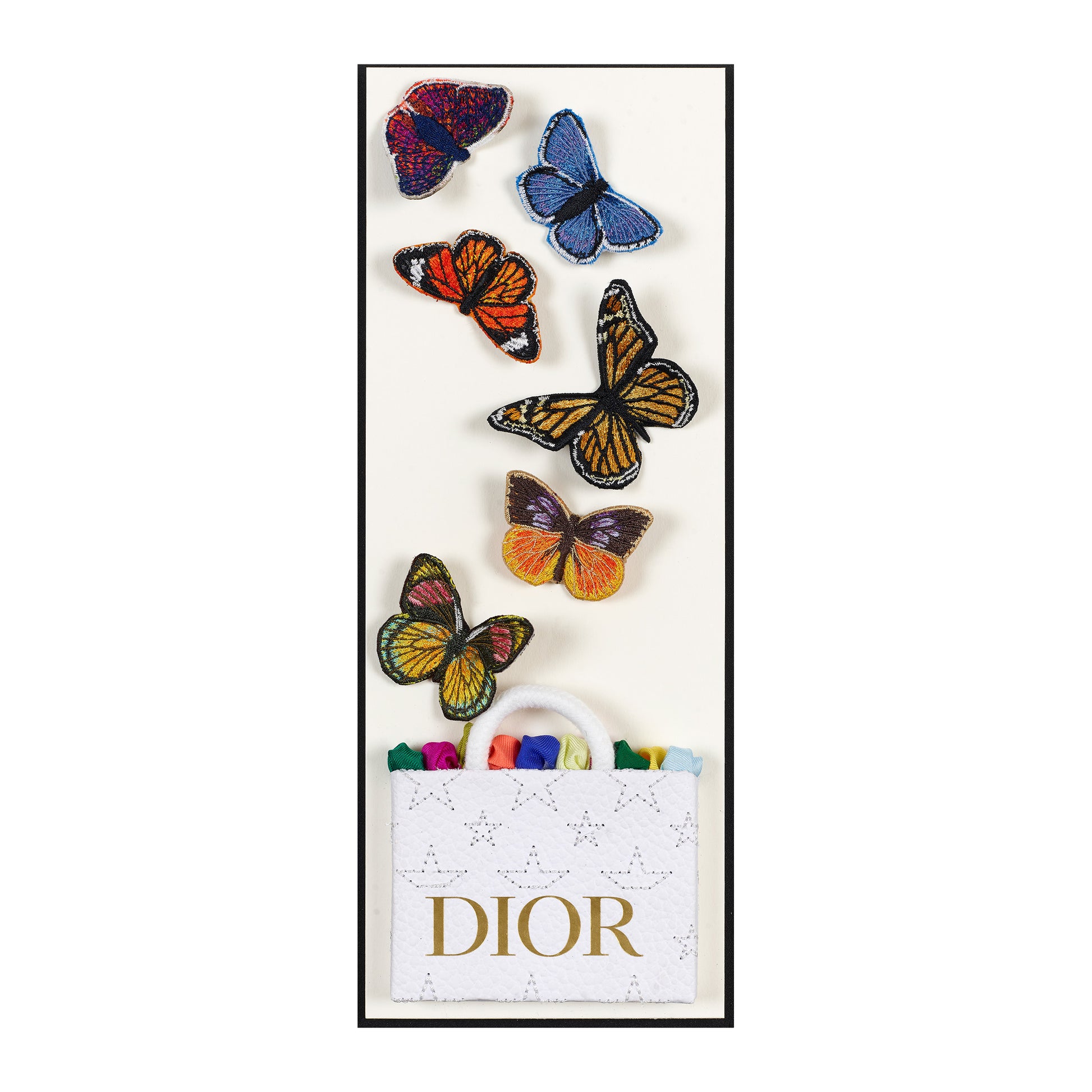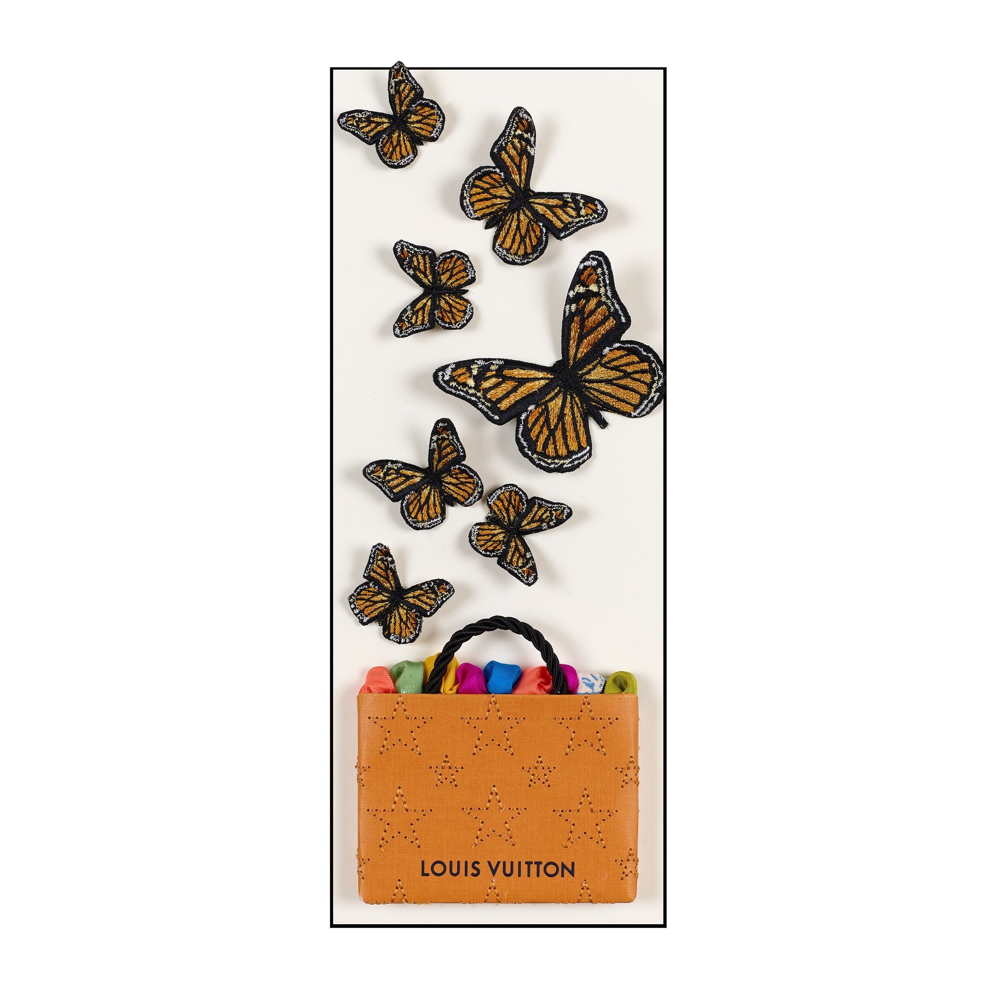 A collectible micro moment with major studio energy. Each Petite Bag begins as an up-cycled luxury jewelry or accessory shopping bag, carefully deconstructed into pattern pieces, then reimagined through quilting and rich embroidery thread. Once rebuilt over a sculpted form, the handles are added and the interior is stuffed with remnants of luxury scarves—turning every detail into a layered, textural surprise. Two embroidered butterflies are mounted in relief for a sculptural finish.
