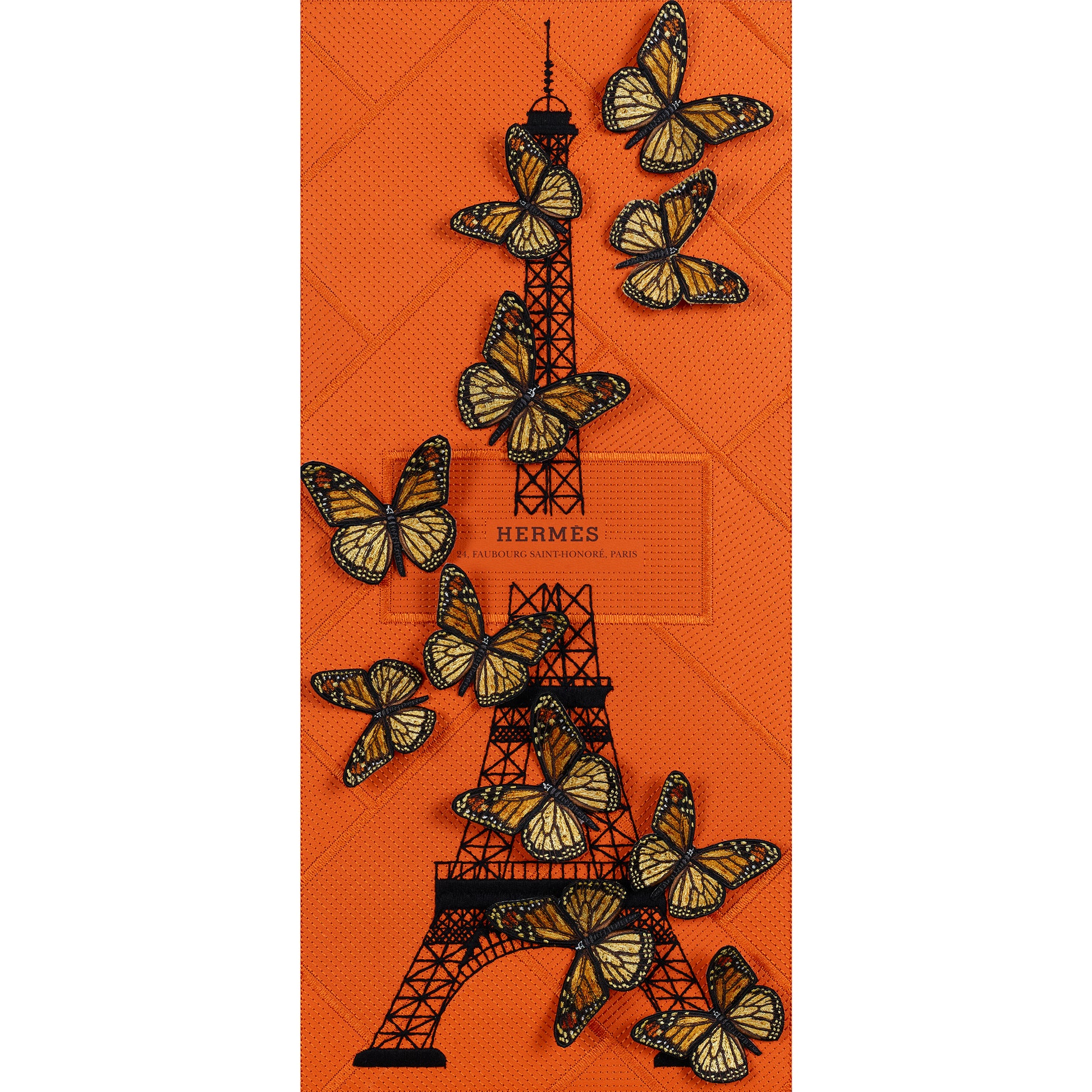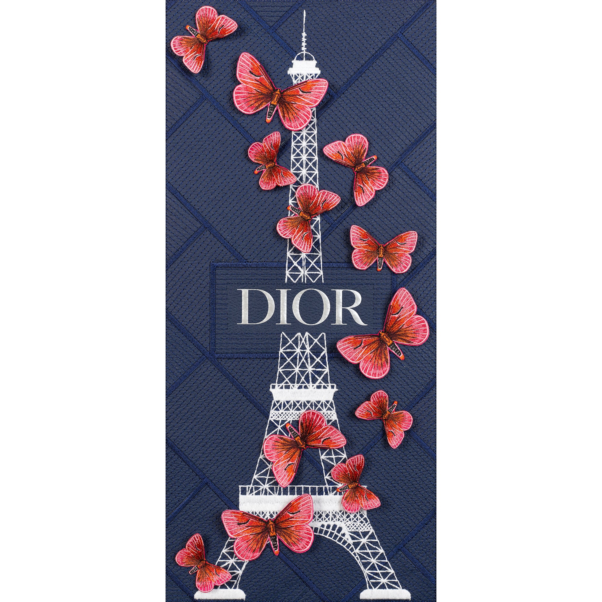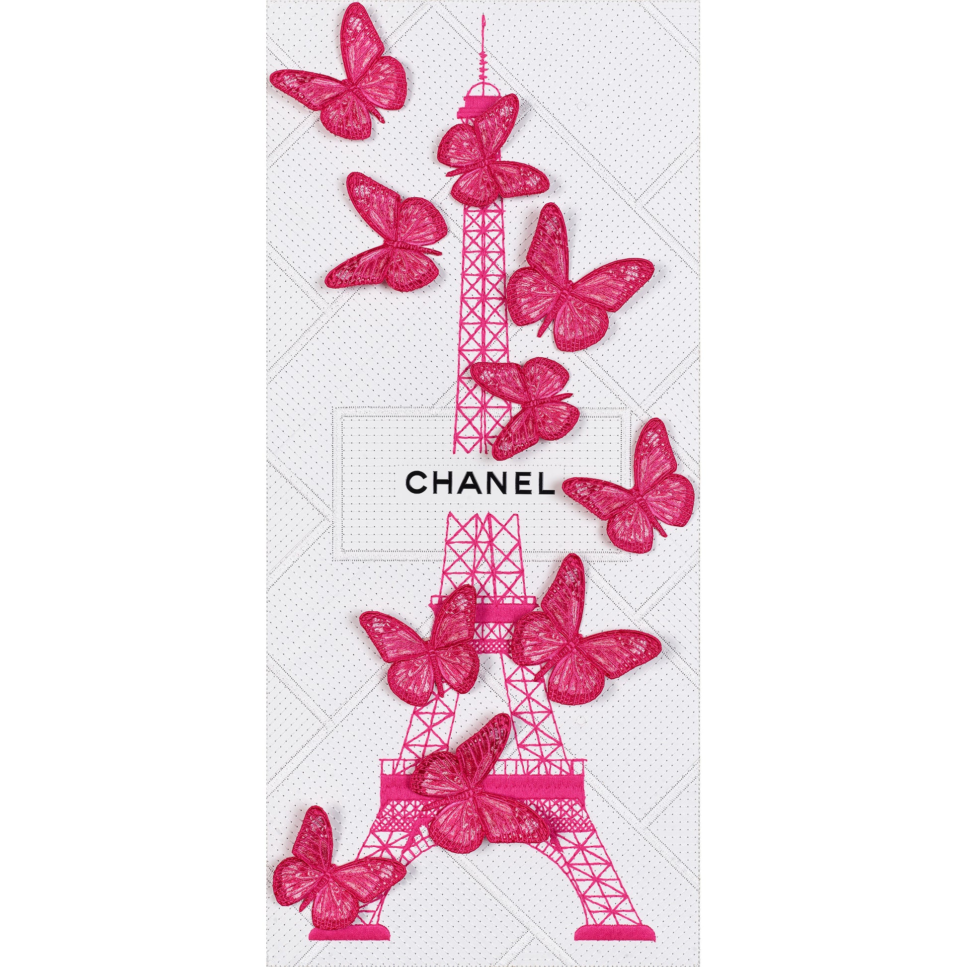 To finish, embroidered butterflies are mounted in relief, climbing and floating off the tower for a dramatic, three-dimensional effect—like a burst of movement captured mid-air. Available in either natural tones or tonal colorways, the butterflies can feel soft and romantic or modern and monochrome, depending on the look you want. The result is a striking blend of luxury, artistry, and couture-level detail—designed to feel collectible, current, and effortlessly chic.