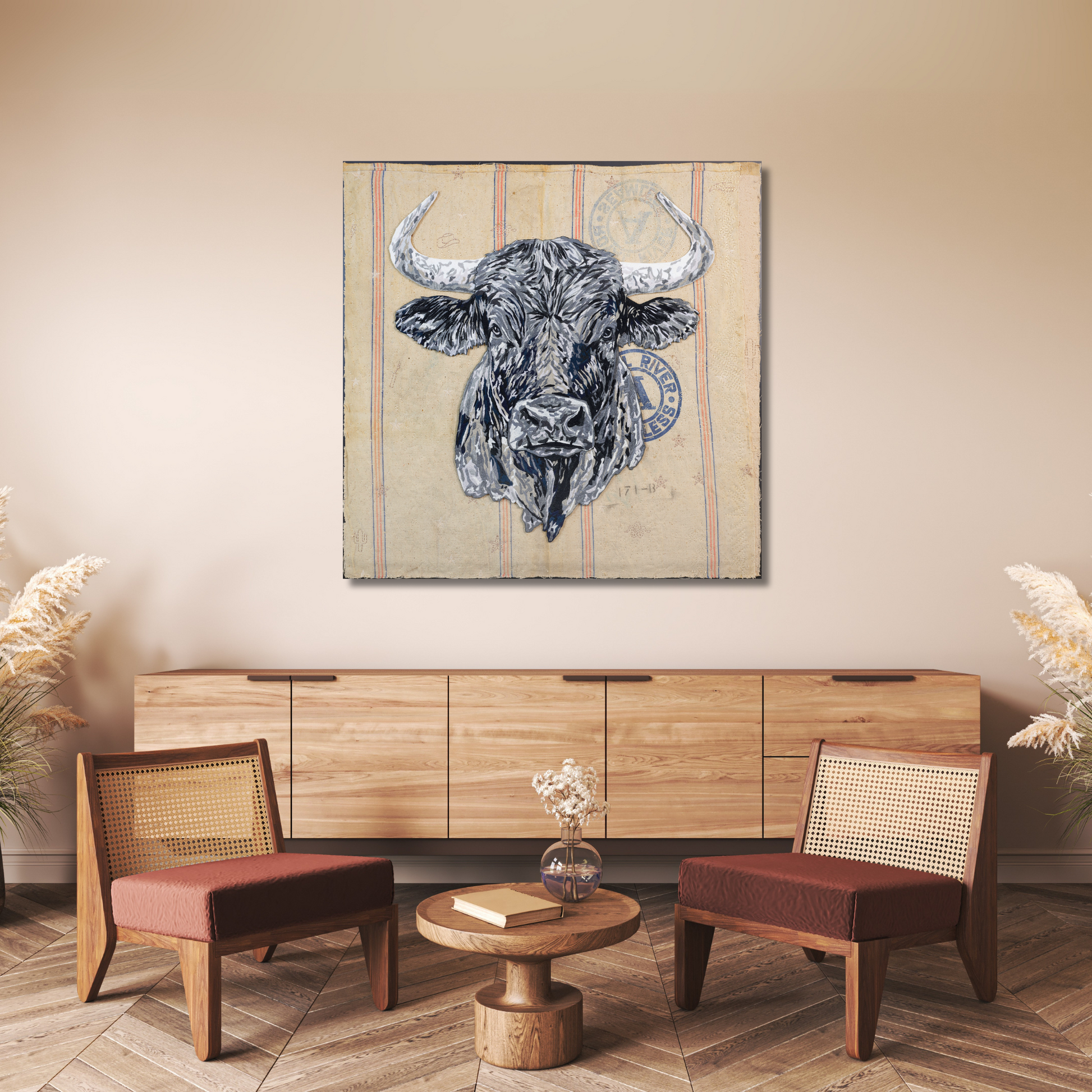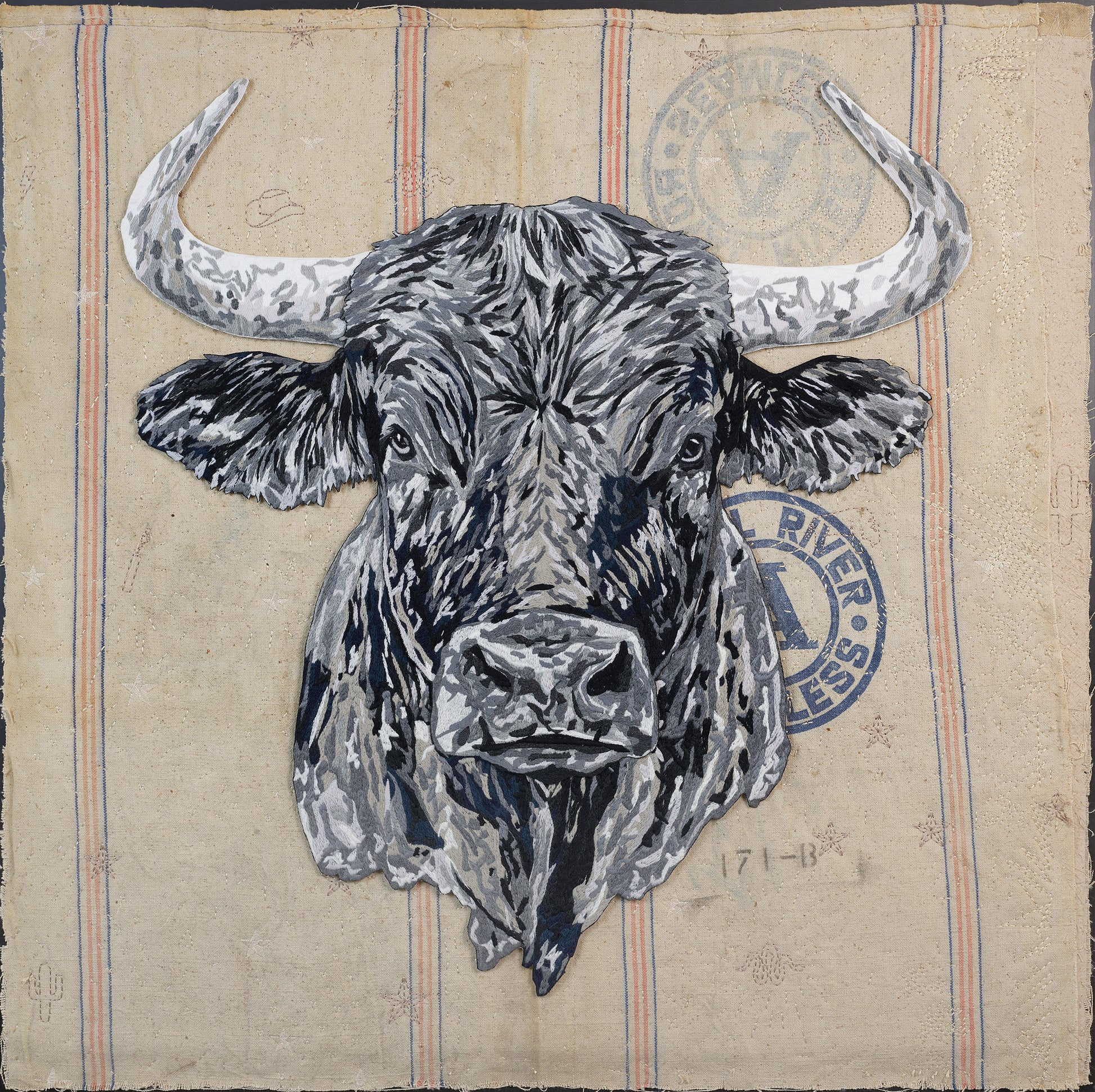 The bull itself is monumental, crafted with over half a million stitches in rich, luxurious wool thread. Shades of gray lend depth to its form. After days of meticulous embroidery, the bull was hand-trimmed and mounted on clear acrylic, creating a striking relief effect against the vintage fabric background.