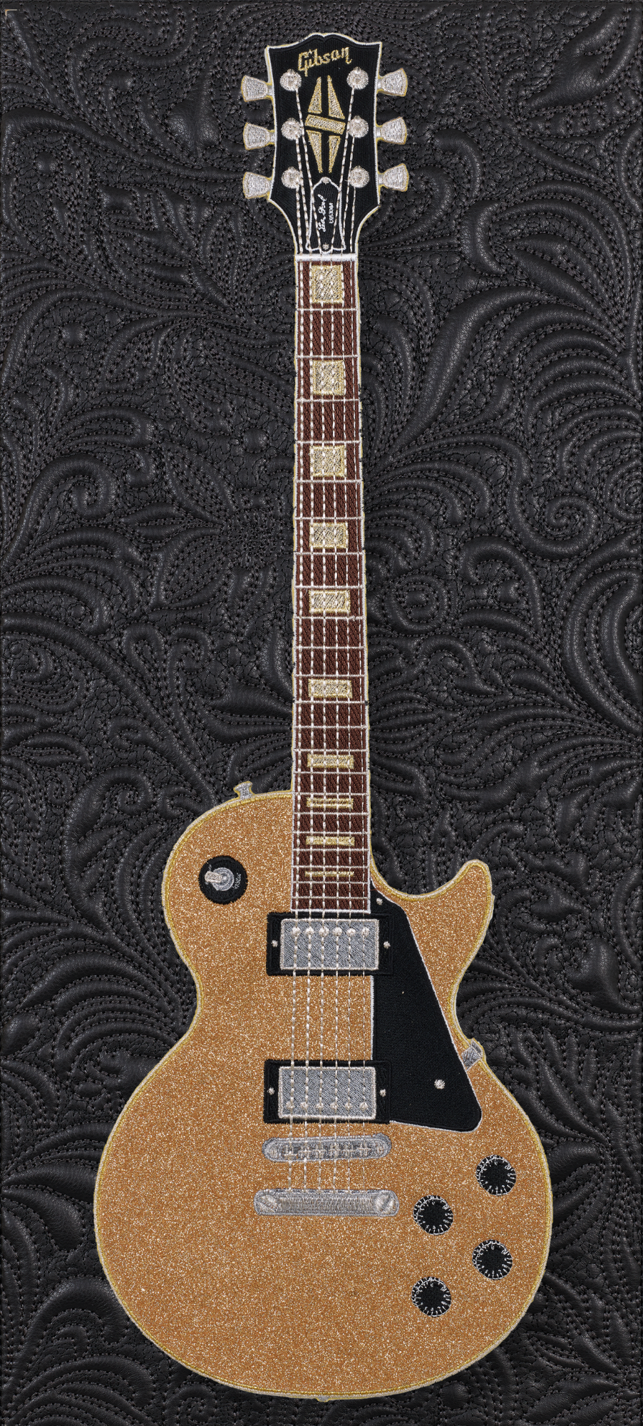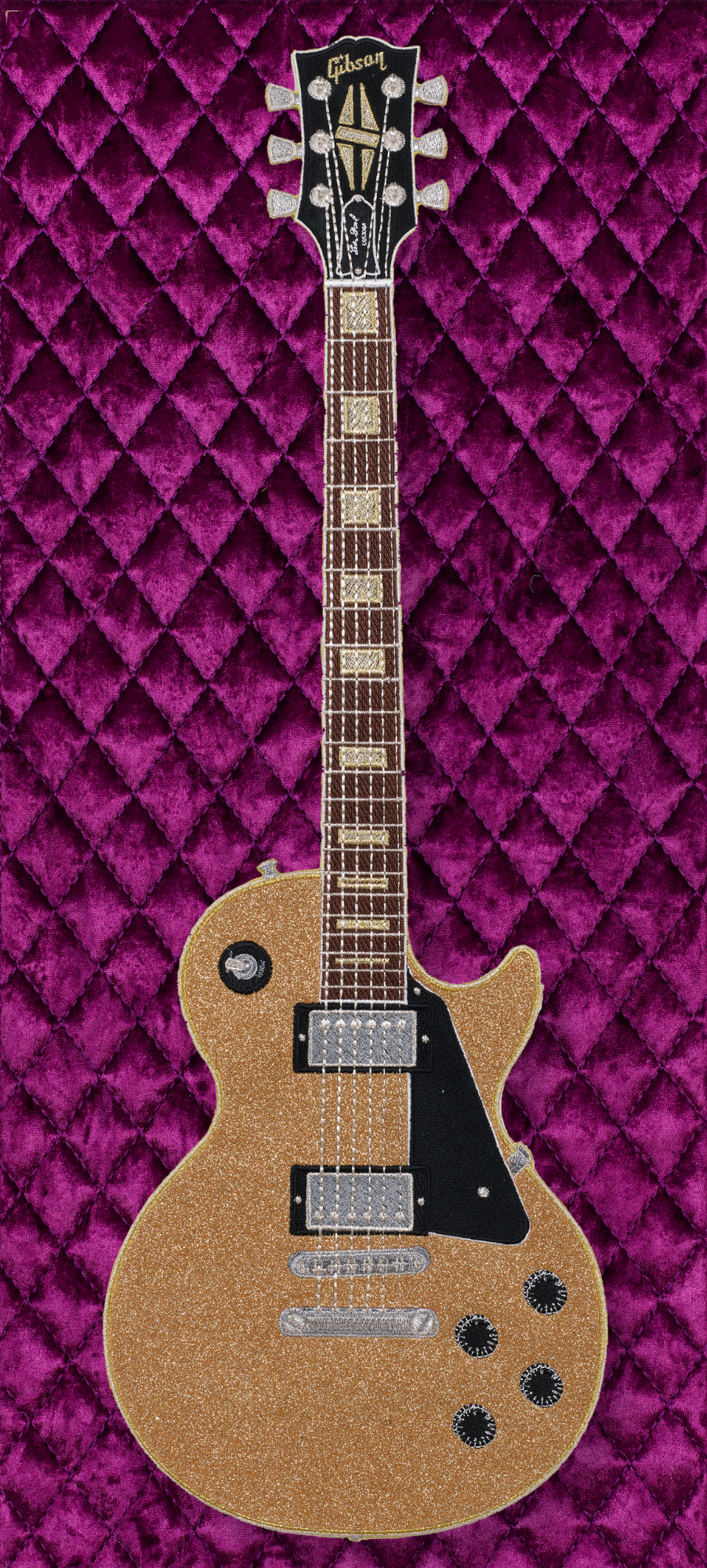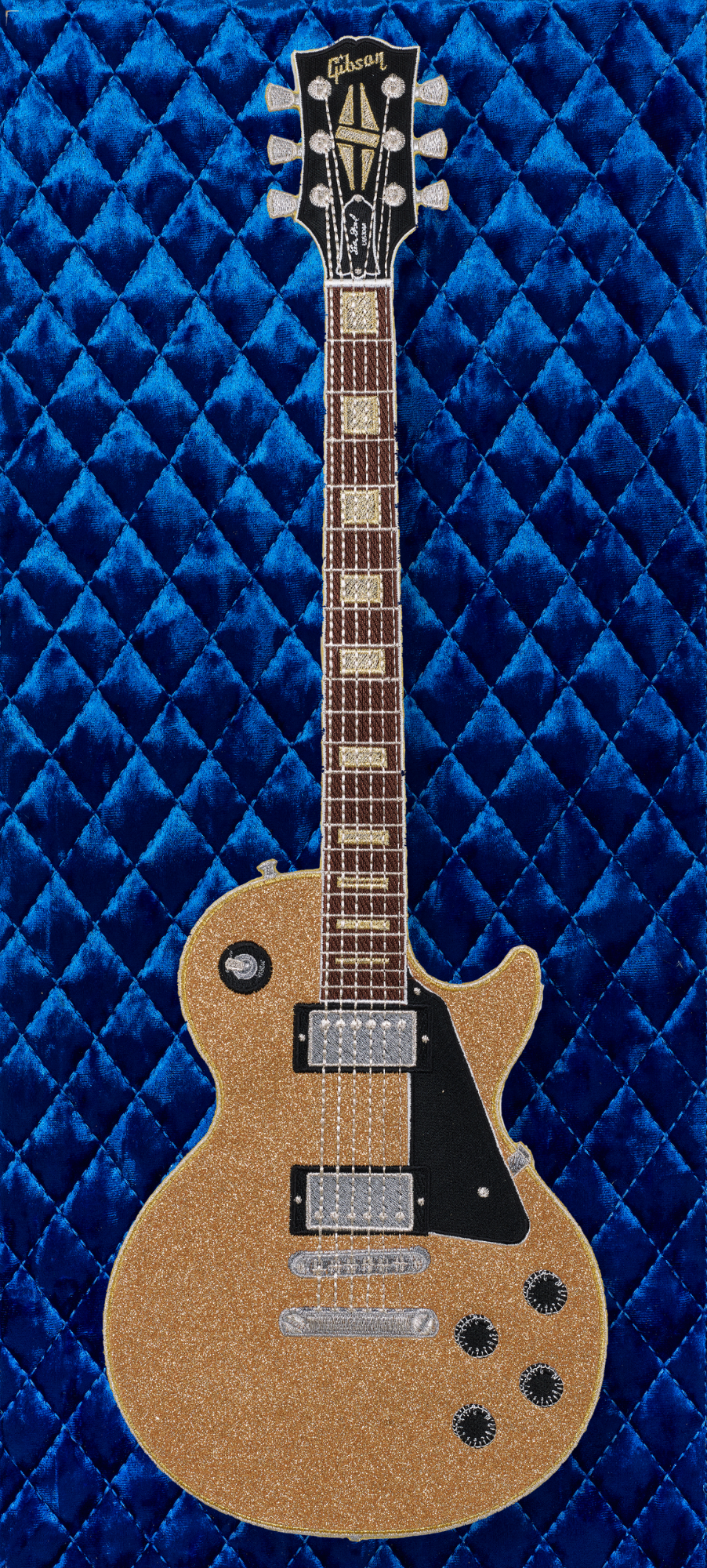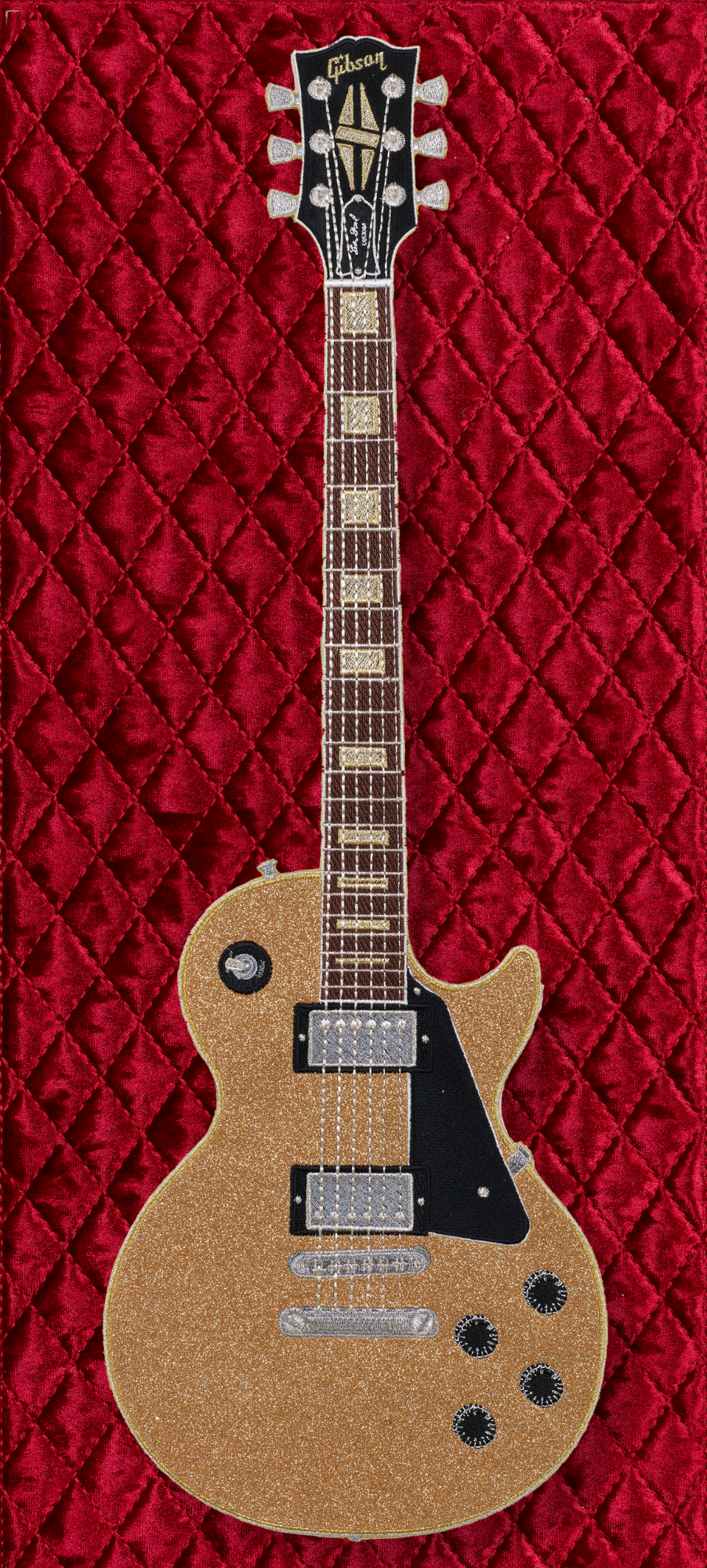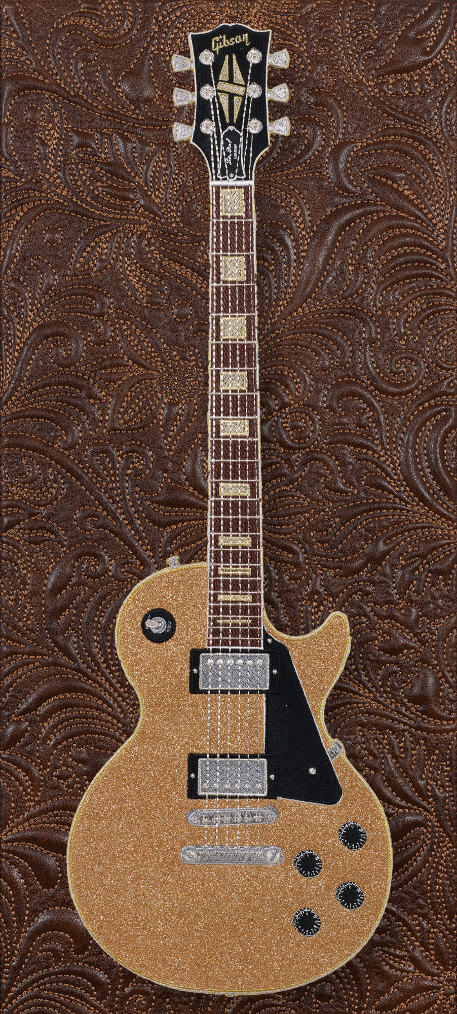 Each guitar is intricately embroidered, capturing the essence of vintage instruments with thread artistry. Over 150,000 meticulous stitches breathe life into these designs. The quilted series backgrounds showcase layers of fabric painstakingly appliquéd with time-honored quilting techniques, evoking the rich textures of velvet or leather from a guitar case.