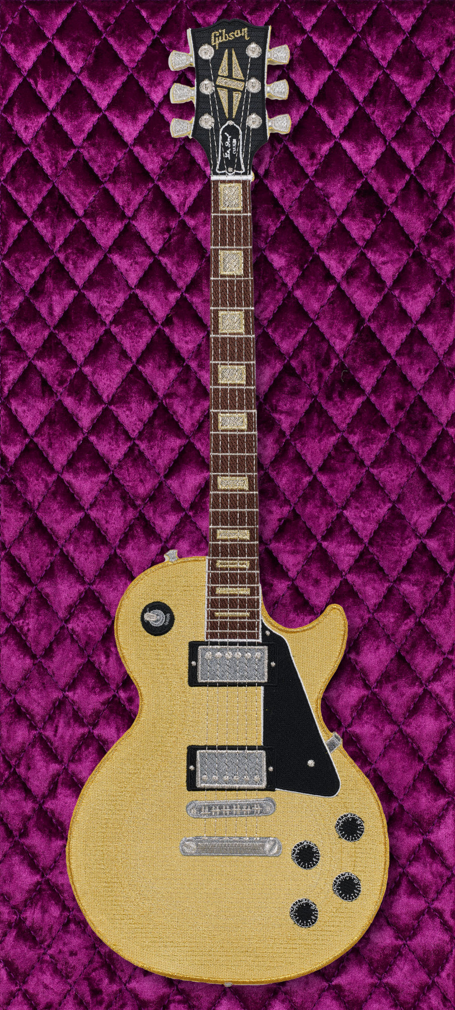 Each guitar is intricately embroidered, capturing the essence of vintage instruments with thread artistry. Over 150,000 meticulous stitches breathe life into these designs. The quilted series backgrounds showcase layers of fabric painstakingly appliquéd with time-honored quilting techniques, evoking the rich textures of velvet or leather from a guitar case.