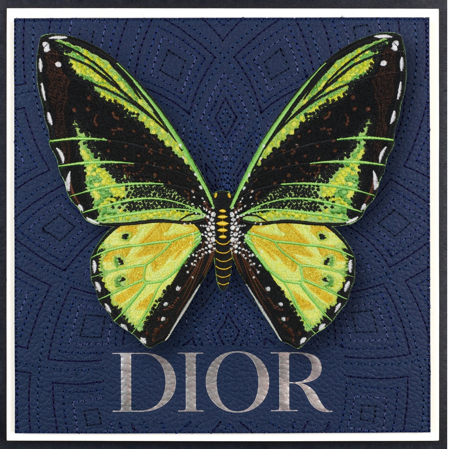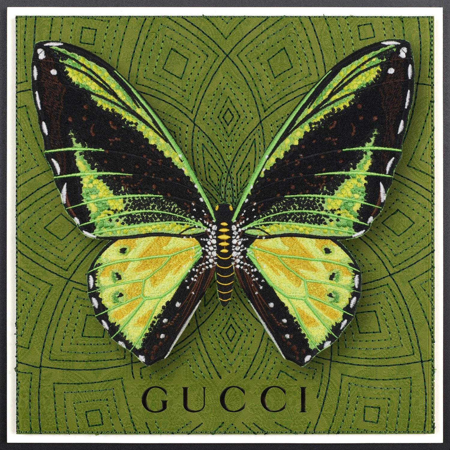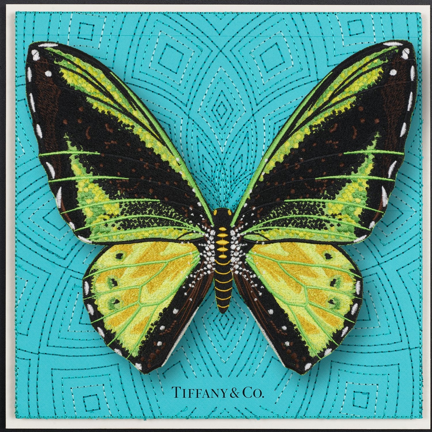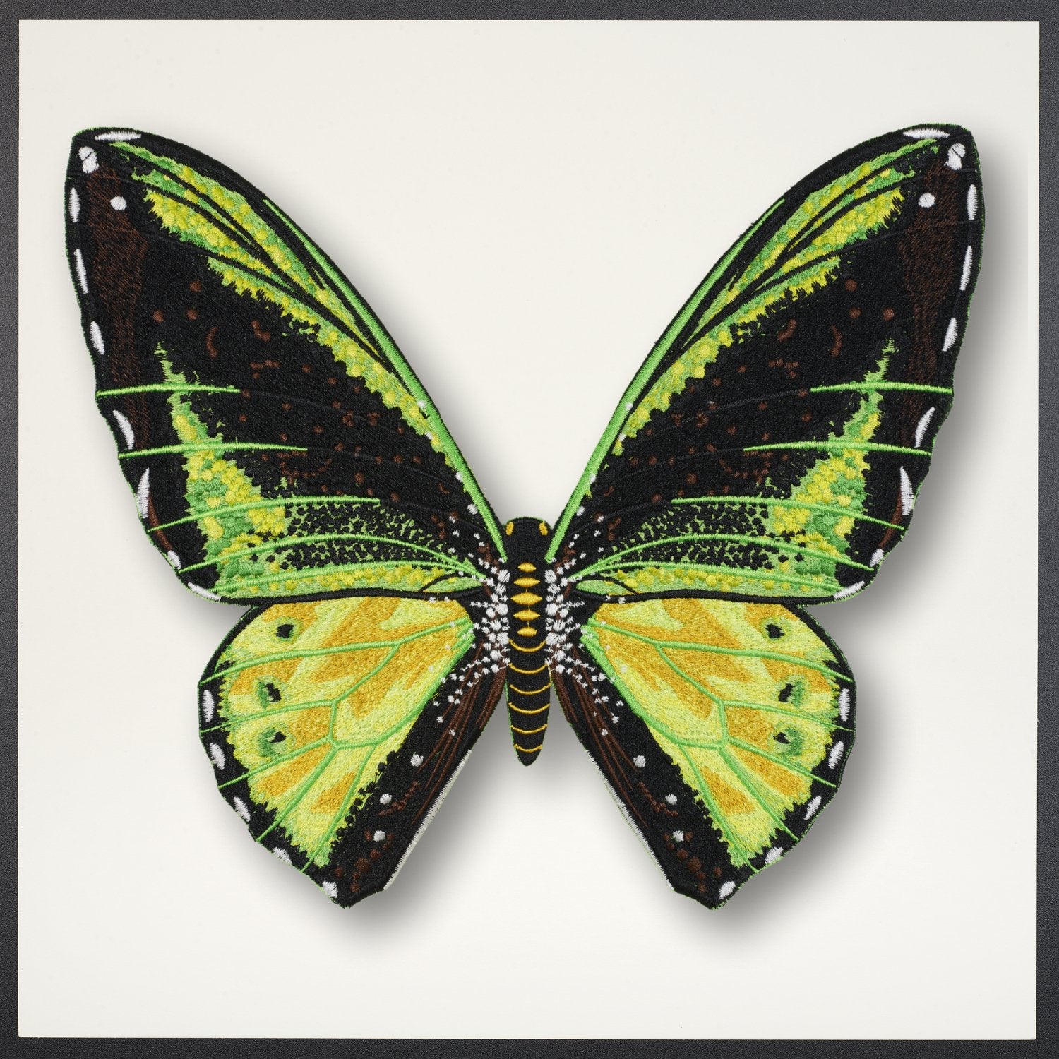 The Butterfly pieces start with up-cycled luxury boxes or shopping bags that are trimmed into the background shape, collaged and then embroidered. The embroidery is stitched directly through the actual box itself. Each background features intricate embroidery stitches that truly make each one unique. Once the background is complete it is padded and mounted. The butterfly is embroidered with ver 150,000 stitches. Once embroidered are hand trimmed and mounted in relief over the background.