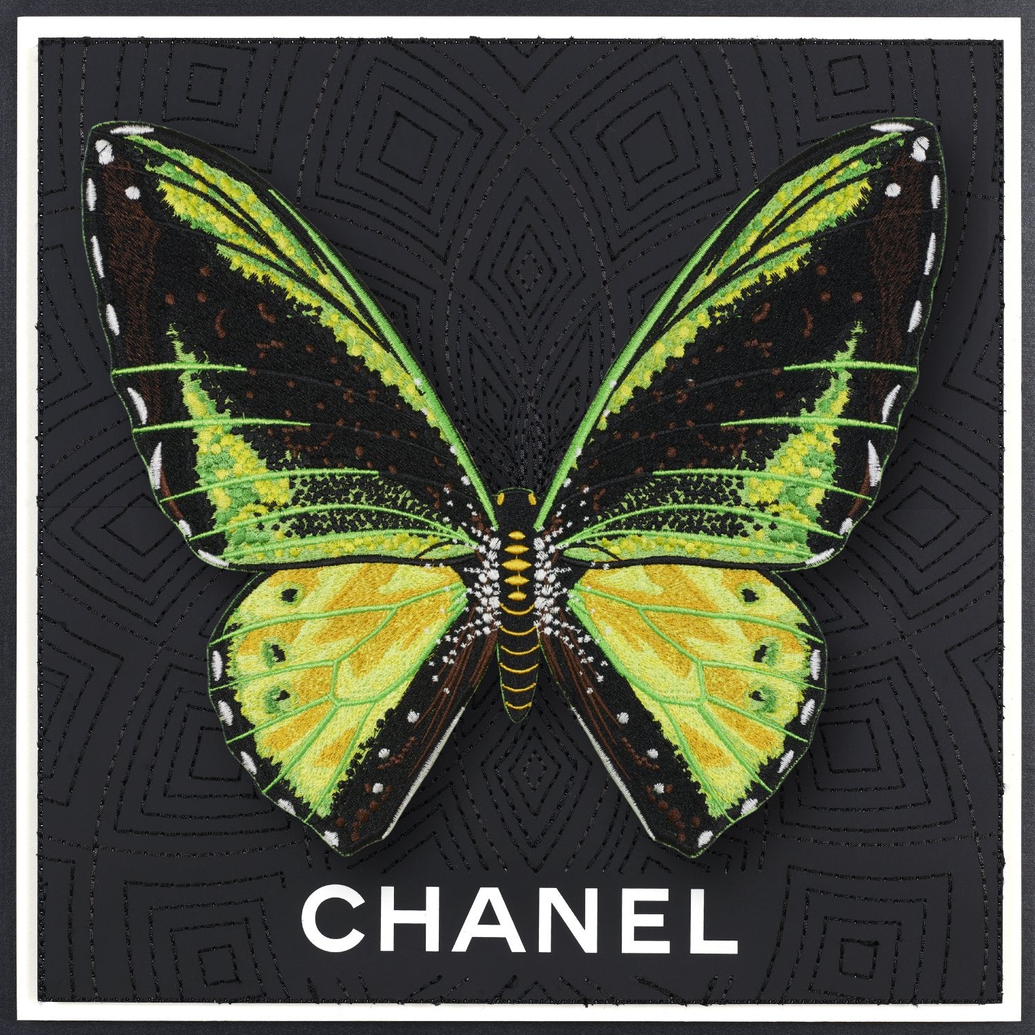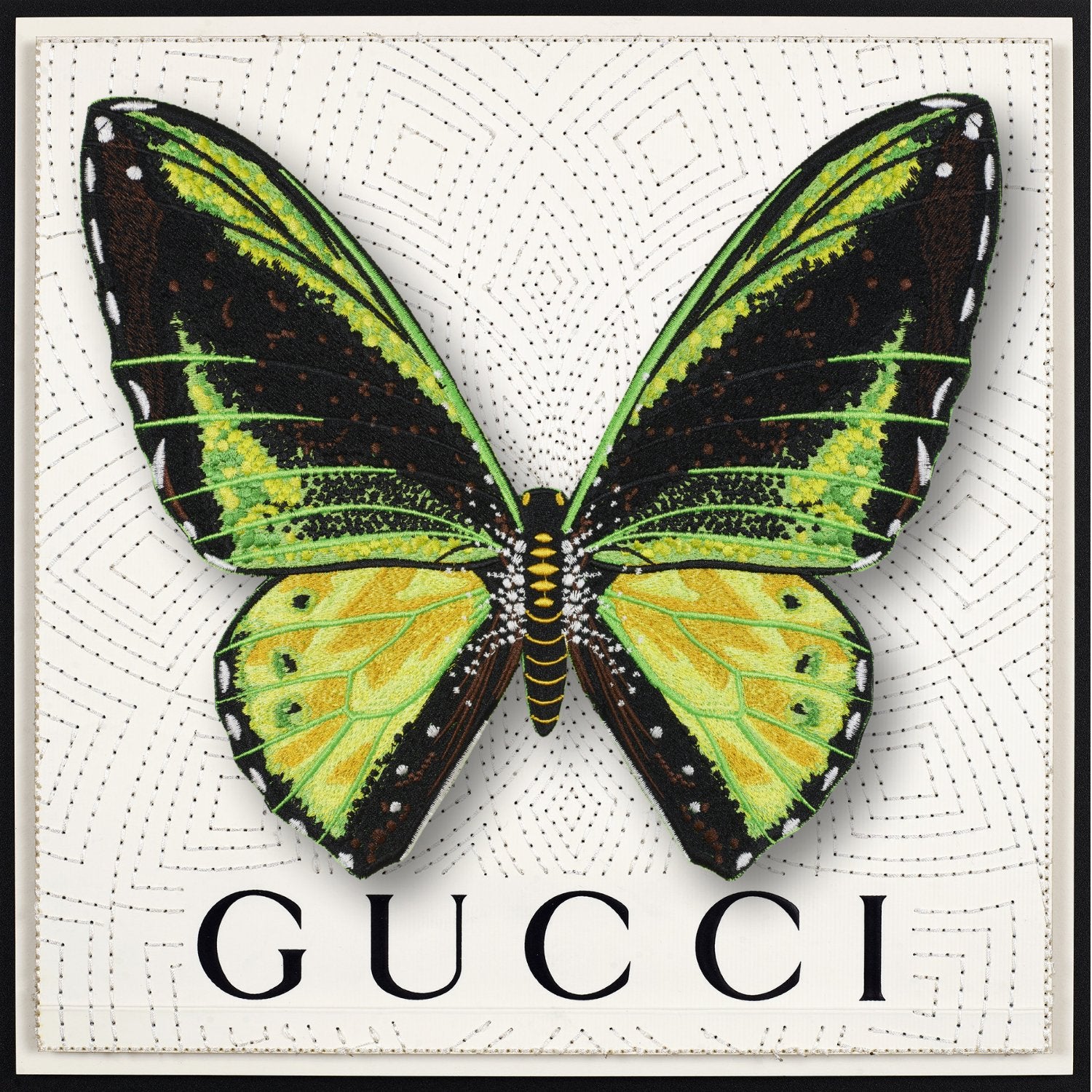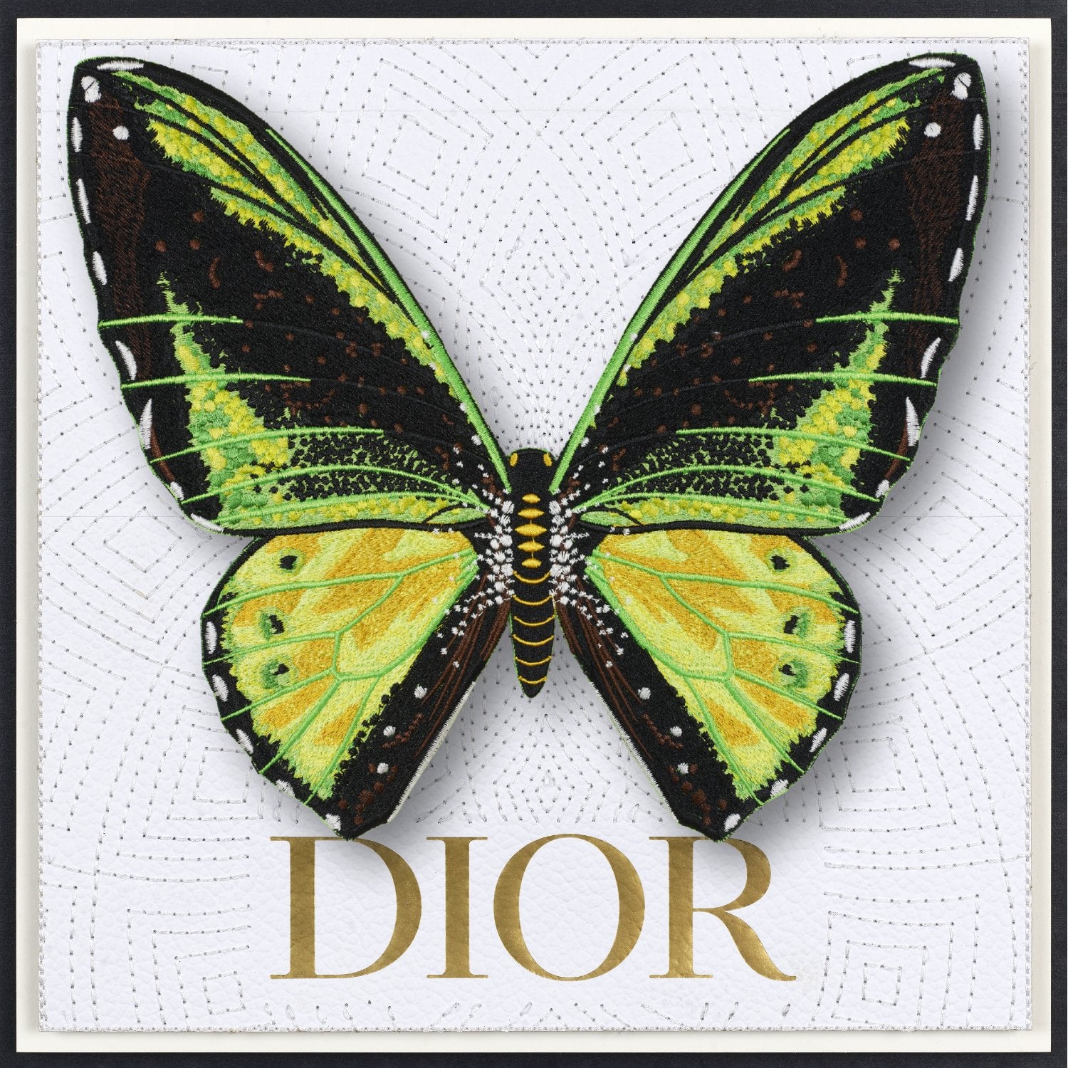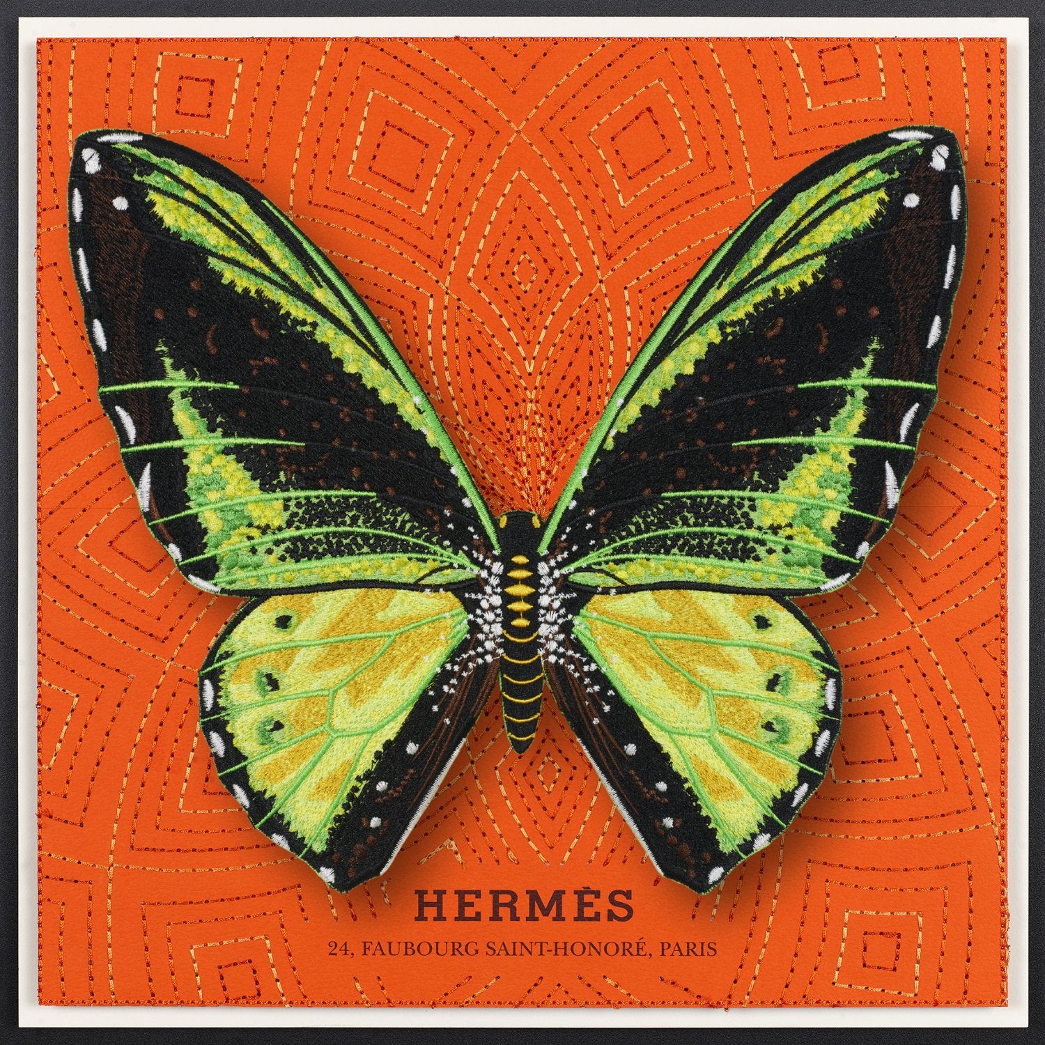 The Butterfly pieces start with up-cycled luxury boxes or shopping bags that are trimmed into the background shape, collaged and then embroidered. The embroidery is stitched directly through the actual box itself. Each background features intricate embroidery stitches that truly make each one unique. Once the background is complete it is padded and mounted. The butterfly is embroidered with ver 150,000 stitches. Once embroidered are hand trimmed and mounted in relief over the background.