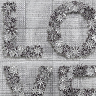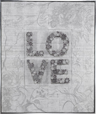The background is embroidered quilted fabric that is painted. The love letters are created with hundreds of embroidered flowers mounted in relief.