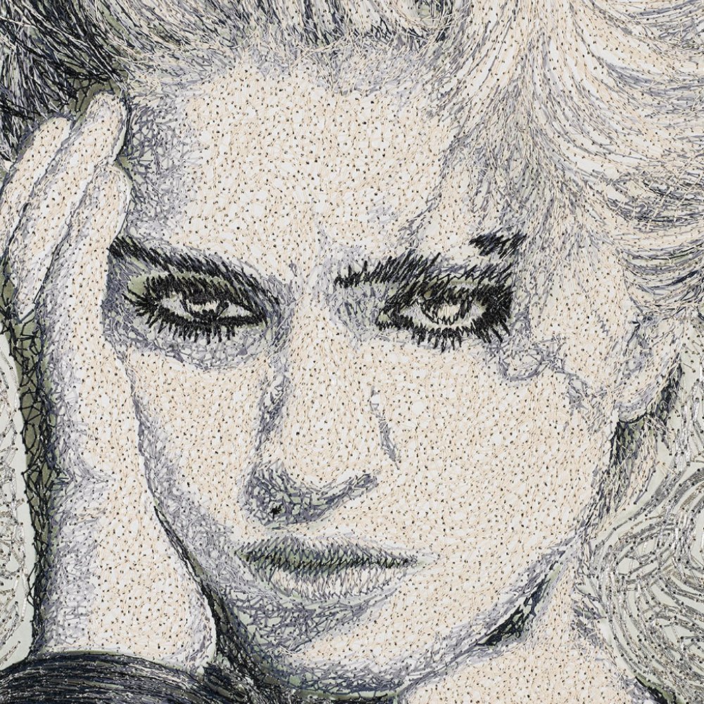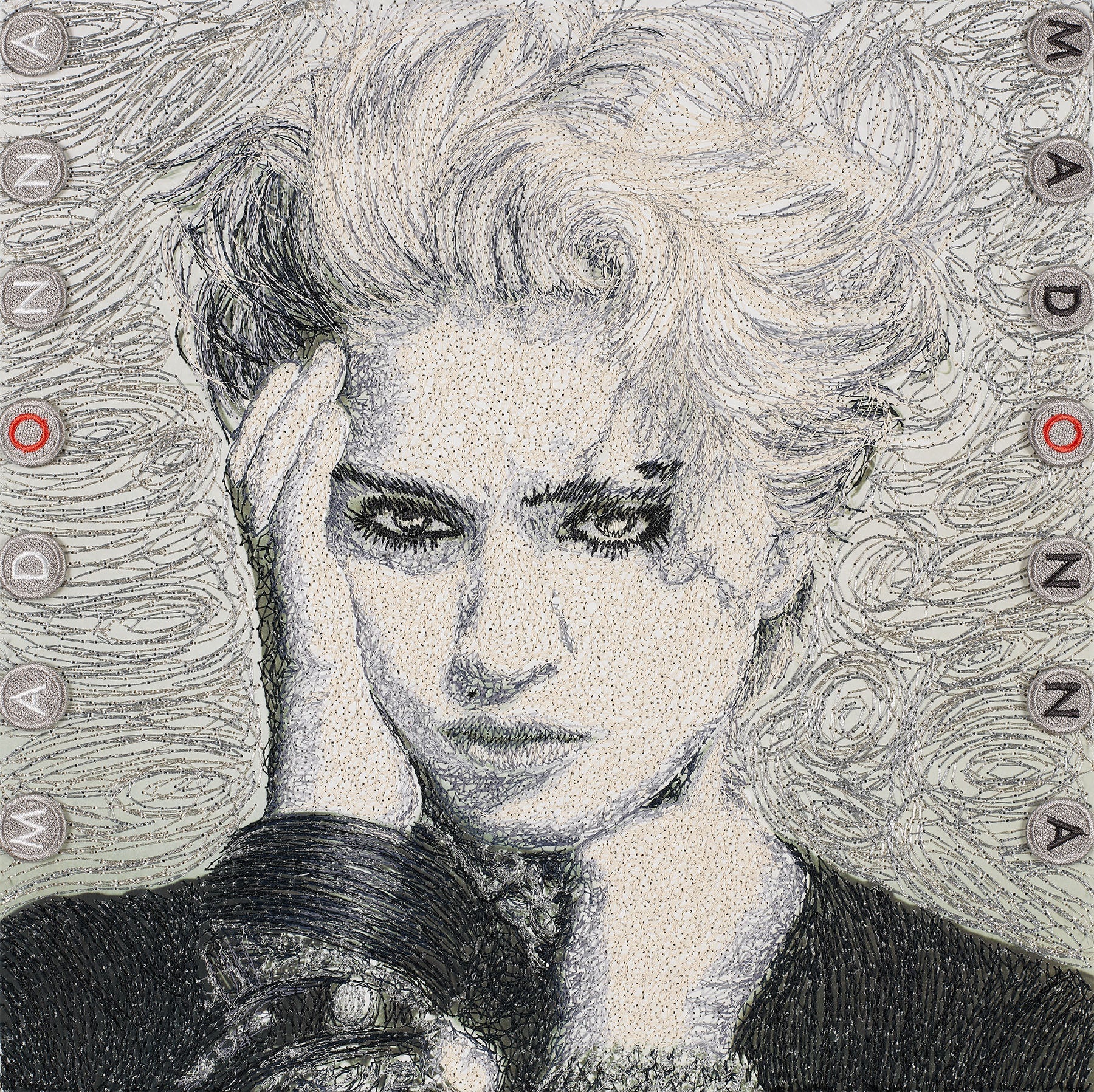 Released in 1983, Madonna's debut album changed everything. With singles like “Borderline, Lucky Star, Holiday and Everybody” the album was immediately a success and eventually sold over 10,000,000 copies. When this album was released I think it changed the way people listened to music. MTV had just started and videos became just as important as the music itself and Madonna was an early innovator of this relatively new medium. Madonna changed the way we processed music, with her it became a lifestyle. I remember being a young teenager when this was released and seeing girls in my school emulate Madonna, with hairstyles, jewelry and attitude. The album cover features a photograph of Madonna with her signature 80’s hairstyle wearing a lot of silver, leather, and rubber jewelry. I knew this was going to be a tricky album to create since it is not only in black and white but the tone is very light. Embroidering light tones is tricky since light colors blend together much easier than darker colors. I started by stitching the background in two shades of metallic thread stitched in long sweeping lines. I stitched Madonna using a mixture of super flat polyester thread, rayon thread and metallic thread. Instead of stitching light to dark as I usually do I started by stitching dark to light and then dark again. There is a lot of very dense, small stitching on the face which was essential to creating this portrait.