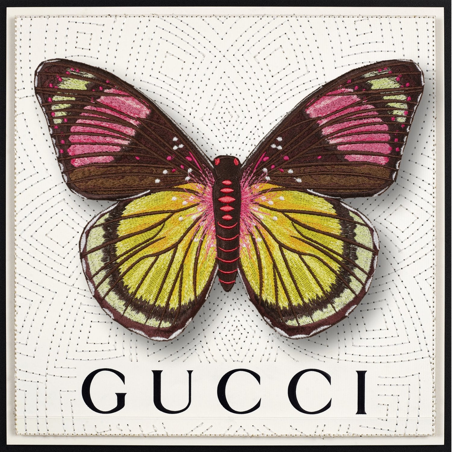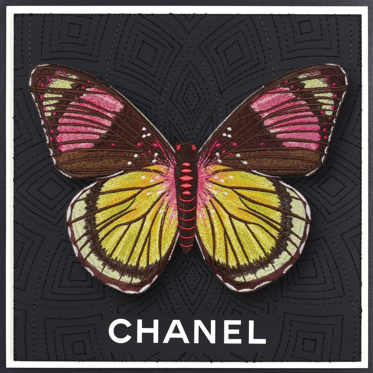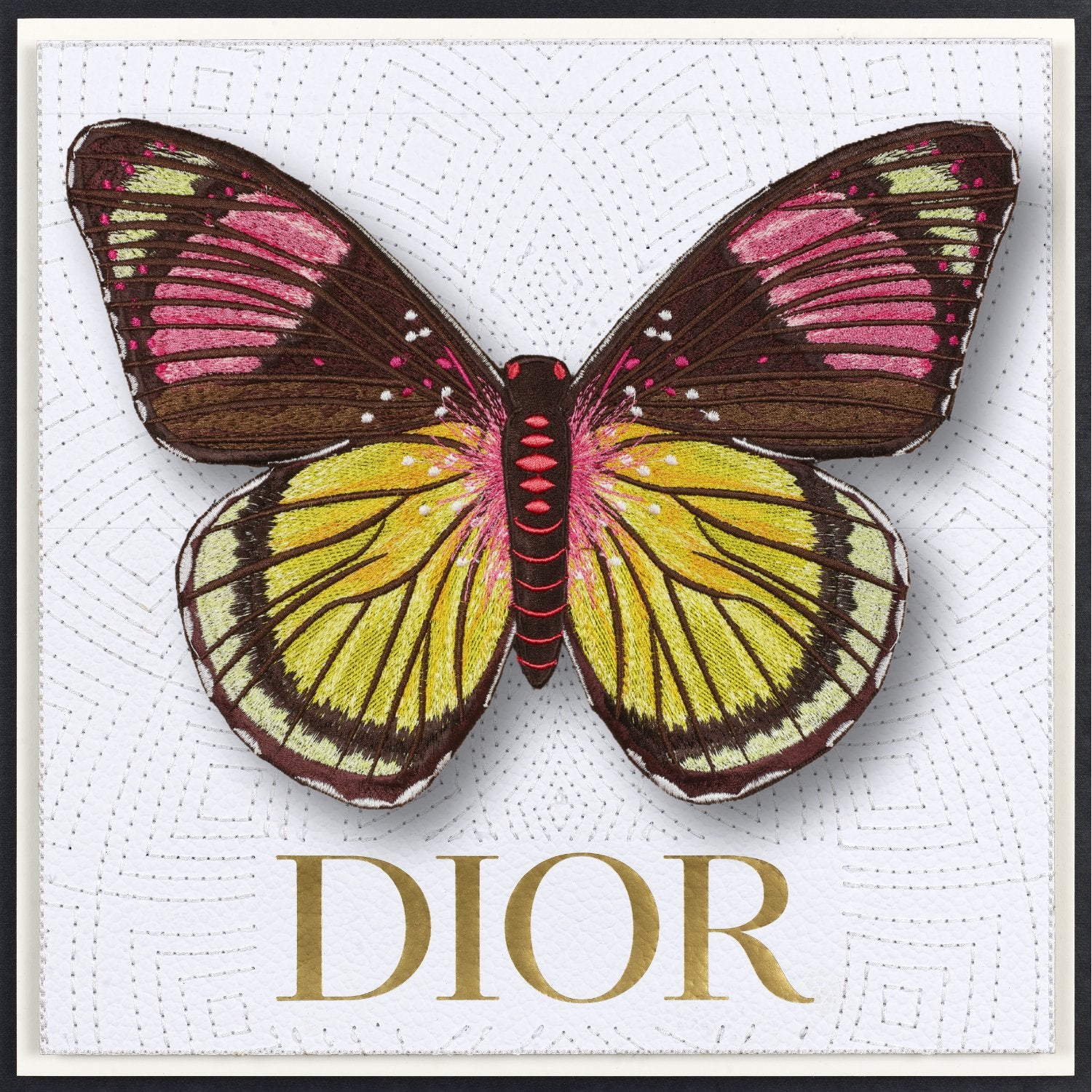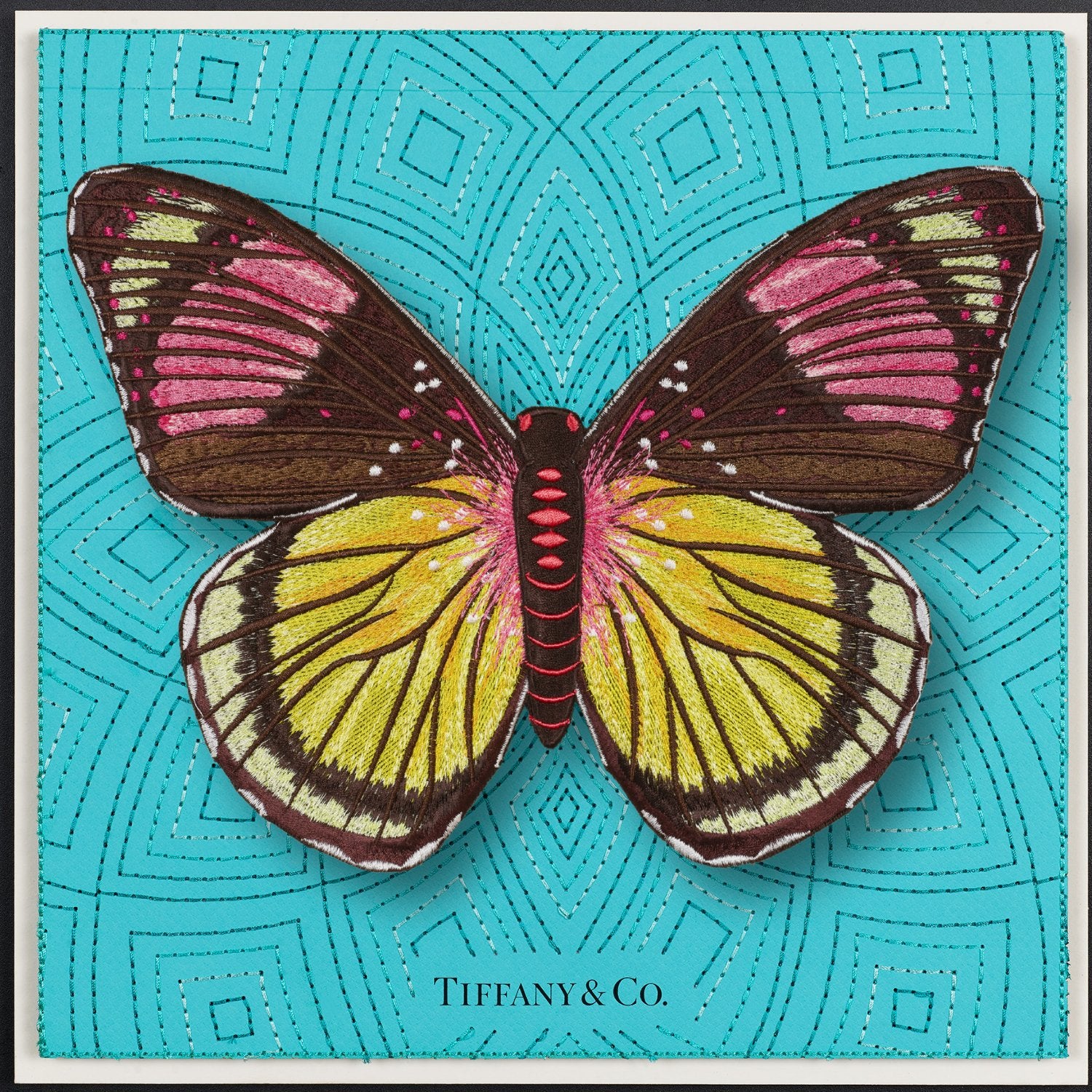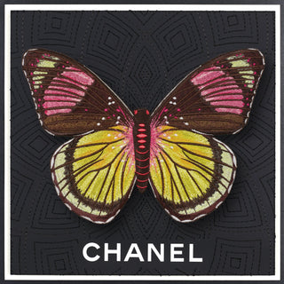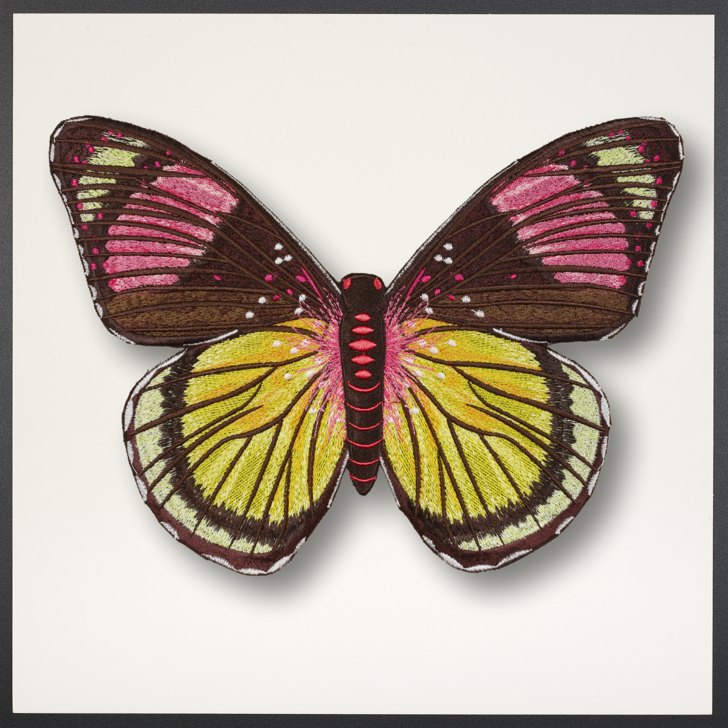 The Butterfly pieces start with up-cycled luxury boxes or shopping bags that are trimmed into the background shape, collaged and then embroidered. The embroidery is stitched directly through the actual box itself. Each background features intricate embroidery stitches that truly make each one unique. Once the background is complete it is padded and mounted. The butterfly is embroidered with ver 150,000 stitches. Once embroidered are hand trimmed and mounted in relief over the background.