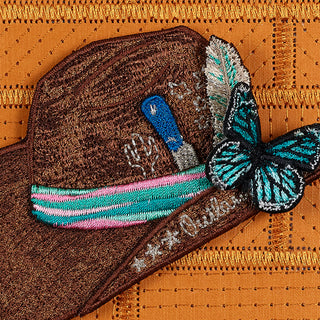 Western designs have always been part of the Studio vibe. The landscapes and iconography of cowboys, horses and Americana have been an inspiration since Stephen created his Americana series in 2018. The petites feature icons, horses, cacti and many other symbols created with yarn, embroidery and appliqué. The pieces all start with up-cycled luxury boxes or shopping bags that are trimmed into the background shape, collaged and then embroidered. The embroidery is stitched directly through the actual box itself. Each petite features intricate embroidery stitches that truly make each one unique. The western icons are then added in relief on the background truly making a three dimensional piece.