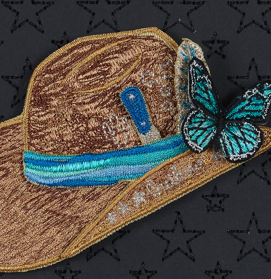 Western designs have always been part of the Studio vibe. The landscapes and iconography of cowboys, horses and Americana have been an inspiration since Stephen created his Americana series in 2018. The petites feature icons, horses, cacti and many other symbols created with yarn, embroidery and appliqué. The pieces all start with up-cycled luxury boxes or shopping bags that are trimmed into the background shape, collaged and then embroidered. The embroidery is stitched directly through the actual box itself. Each petite features intricate embroidery stitches that truly make each one unique. The western icons are then added in relief on the background truly making a three dimensional piece.