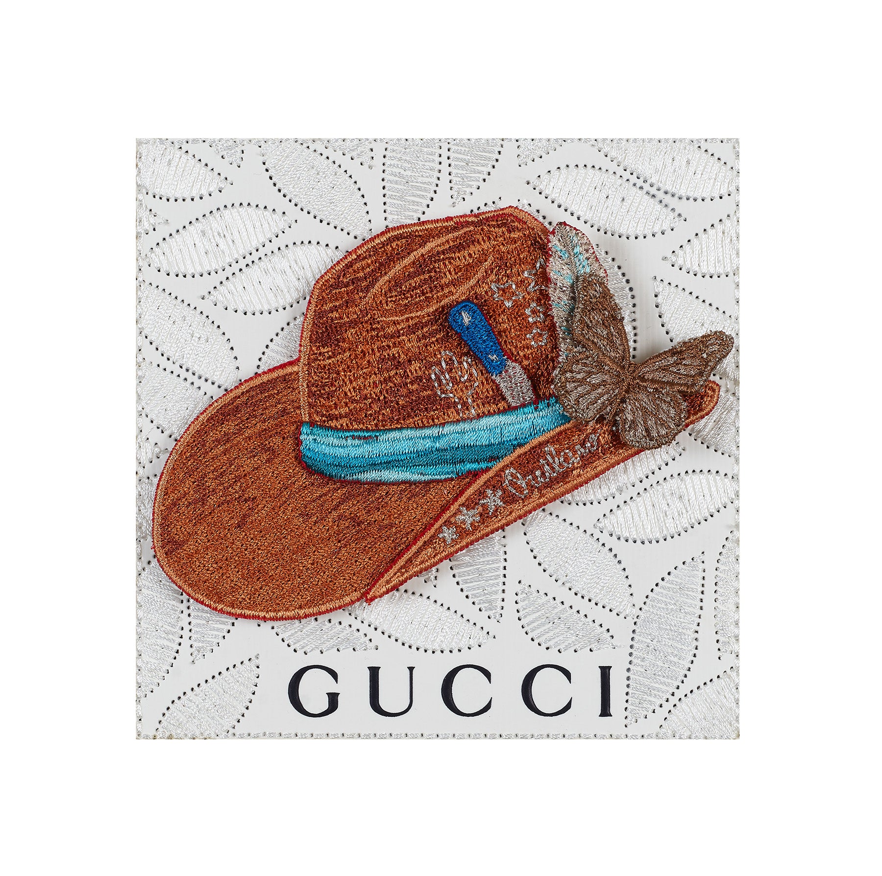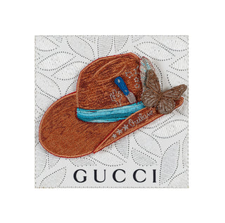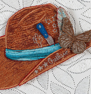 Western designs have always been part of the Studio vibe. The landscapes and iconography of cowboys, horses and Americana have been an inspiration since Stephen created his Americana series in 2018. The petites feature icons, horses, cacti and many other symbols created with yarn, embroidery and appliqué. The pieces all start with up-cycled luxury boxes or shopping bags that are trimmed into the background shape, collaged and then embroidered. The embroidery is stitched directly through the actual box itself. Each petite features intricate embroidery stitches that truly make each one unique. The western icons are then added in relief on the background truly making a three dimensional piece.