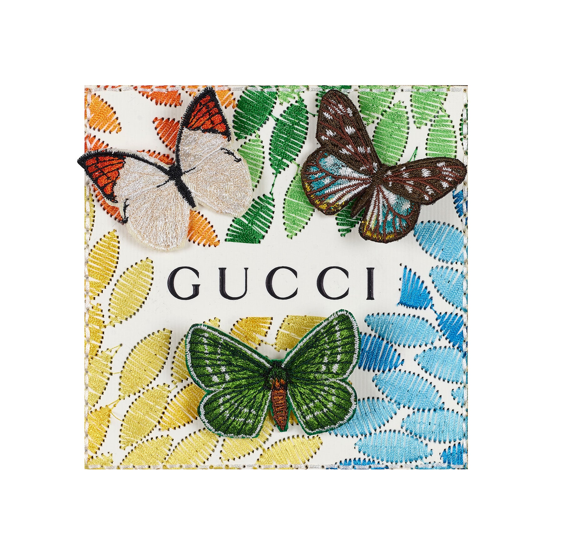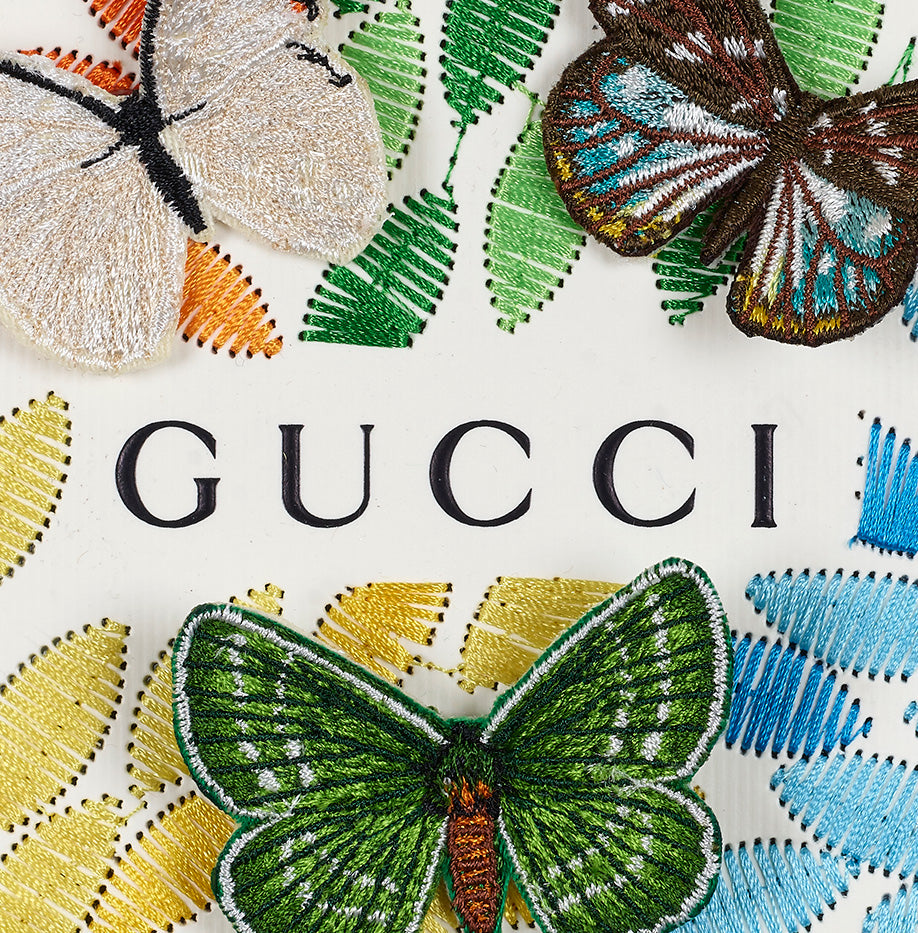 The petite swarms are a signature piece at the studio. They start with up-cycled luxury boxes or shopping bags that are trimmed into the background shape, collaged and then embroidered. The embroidery is stitched directly through the actual box itself. Each petite features intricate embroidery stitches that truly make each one unique. Nice the background is complete it is padded and mounted. The butterflies are all embroidered as well and are hand trimmed in our studio. Each butterfly is mounted in relief on the background for a truly unique, dimensional piece of artwork. The Butterfly Swarm petites would make the perfect gift for any art or fashion lover.