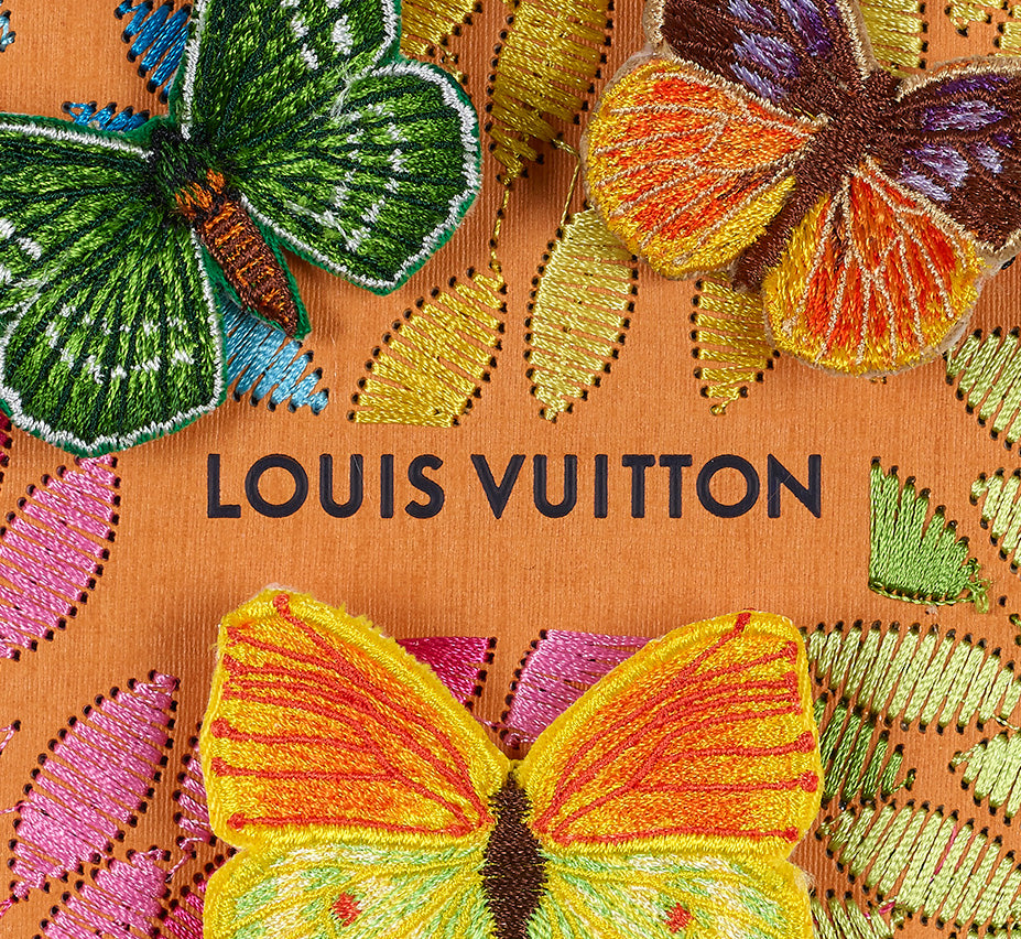 The petite swarms are a signature piece at the studio. They start with up-cycled luxury boxes or shopping bags that are trimmed into the background shape, collaged and then embroidered. The embroidery is stitched directly through the actual box itself. Each petite features intricate embroidery stitches that truly make each one unique. Nice the background is complete it is padded and mounted. The butterflies are all embroidered as well and are hand trimmed in our studio. Each butterfly is mounted in relief on the background for a truly unique, dimensional piece of artwork. The Butterfly Swarm petites would make the perfect gift for any art or fashion lover.