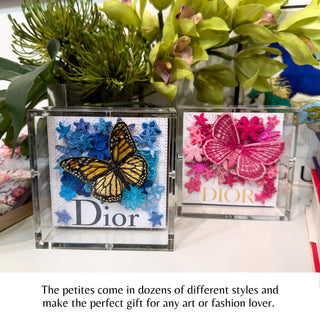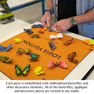 Stephen Wilson expertly crafts extraordinary and timeless designs using sustainable materials. Each art piece embarks on a journey, starting with an up-cycled luxury bag, box, silk scarf, or album. Wilson meticulously creates a bespoke embroidery design, delicately intertwining every stitch by hand. Once the design, colors, and elements are meticulously selected, the artistic process advances to the assembling stage. The boxes and bags undergo a mesmerizing transformation, metamorphosing into captivating canvases for Wilson's creations. The embroidery is seamlessly integrated into the chosen medium, unveiling a captivating texture that breathes life into the artwork. Appliqués, patches, and butterflies are individually stitched out, meticulously crafted, and delicately placed on each piece, culminating in a truly distinctive and unparalleled masterpiece. Finally, each artwork is beautifully presented, encased in an acrylic frame, ready to enchant all who behold it.