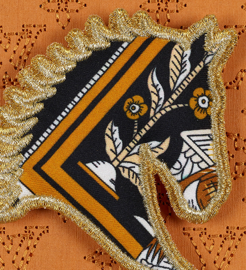 Western designs have always been part of the Studio vibe. The landscapes and iconography of cowboys, horses and Americana have been an inspiration since Stephen created his Americana series in 2018. The petites feature horses, cacti and many other symbols created with yarn, embroidery and appliqué. The pieces all start with up-cycled luxury boxes or shopping bags that are trimmed into the background shape, collaged and then embroidered. The embroidery is stitched directly through the actual box itself. Each petite features intricate embroidery stitches that truly make each one unique. The western icons are then added in relief on the background truly making a three-dimensional piece.