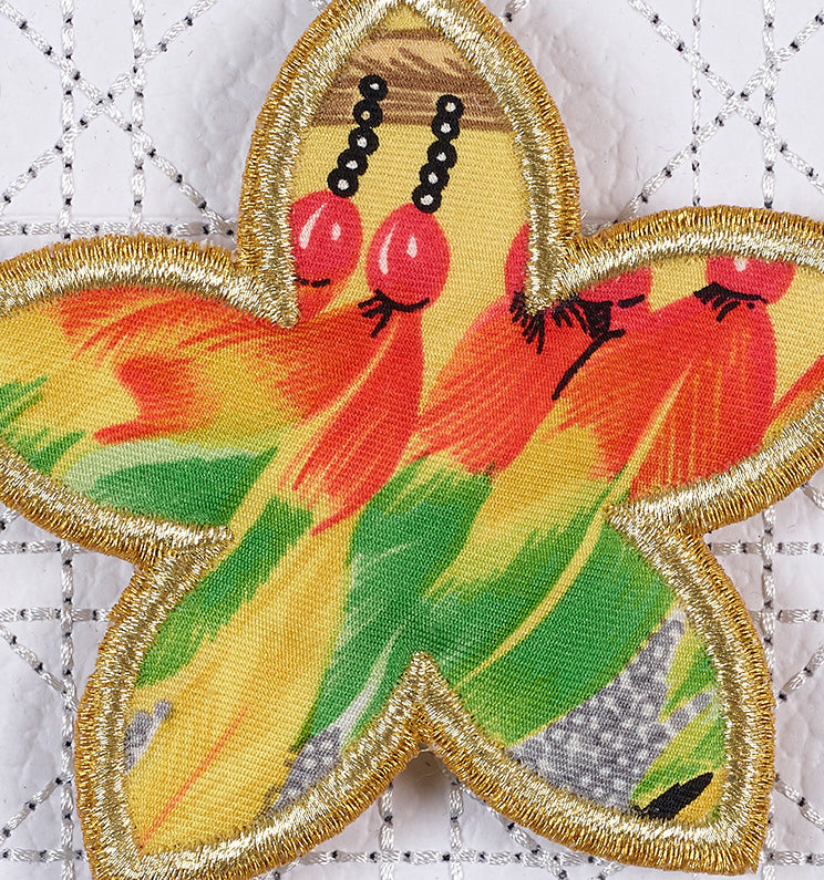 The Icon petites start with up-cycled luxury boxes or shopping bags that are trimmed into the background shape, collaged and then embroidered. The embroidery is stitched directly through the actual box itself. Each petite features intricate embroidery stitches that truly make each one unique. Once the background is complete it is padded and mounted. The icons themselves are embroidered using thread, appliqué or yarn and once embroidered are hand trimmed and mounted in relief over the background. The unique color combinations and textures truly make these pieces stand out.