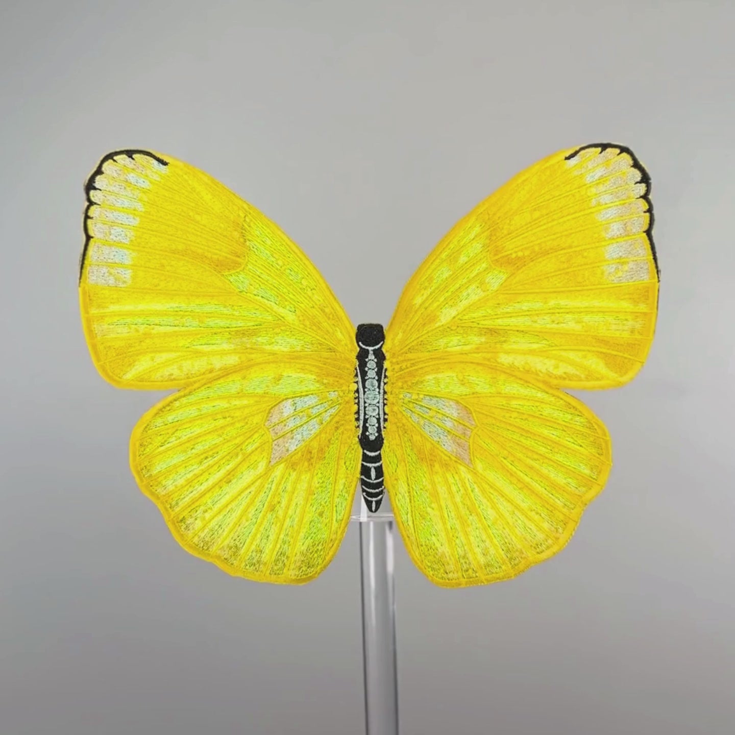 Each butterfly is completely embroidered and hand trimmed in our North Carolina studio. Each of the butterflies were hand digitized created from photographs of butterfly breeds. The larger sizes have over 150,000 stitches and take a fully day to create. Once trimmed the butterflies are mounted on a molded acrylic base.