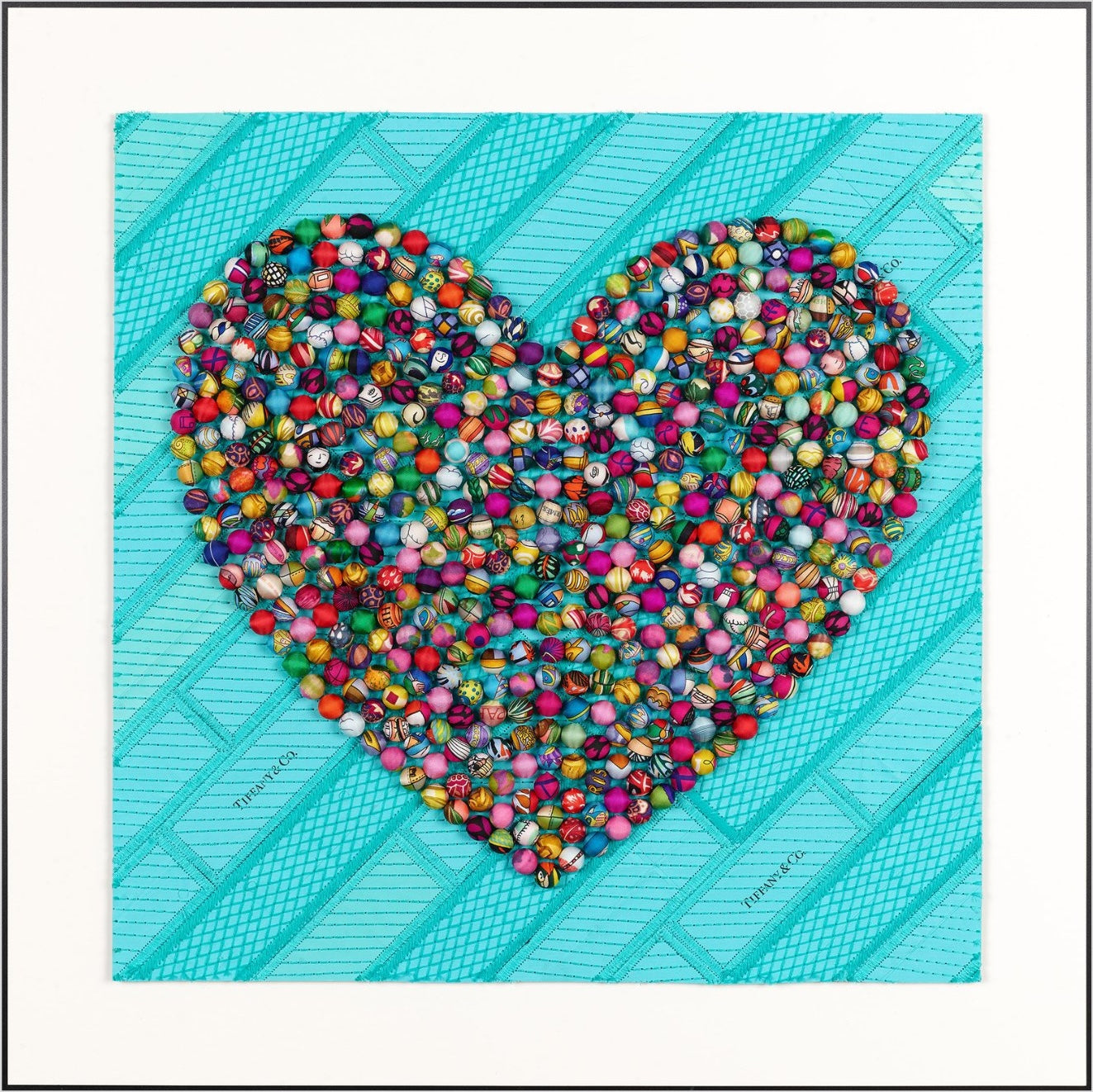 Each pom-pom is carefully crafted from up-cycled luxury scarves, hand selected for their exquisite patterns. Most of the scarves used are remnants from those we use for our silhouette and love pieces. Individually hand-rolled and inserted, these pom poms come together to form a stunning mosaic. Hundreds of these handmade pom poms are required to create each piece, with a range in sizes from 1/2" to 2". The combination of various sizes and scarves creates a truly magical effect.