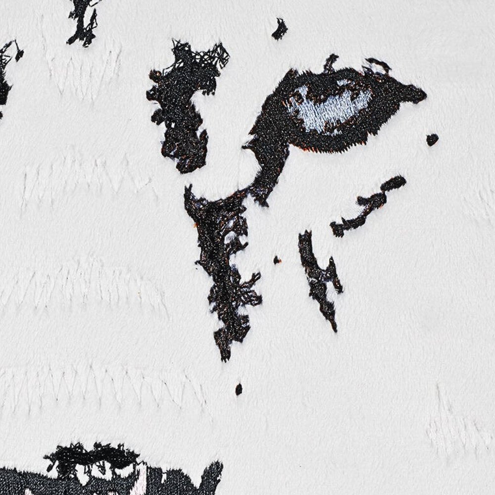 White Lion was an 80’s heavy metal band from NYC that had a string of hit power ballads and melodic songs powered by Vito Bratta’s virtuoso guitar playing. This is their second album that contained the hits “Wait” and ‘When the Children Cry”. The band stuck around until the early 1990’s when grunge changed the music scene and heavy metal became passé. When this album was commissioned and it came into the studio I decided to have fun with it and try something new. The album features a lions face over a stark white background with simple typography denoting the bands name and album title. I decided to appliqué the whole album cover in fake fur. Once I embroidered the fake fur in place I stitched accent stitches around the face and then embroidered all of the details of the face and typography directly through the the fur. The fur adds a lot of texture and dimension to the piece.