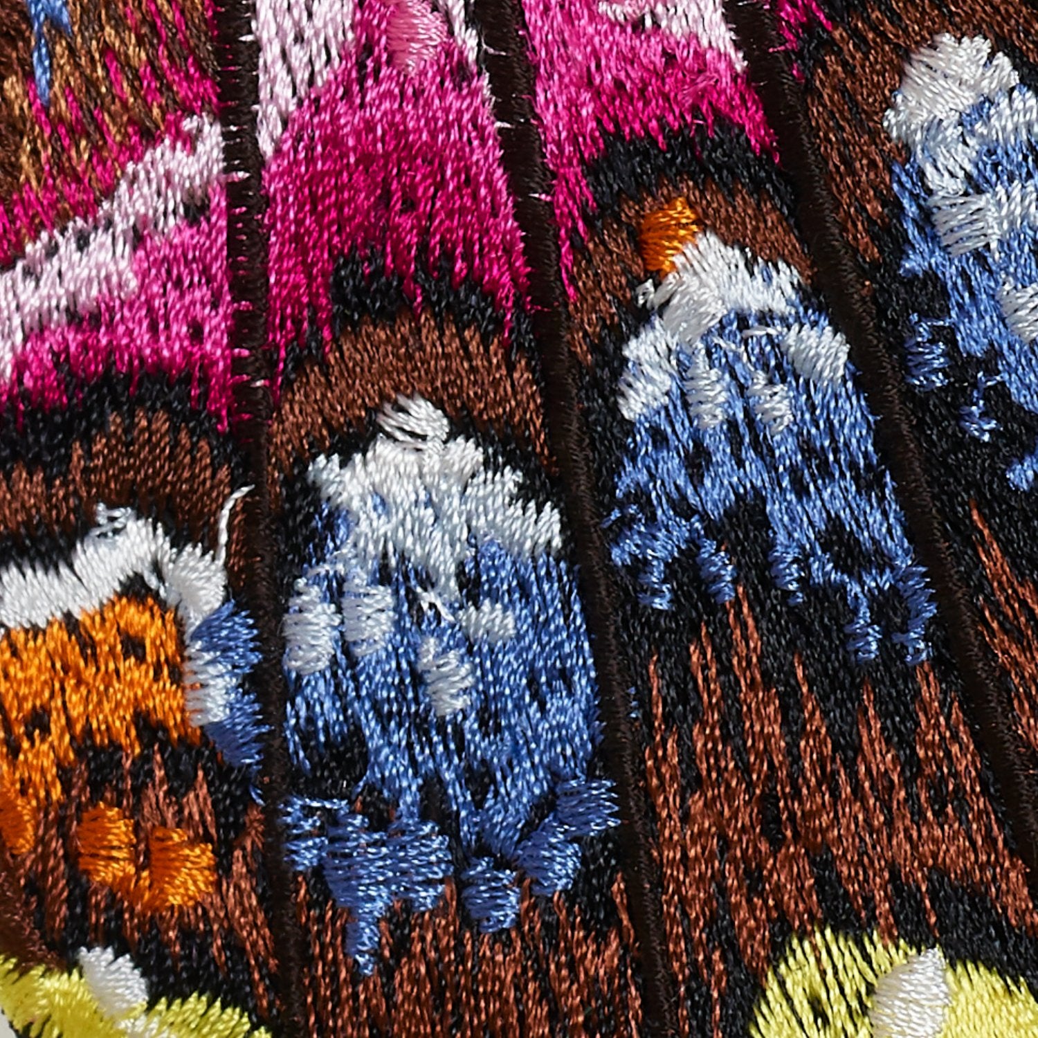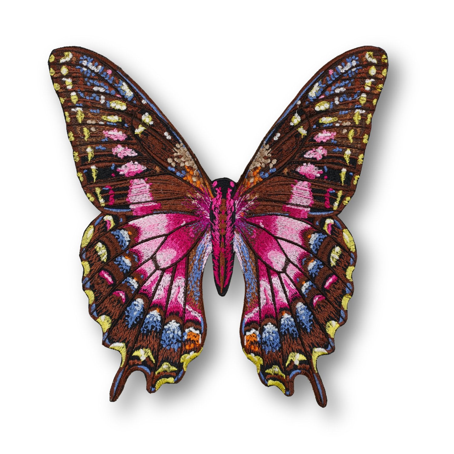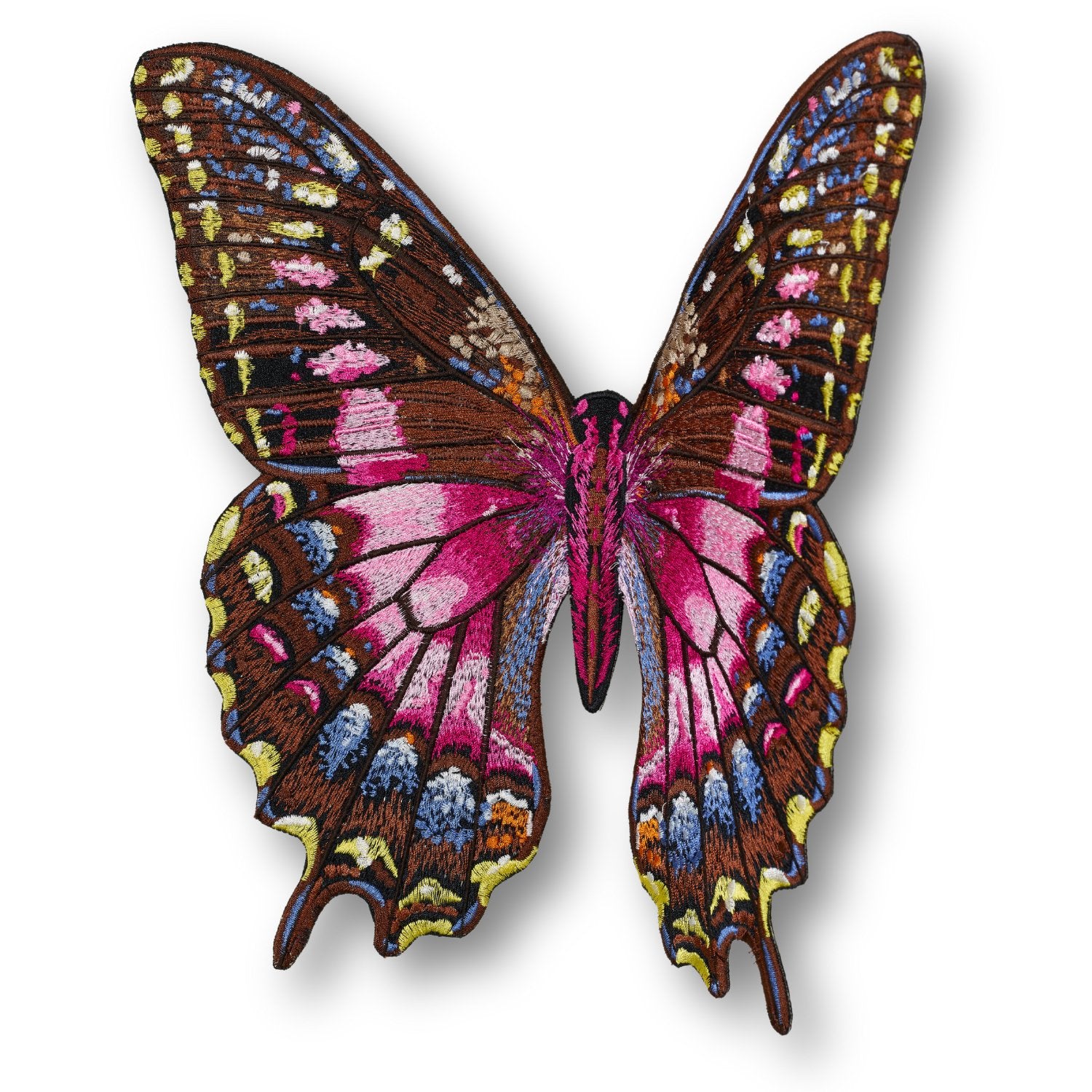 Each butterfly is completely embroidered and hand trimmed in our North Carolina studio. Each of the butterflies were hand digitized created from photographs of butterfly breeds. The larger sizes have over 150,000 stitches and take a fully day to create. Once trimmed the butterflies are mounted on a molded acrylic base.