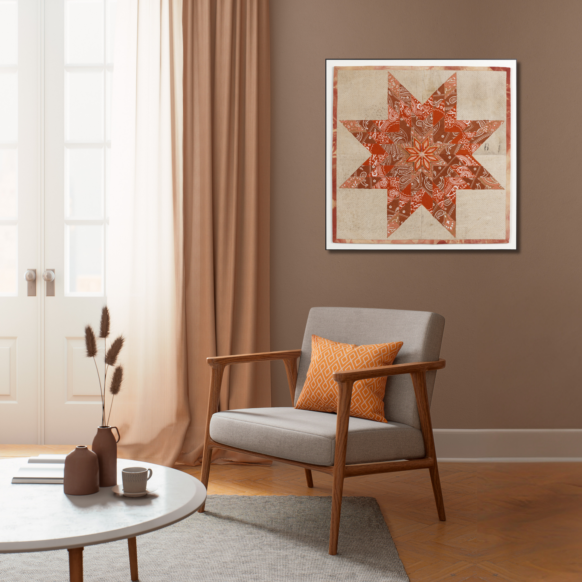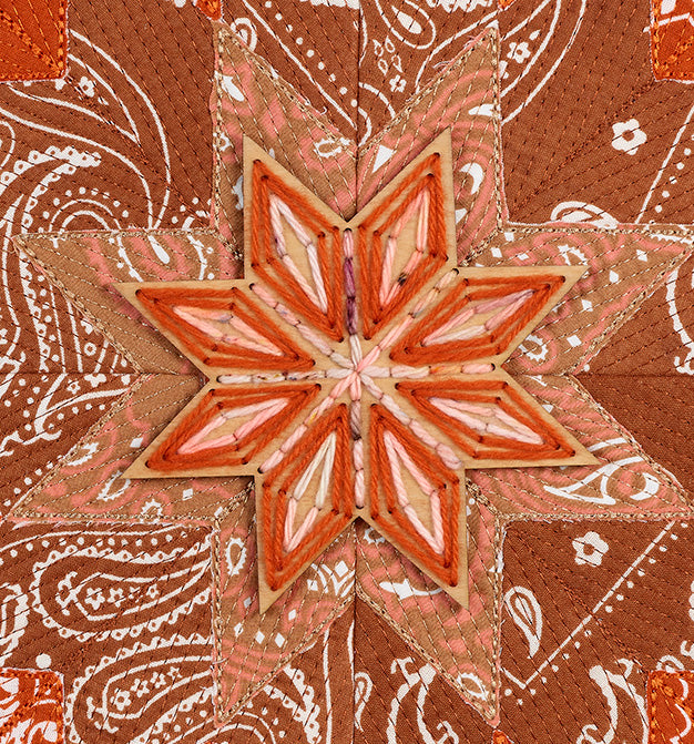 The panels are constructed from a thoughtful mix of upcycled vintage fabrics and hand-dyed bandanas, each piece stitched into place to form a mosaic of history and reinvention. The Ohio Star—one of the most enduring quilt patterns in American design—returns here as a vibrant backdrop. Its radiating geometry frames the central imagery while echoing the spirit of resourcefulness, artistry, and storytelling that defines the quilting tradition.
