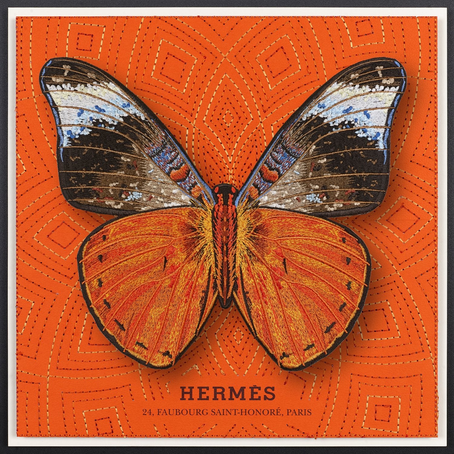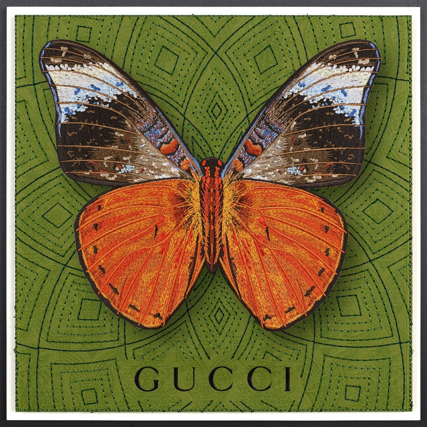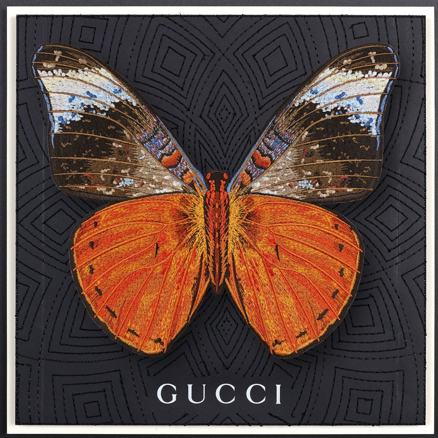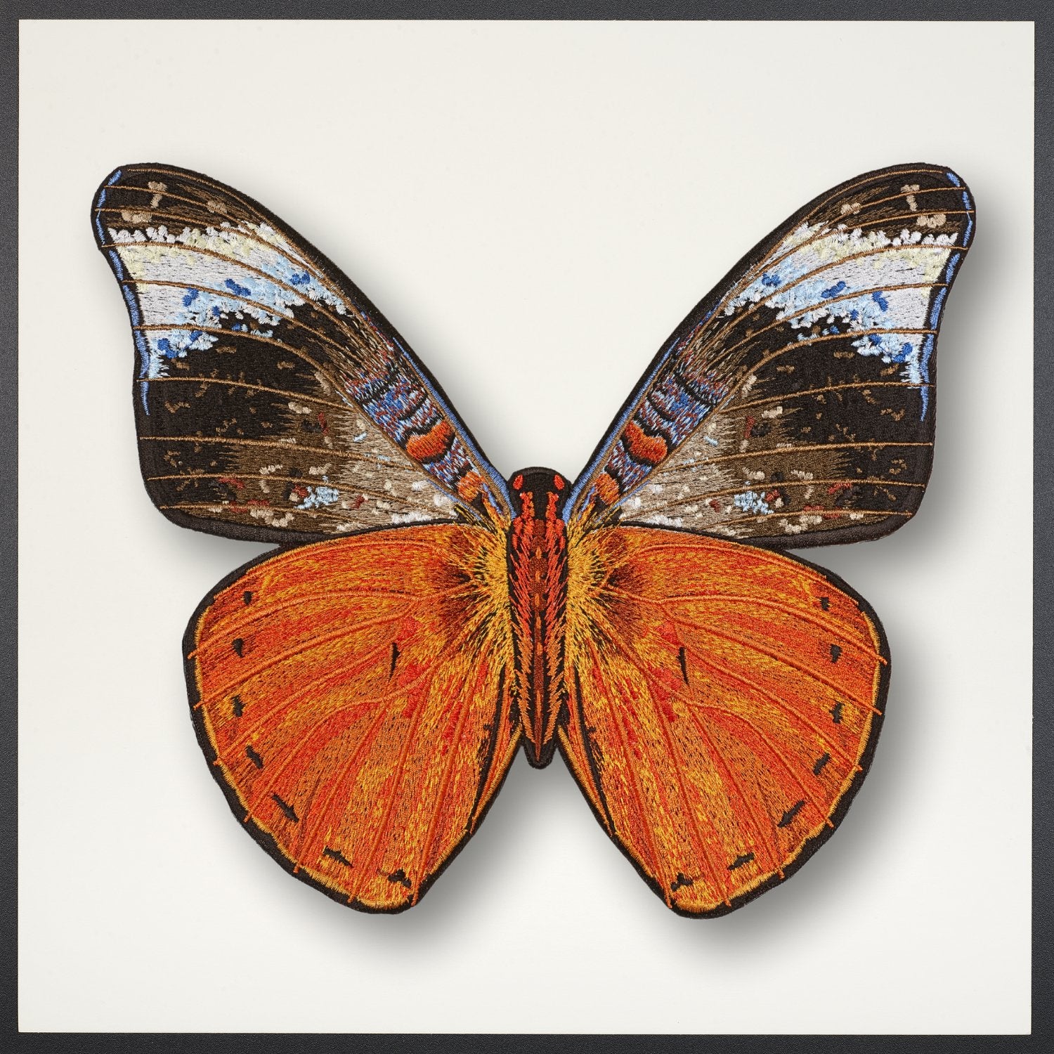 The Butterfly pieces start with up-cycled luxury boxes or shopping bags that are trimmed into the background shape, collaged and then embroidered. The embroidery is stitched directly through the actual box itself. Each background features intricate embroidery stitches that truly make each one unique. Once the background is complete it is padded and mounted. The butterfly is embroidered with ver 150,000 stitches. Once embroidered are hand trimmed and mounted in relief over the background.