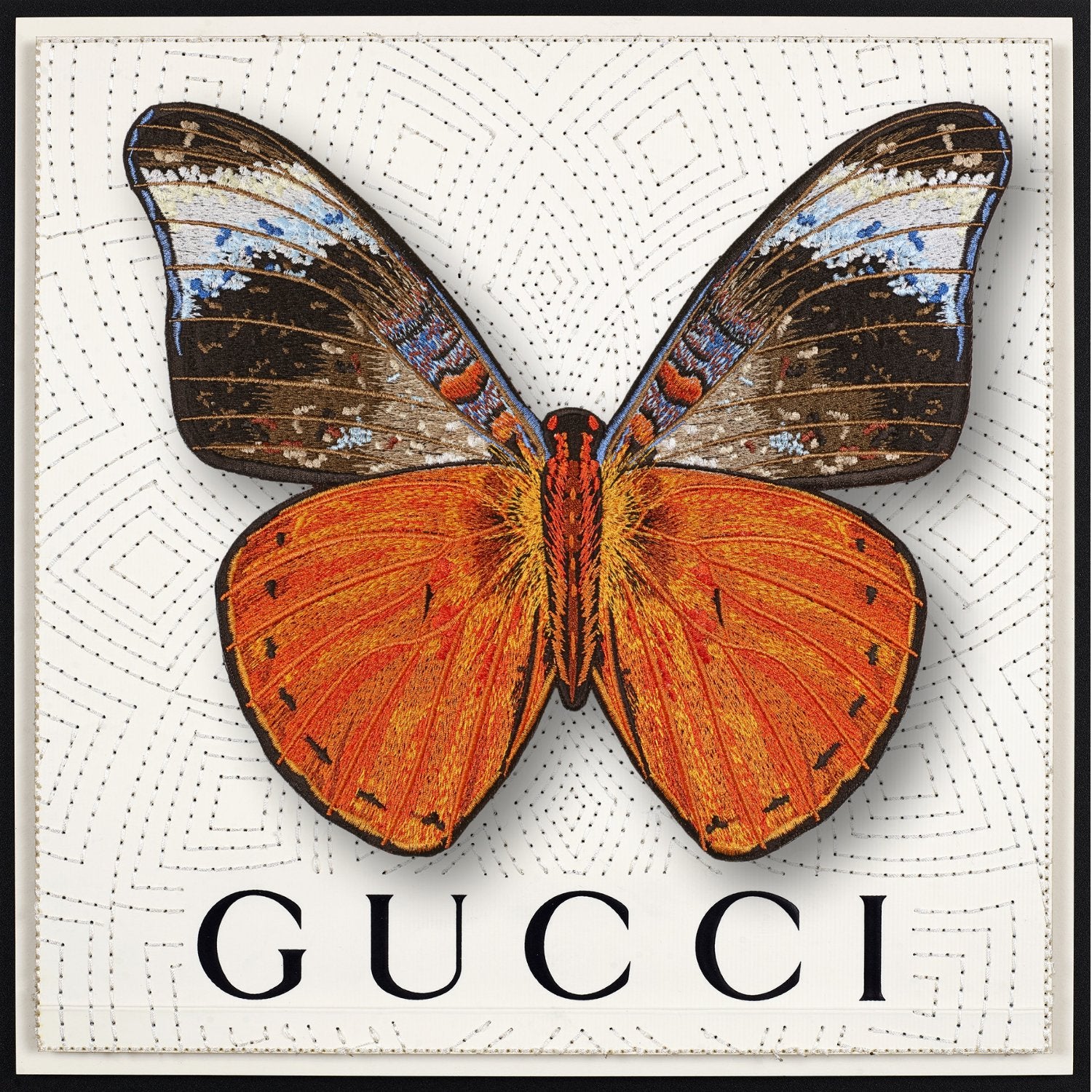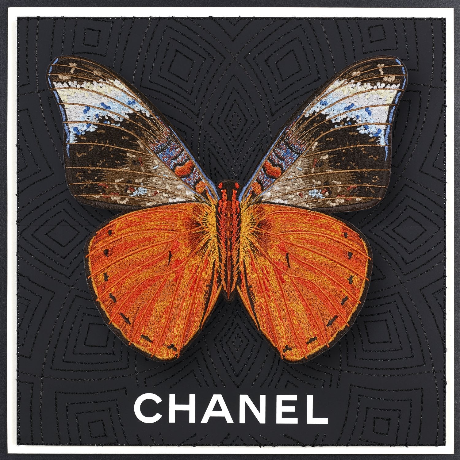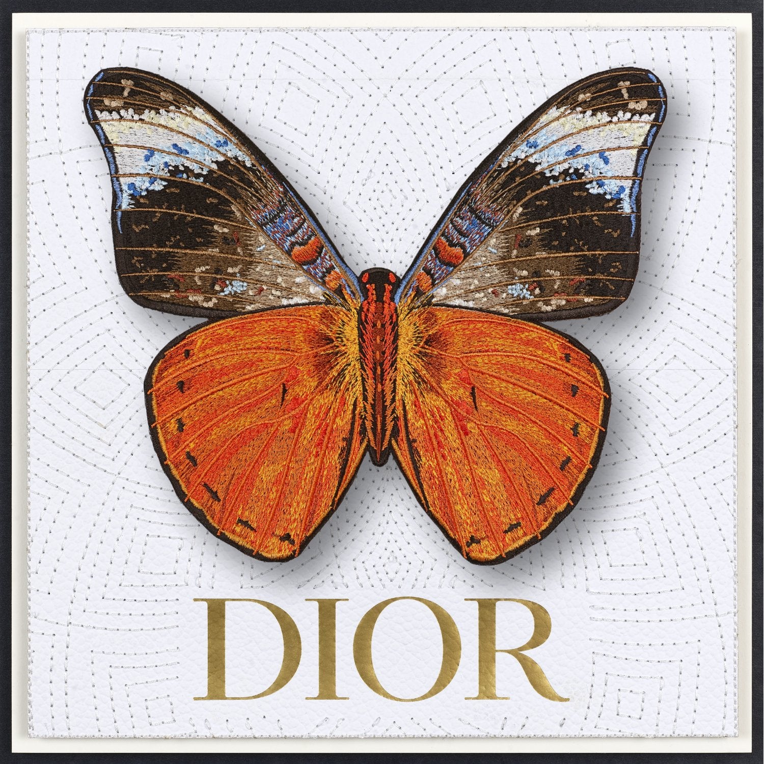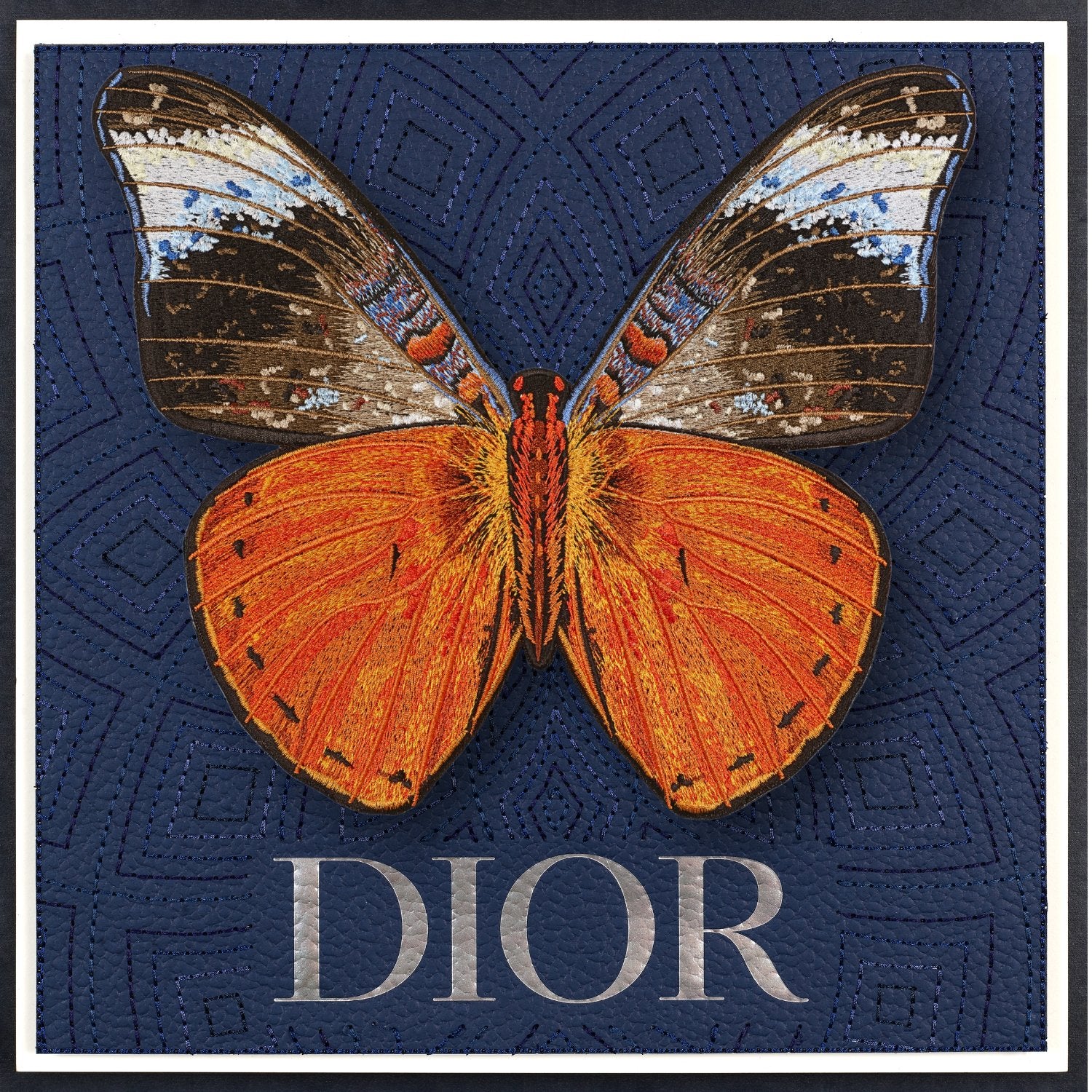 The Butterfly pieces start with up-cycled luxury boxes or shopping bags that are trimmed into the background shape, collaged and then embroidered. The embroidery is stitched directly through the actual box itself. Each background features intricate embroidery stitches that truly make each one unique. Once the background is complete it is padded and mounted. The butterfly is embroidered with ver 150,000 stitches. Once embroidered are hand trimmed and mounted in relief over the background.
