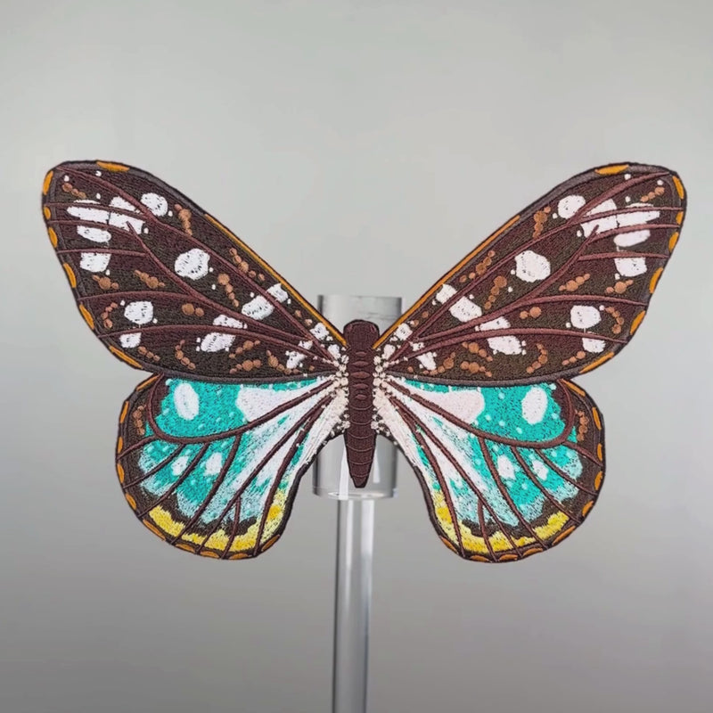 Each butterfly is completely embroidered and hand trimmed in our North Carolina studio. Each of the butterflies were hand digitized created from photographs of butterfly breeds. The larger sizes have over 150,000 stitches and take a fully day to create. Once trimmed the butterflies are mounted on a molded acrylic base.
