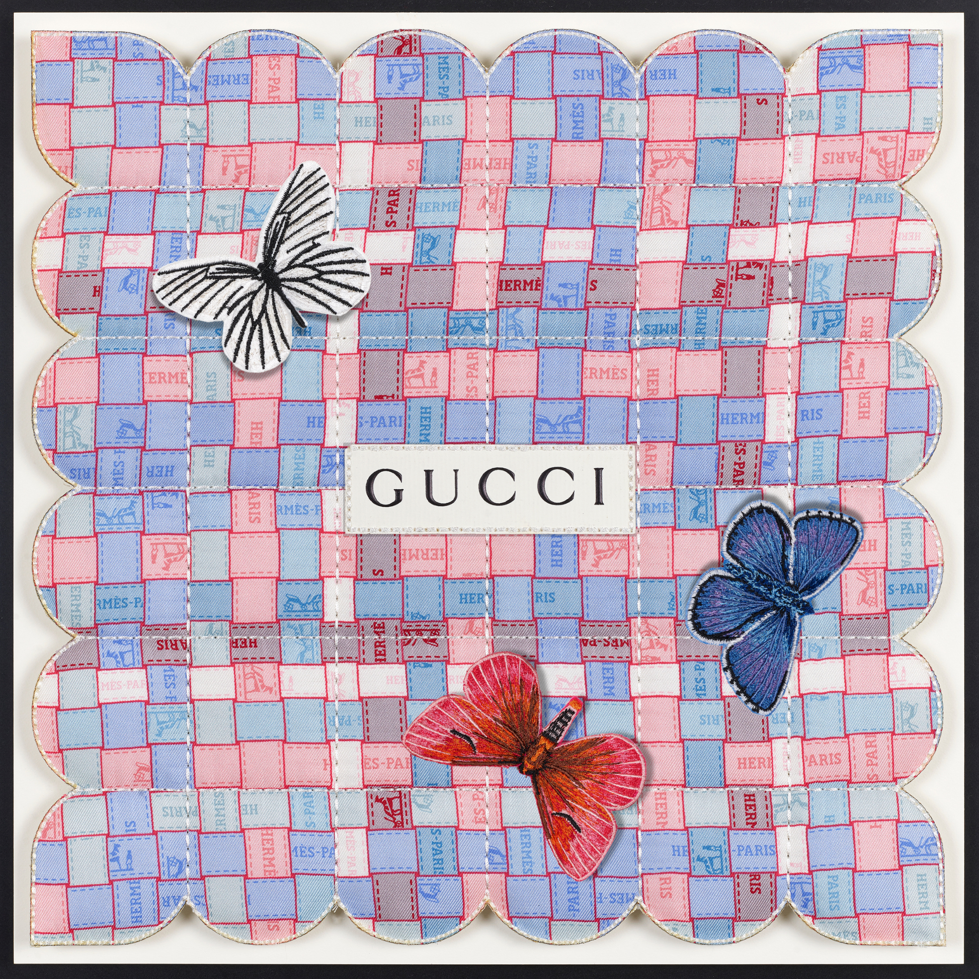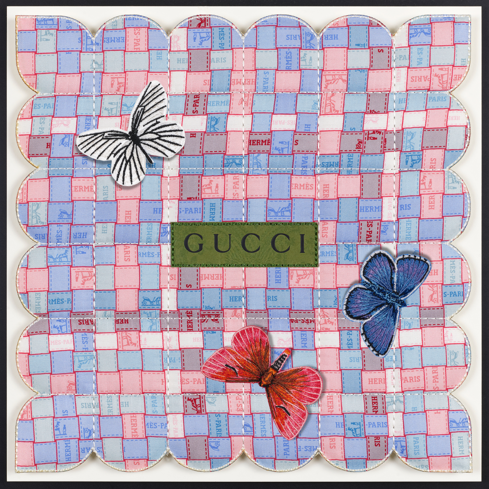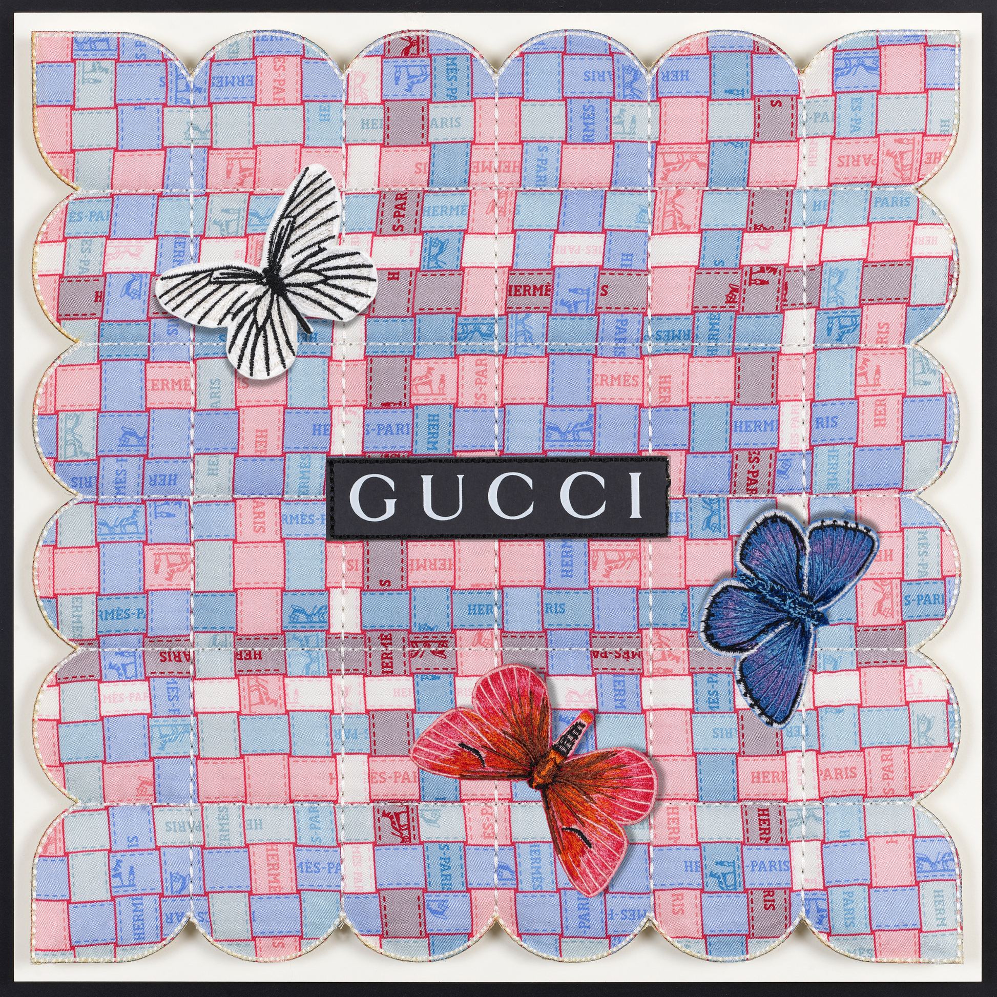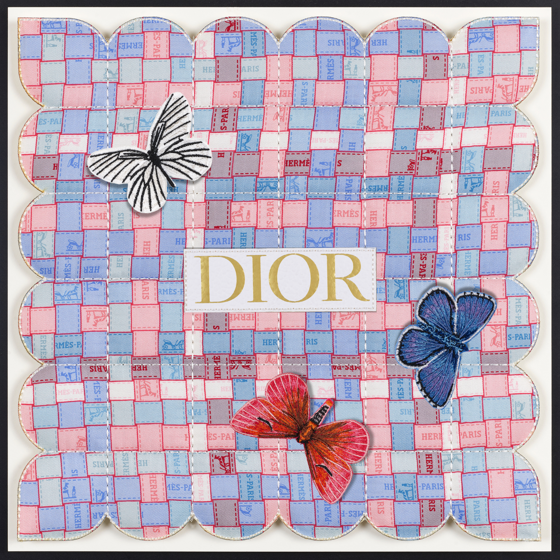 In a fascinating twist, the tapestries are also enhanced with thoughtfully selected up-cycled luxury packaging, merging high fashion with eco-conscious design. Delicate embroidered butterflies flutter gracefully across the surface, introducing an enchanting three-dimensional element that brings each piece to life. Every tapestry tells a distinct story, reflecting not only the beauty of the materials but also the thoughtful craftsmanship behind it. Due to their unique combinations and individual designs, these pieces are genuinely one of a kind, making them treasured works of art that resonate with both style and sustainability. Each tapestry serves as a testament to the innovative potential of up-cycling, inviting viewers to appreciate the intricate balance between luxury and environmental responsibility.